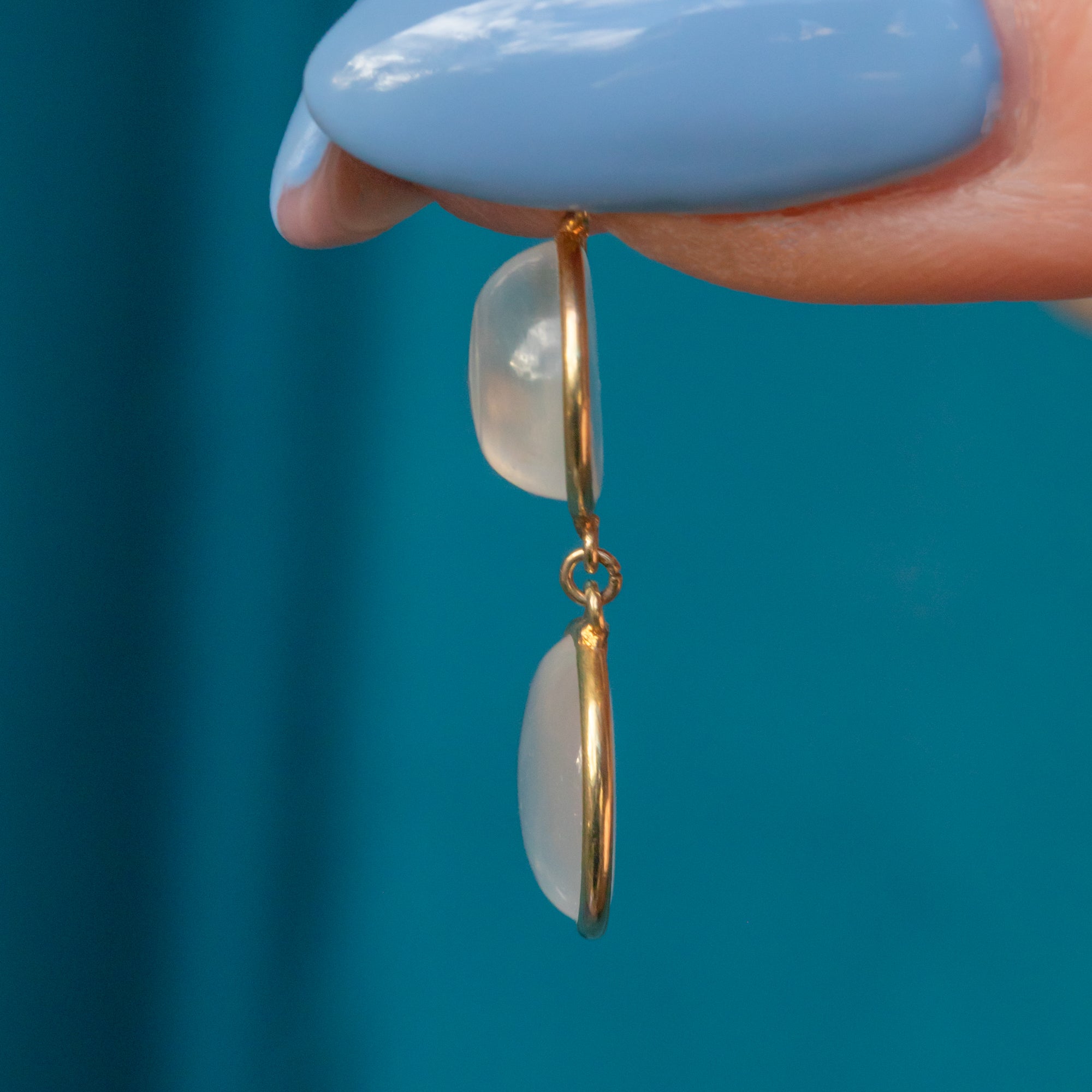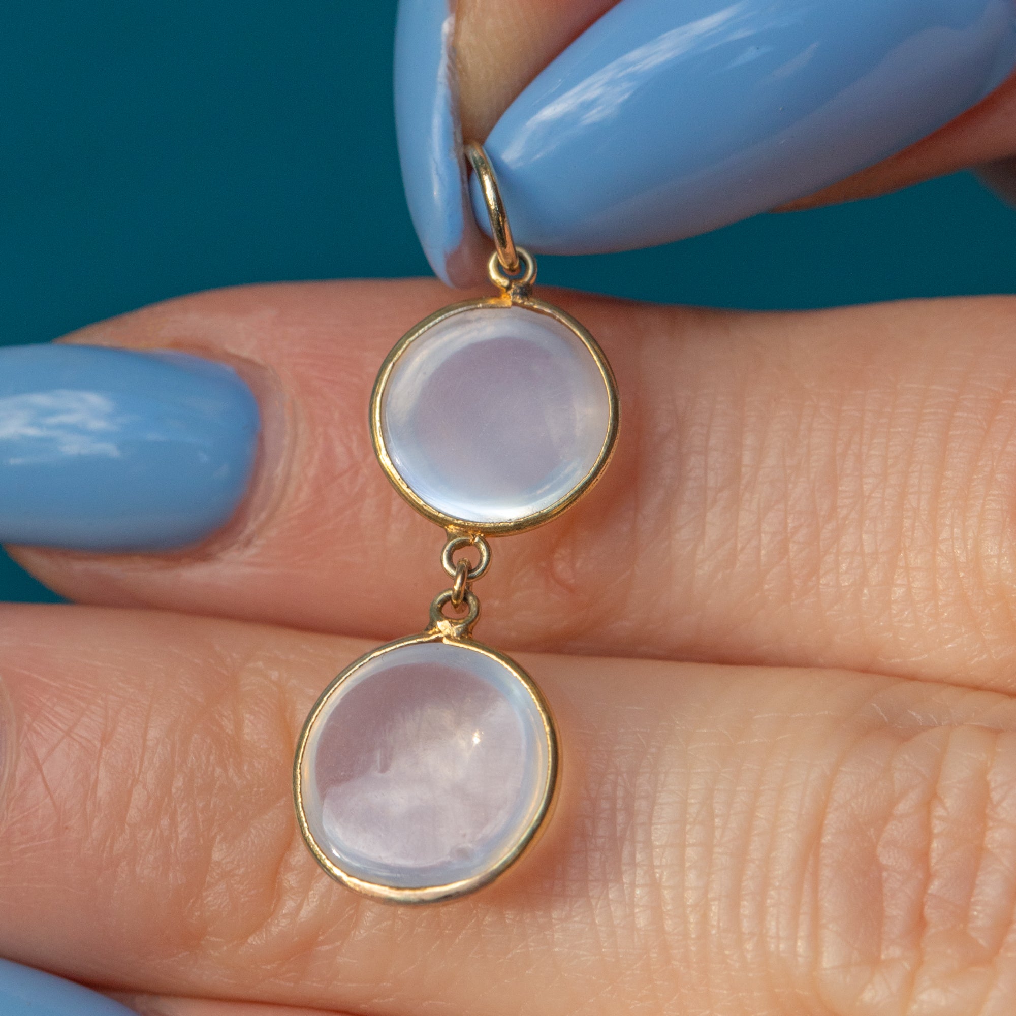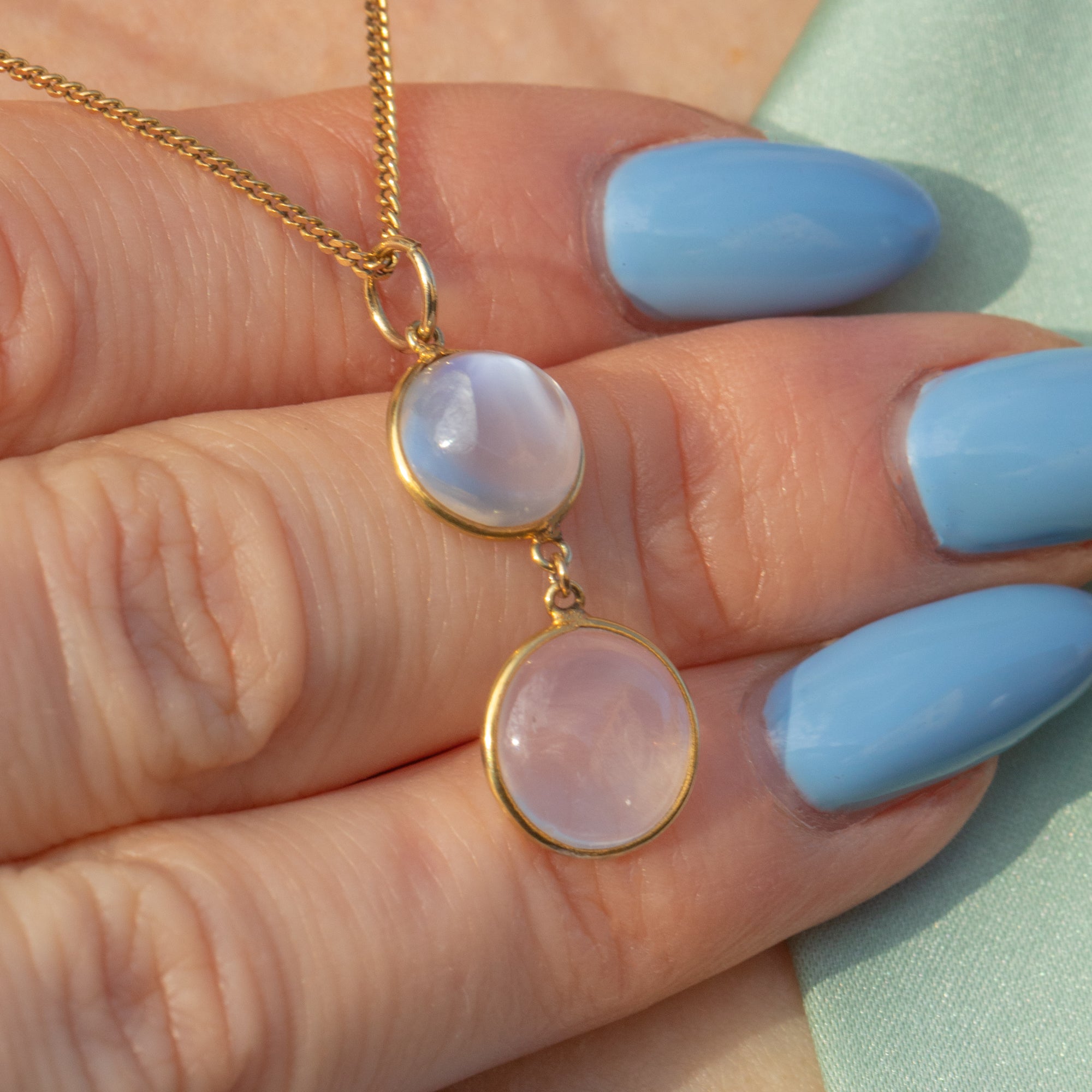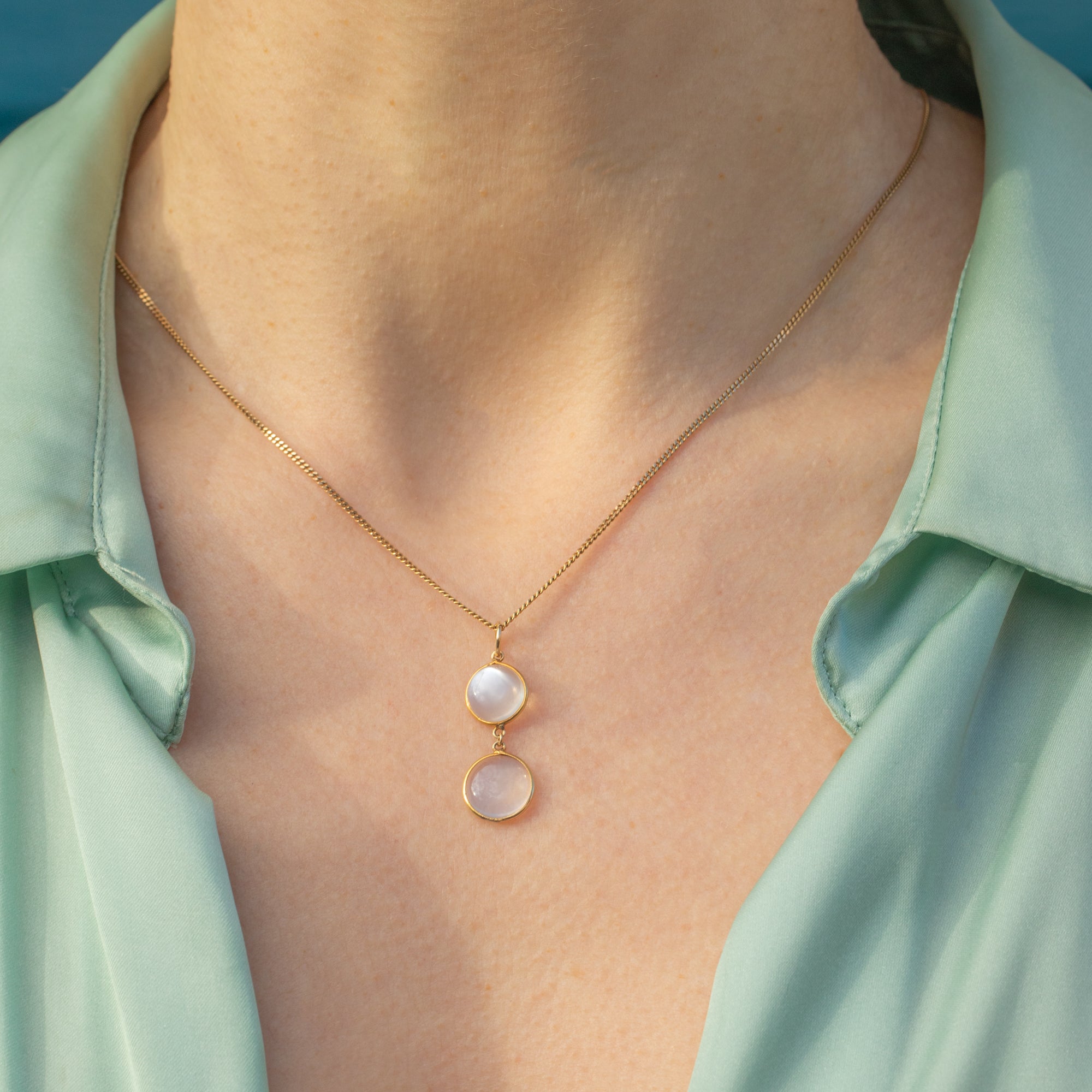 This antique 9ct Gold Moonstone cabochon drop pendant is a magical piece to add to your collection! The Moonstones possess a perfectly ethereal blue-violet schiller, encased in warm 9ct Gold bezel settings.