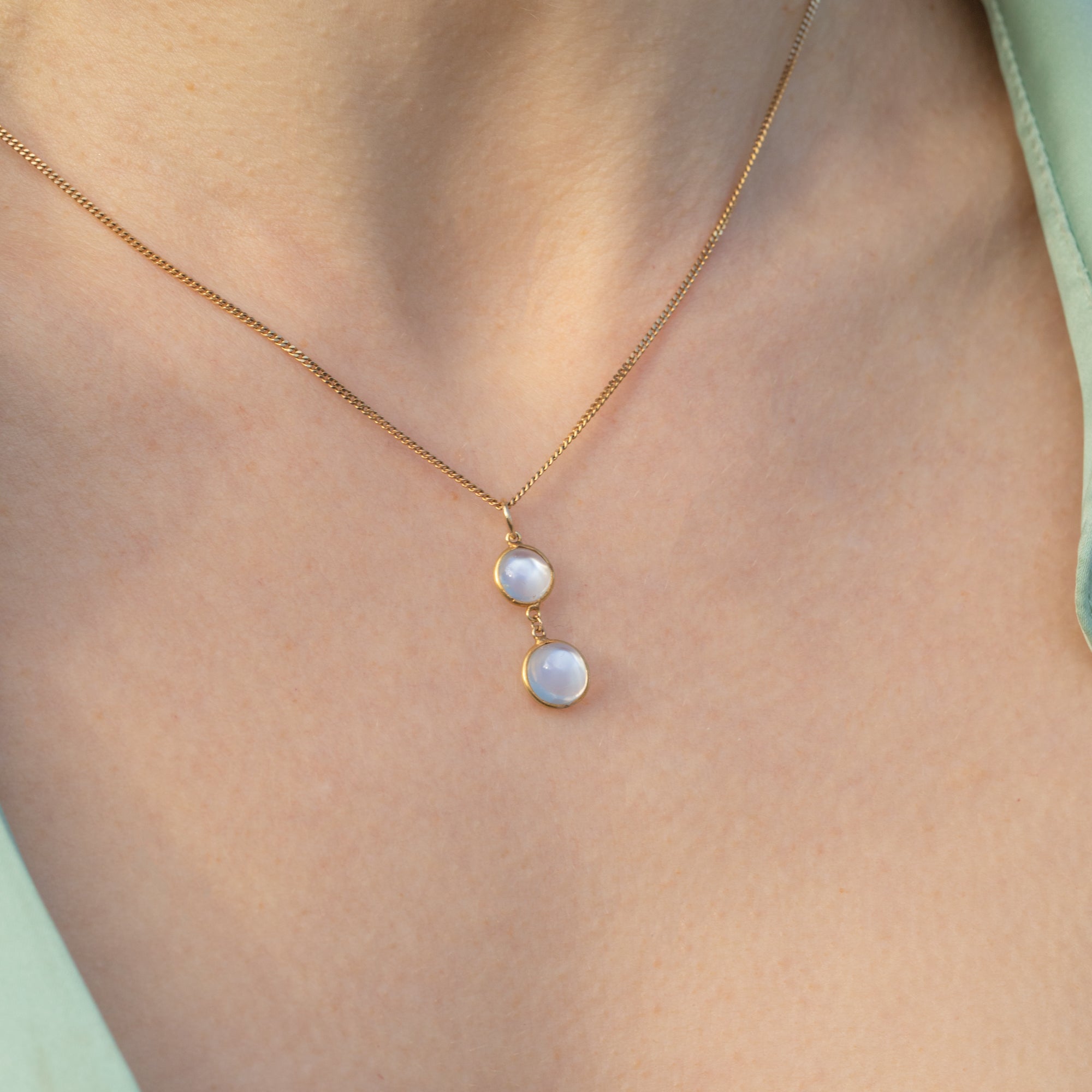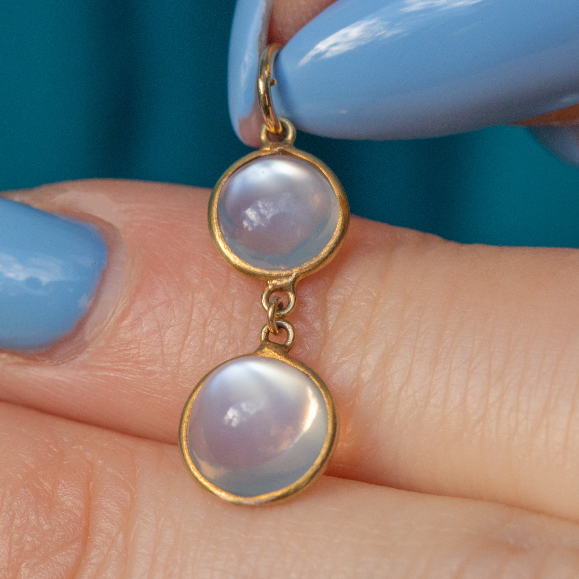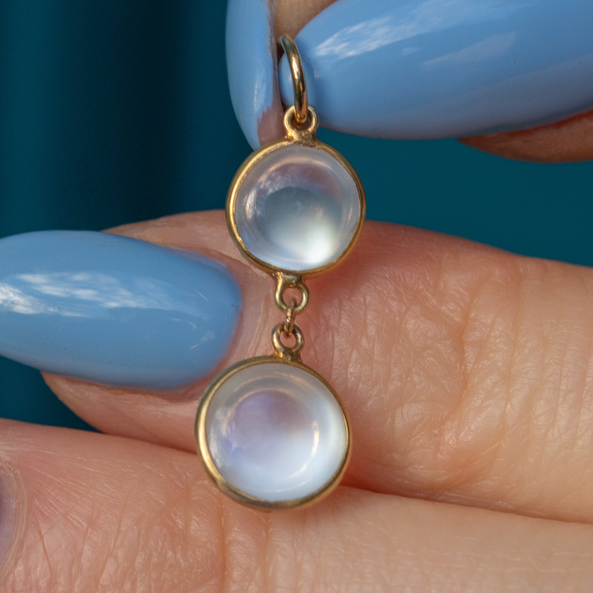 EXCELLENT. This antique 9ct Gold Moonstone cabochon double drop pendant is in excellent condition. The Moonstones are perfectly smooth and free from surface wear, both securely held within their bezel settings. The Gold is bright and the generously sized jump ring will allow you to suspend this antique Moonstone pendant from a chain with ease!