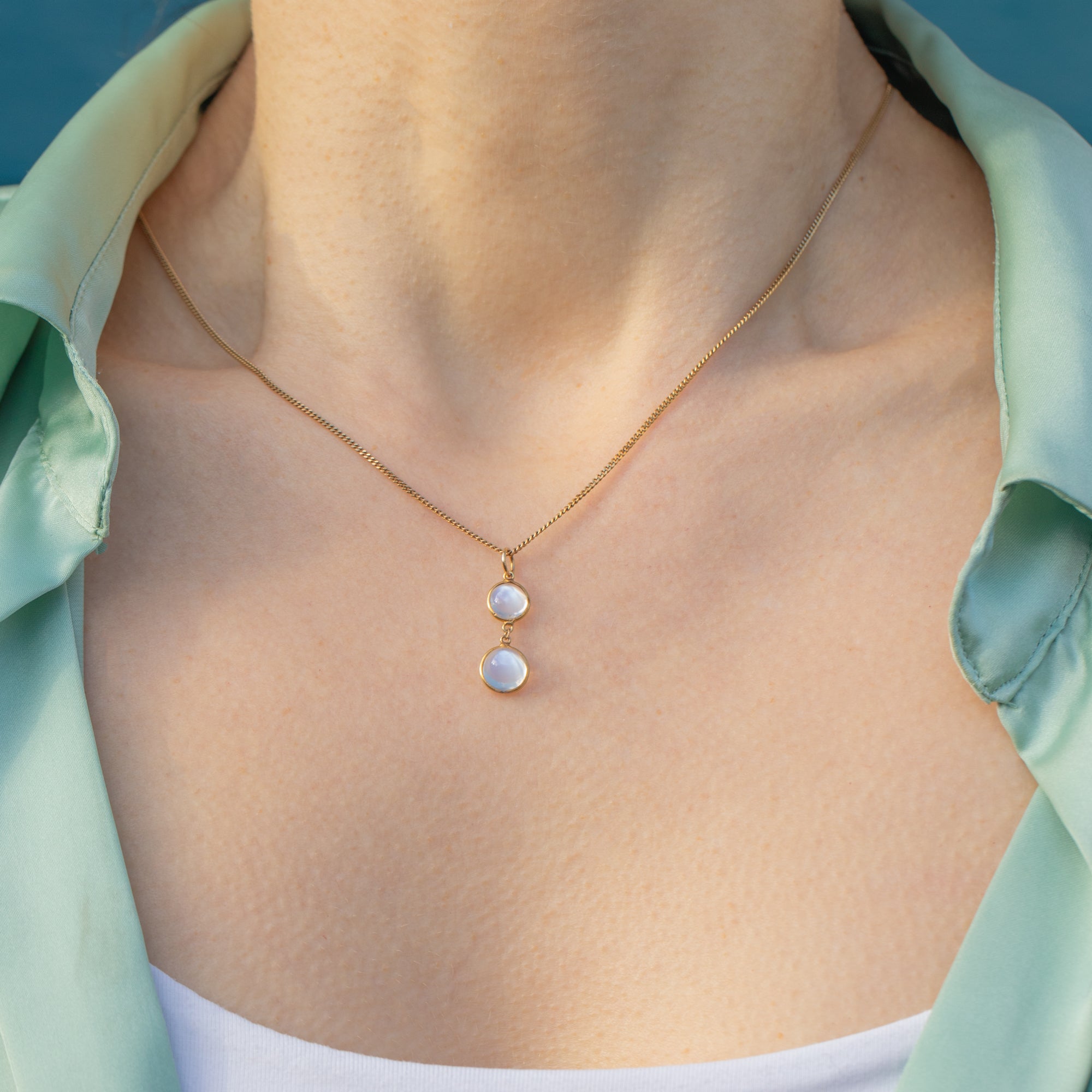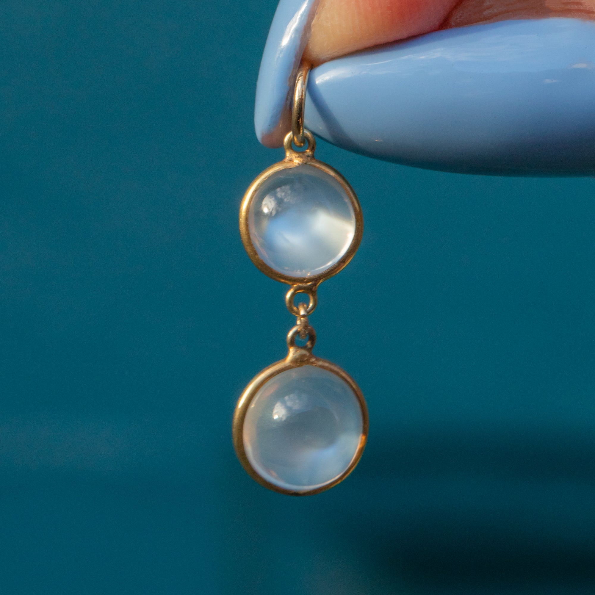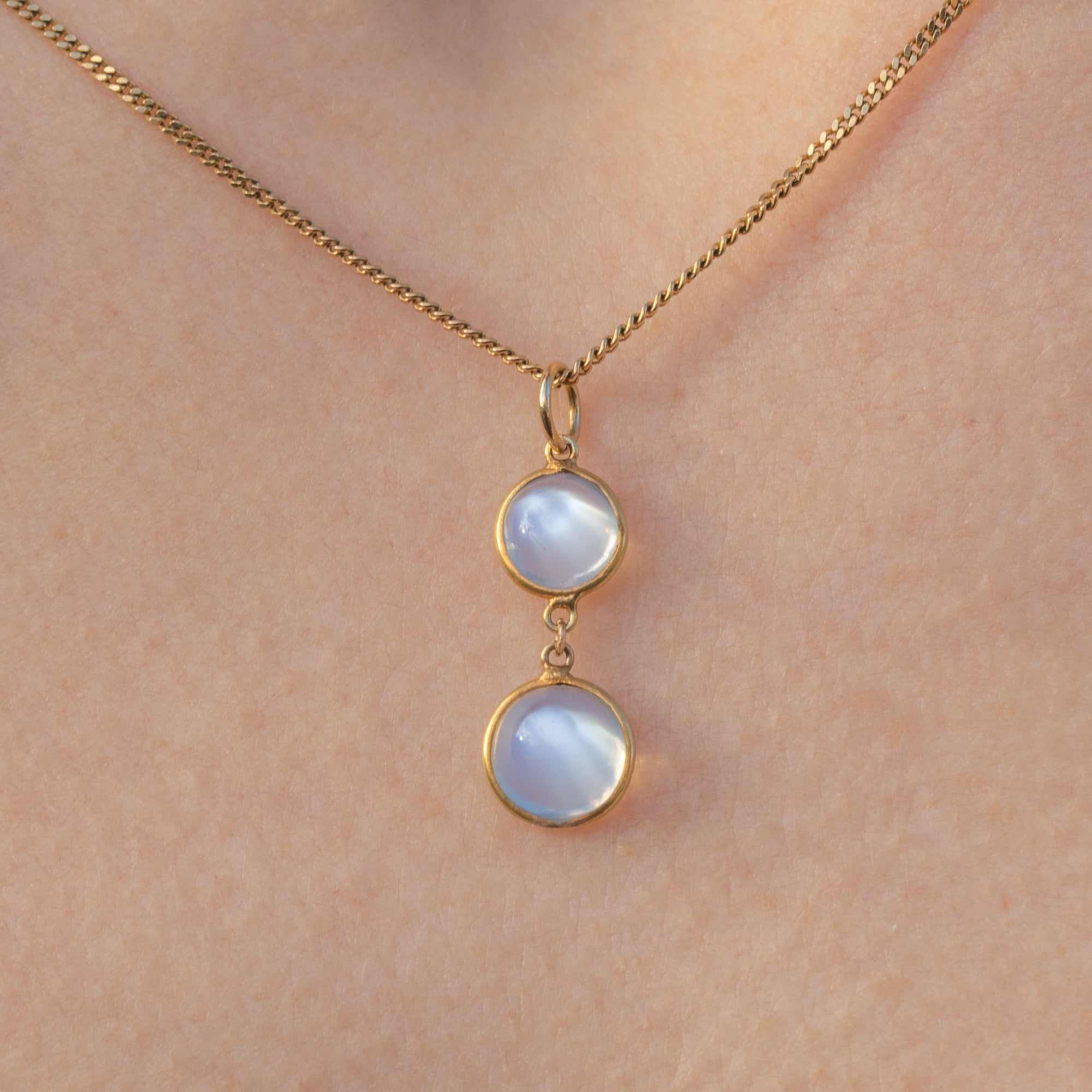 EXCELLENT. This antique 9ct Gold Moonstone cabochon double drop pendant is in excellent condition. The Moonstones are perfectly smooth and free from surface wear, both securely held within their bezel settings. The Gold is bright and the generously sized jump ring will allow you to suspend this antique Moonstone pendant from a chain with ease!