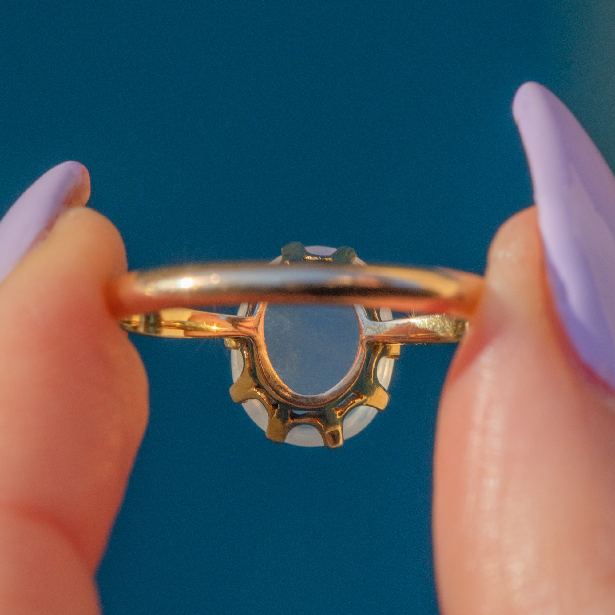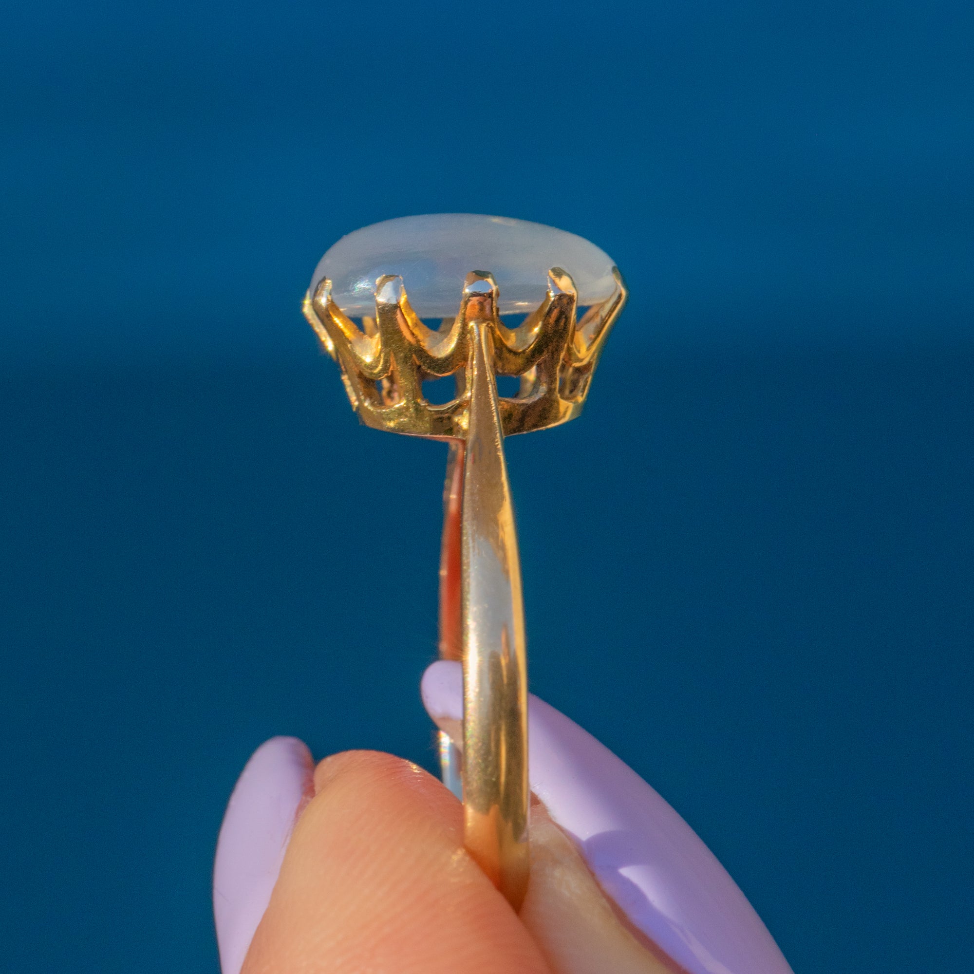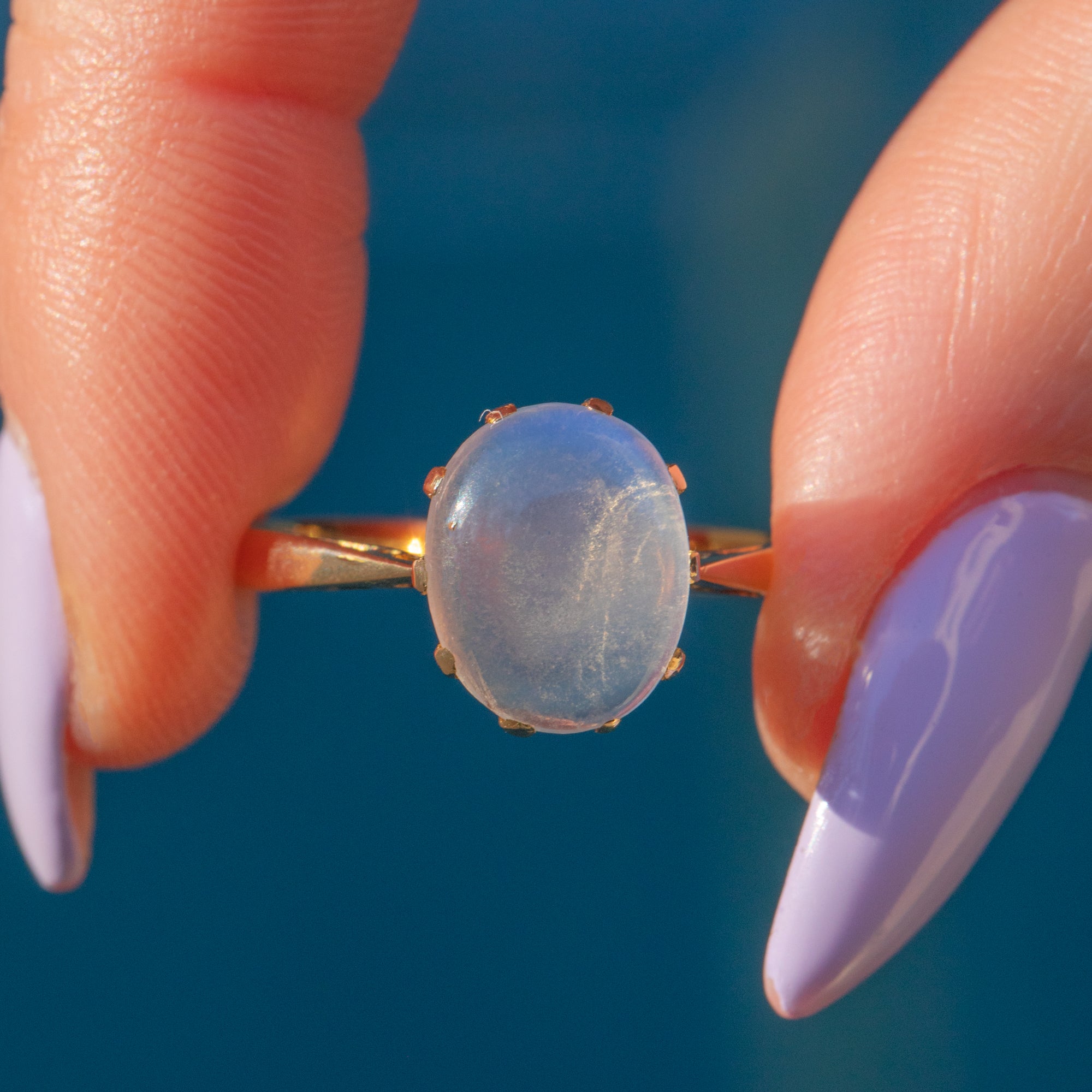 The captivating 2.75ct Moonstone cabochon is the true star of this show, with alluring curves and an ethereal adularescence that will enchant you; she's a wonderful everyday accessory and will make an impact whatever the occasion!