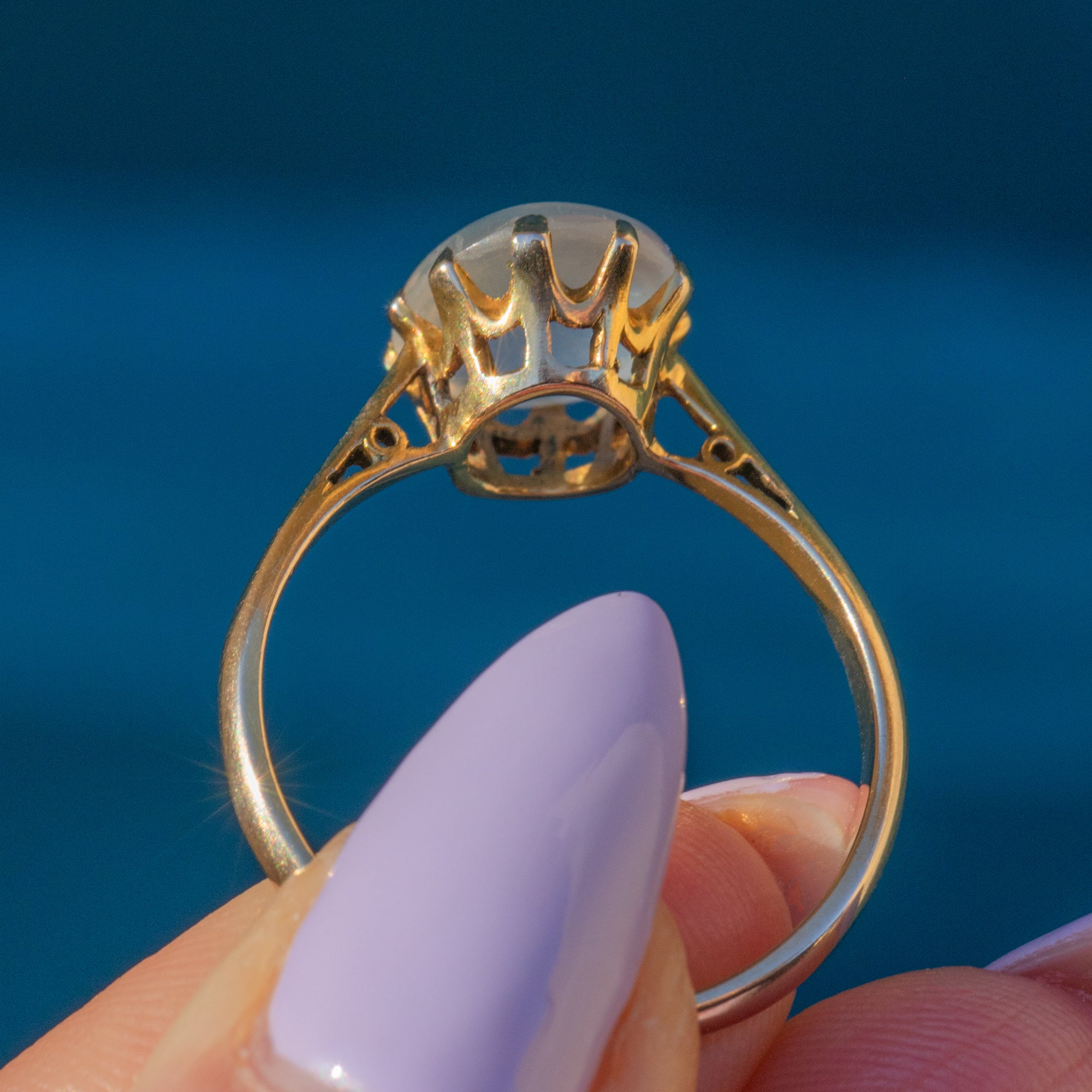 This gorgeous antique 9ct Gold Moonstone cabochon ring is fit for a princess! This exceptional Victorian ring fits the bill of magical and mystical, with a large cabochon-cut Moonstone at her centre!