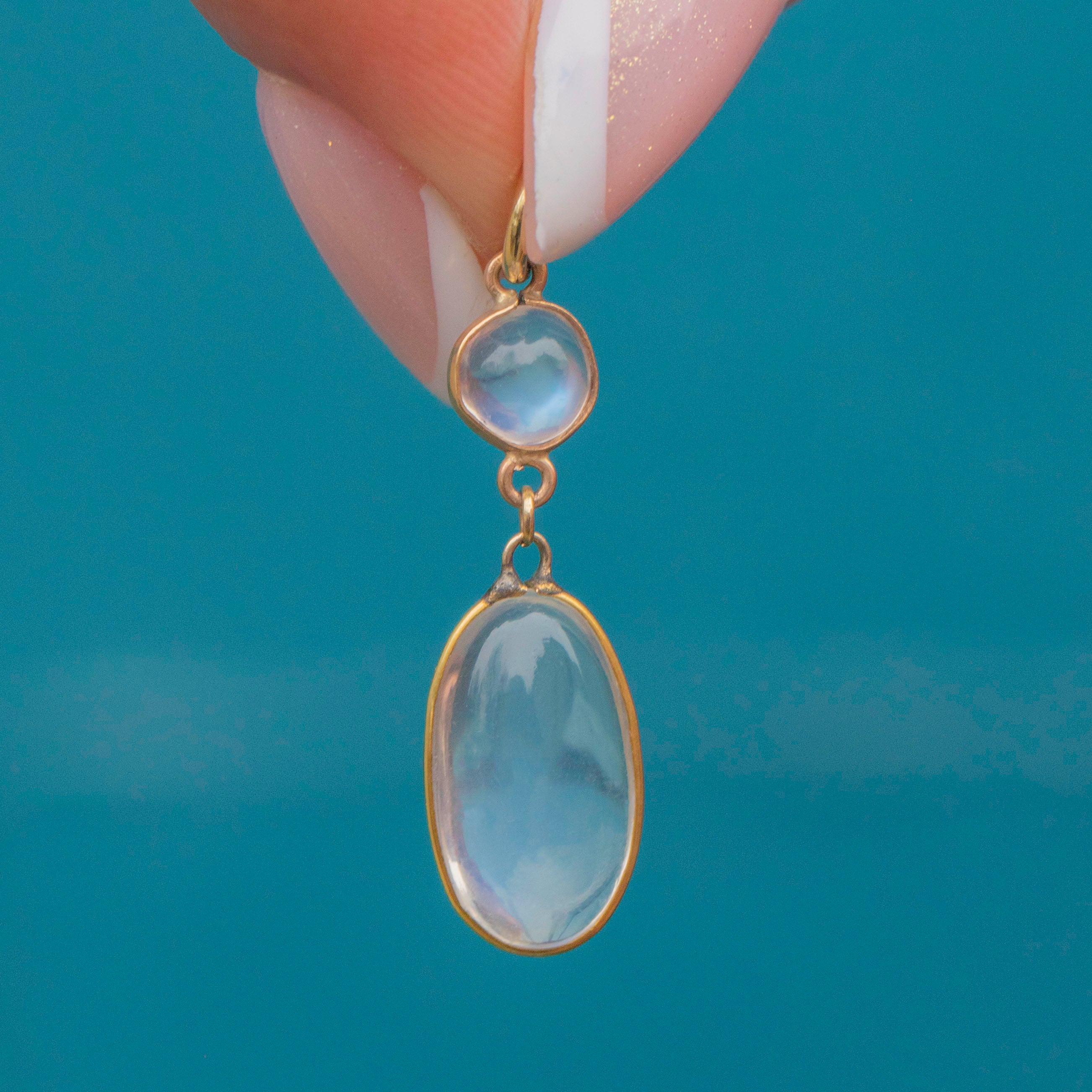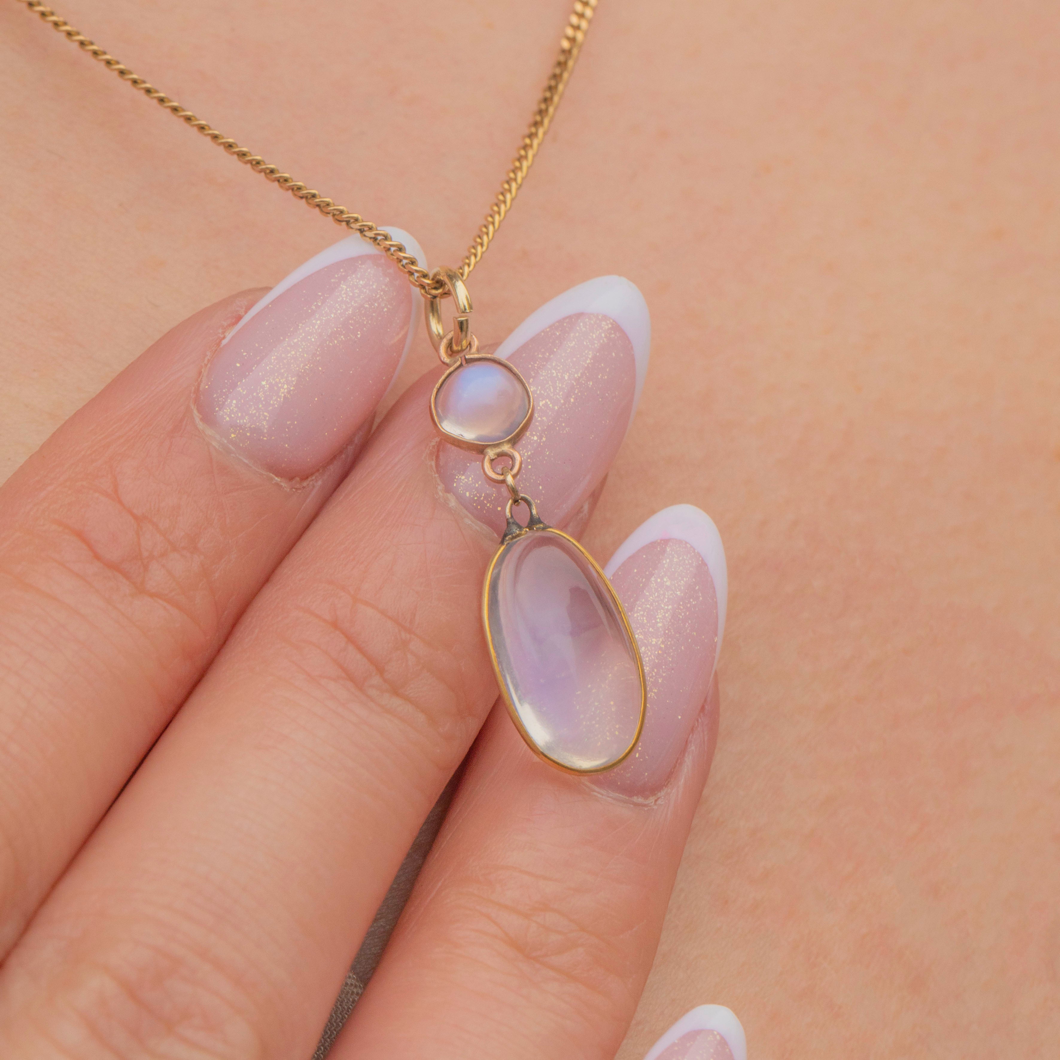 VERY GOOD: This antique 9ct Gold Moonstone drop pendant is in very good condition. Each Moonstone is radiant, with very little signs of wear. There is some discolouration to the chain between Moonstones, though this is difficult to spot. With a secure jump ring, she is a must-have piece!