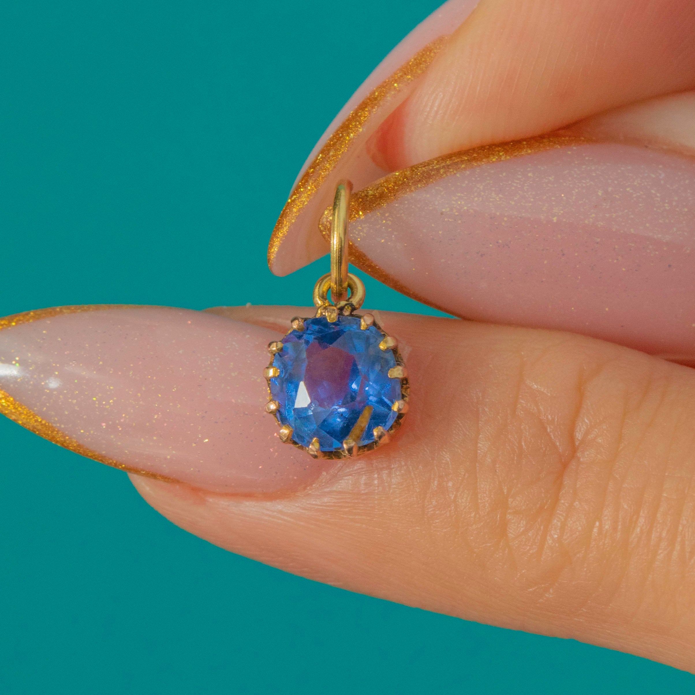 EXCELLENT: The Sapphire is in excellent condition with a bright Cornflower blue colour and no noticeable chips, abrasions or facet wear. The claw settings are secure and well-formed, holding the stone safely in place. The Gold surfaces show only minimal light wear consistent with age, suggesting this Victorian charm has been very well cared for.