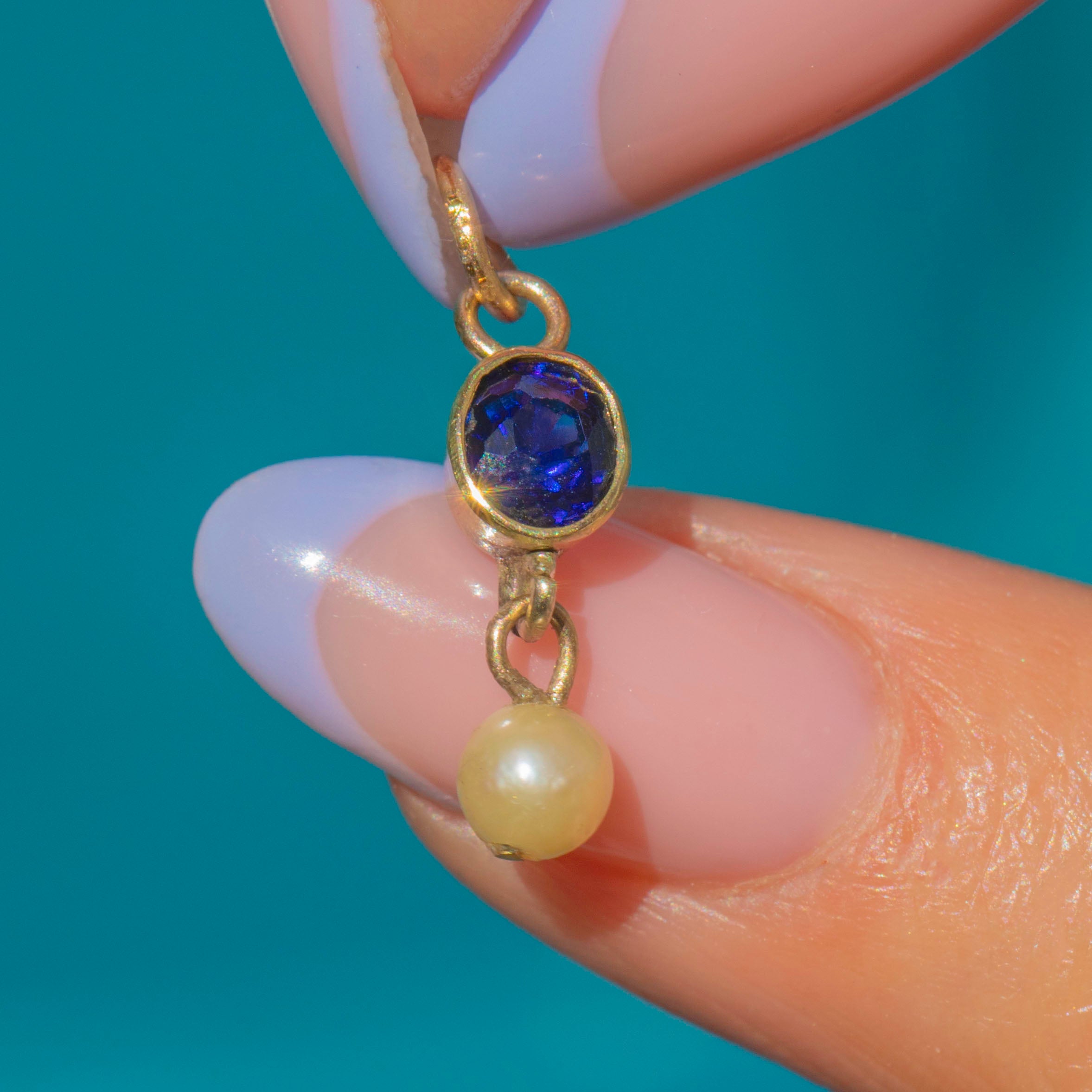 EXCELLENT: This antique 9ct Gold Natural Sapphire Pearl charm is in excellent antique condition with all components intact. The Sapphire and Pearl are securely set, showing only mild signs of their age. The Gold is bright and buttery with no visible damage or repairs.