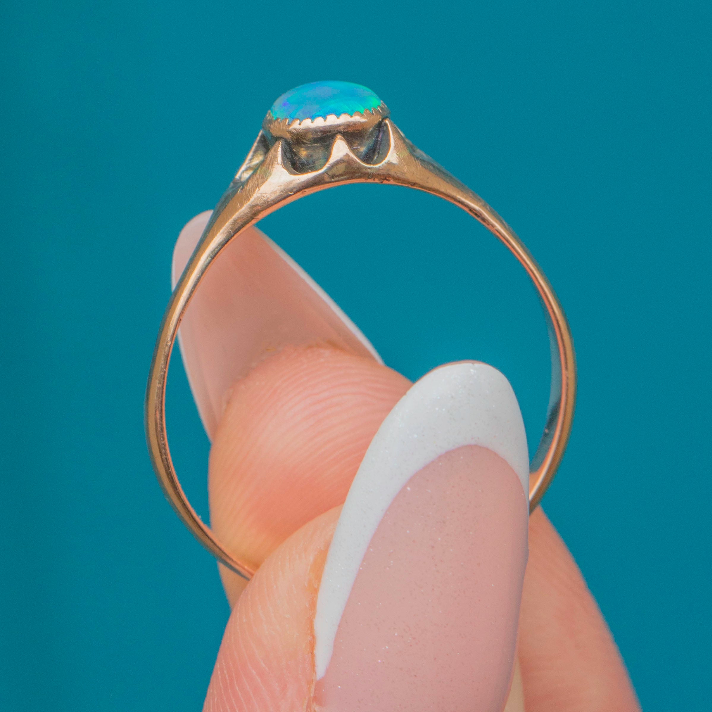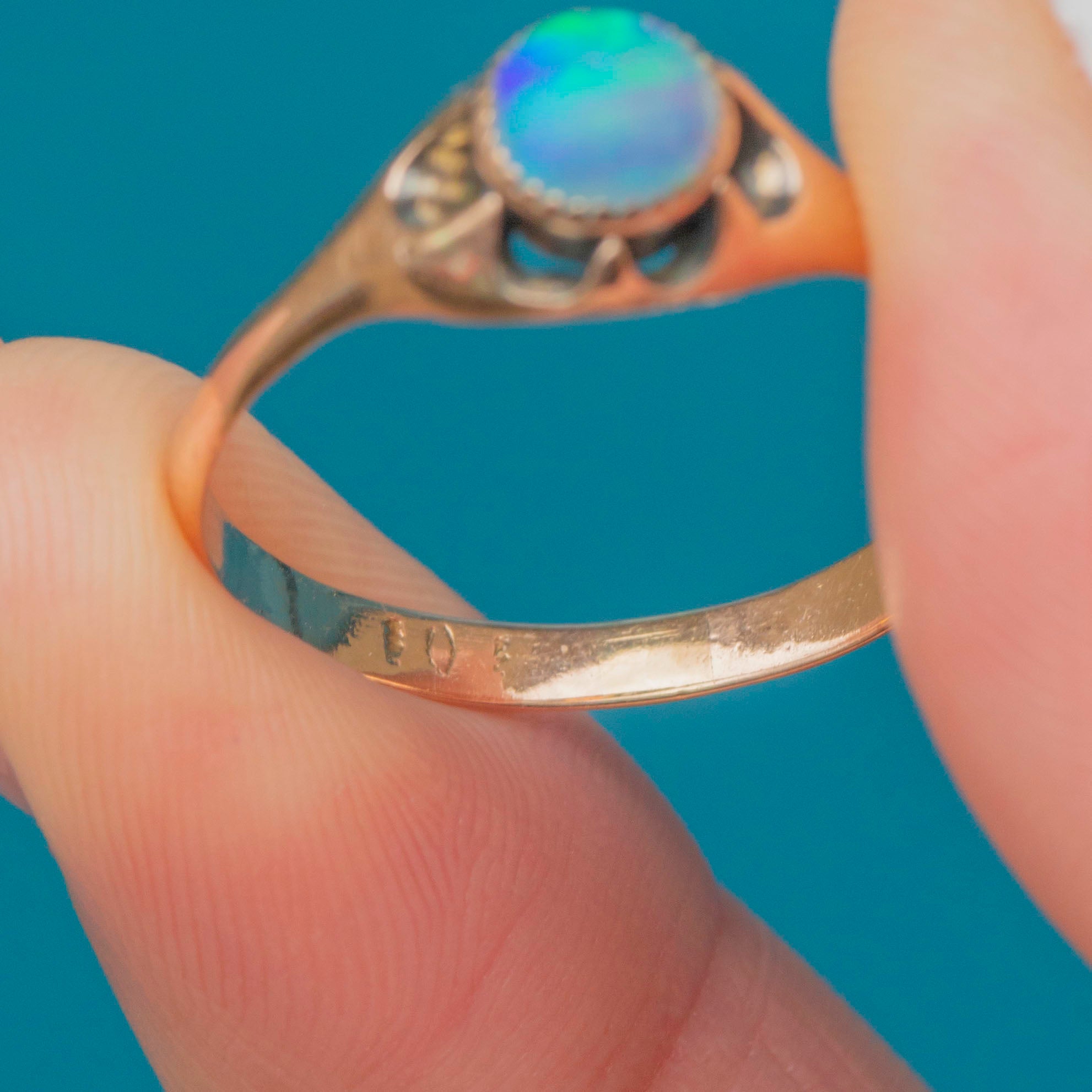 VERY GOOD-EXCELLENT: This antique 9ct Gold Opal ring is in superb condition. There is some minor surface wear to the Opal and settings, commensurate with age, which is difficult to spot without a jeweller's loupe. This vibrant Victorian Opal ring will make an enchanting addition to your collection!