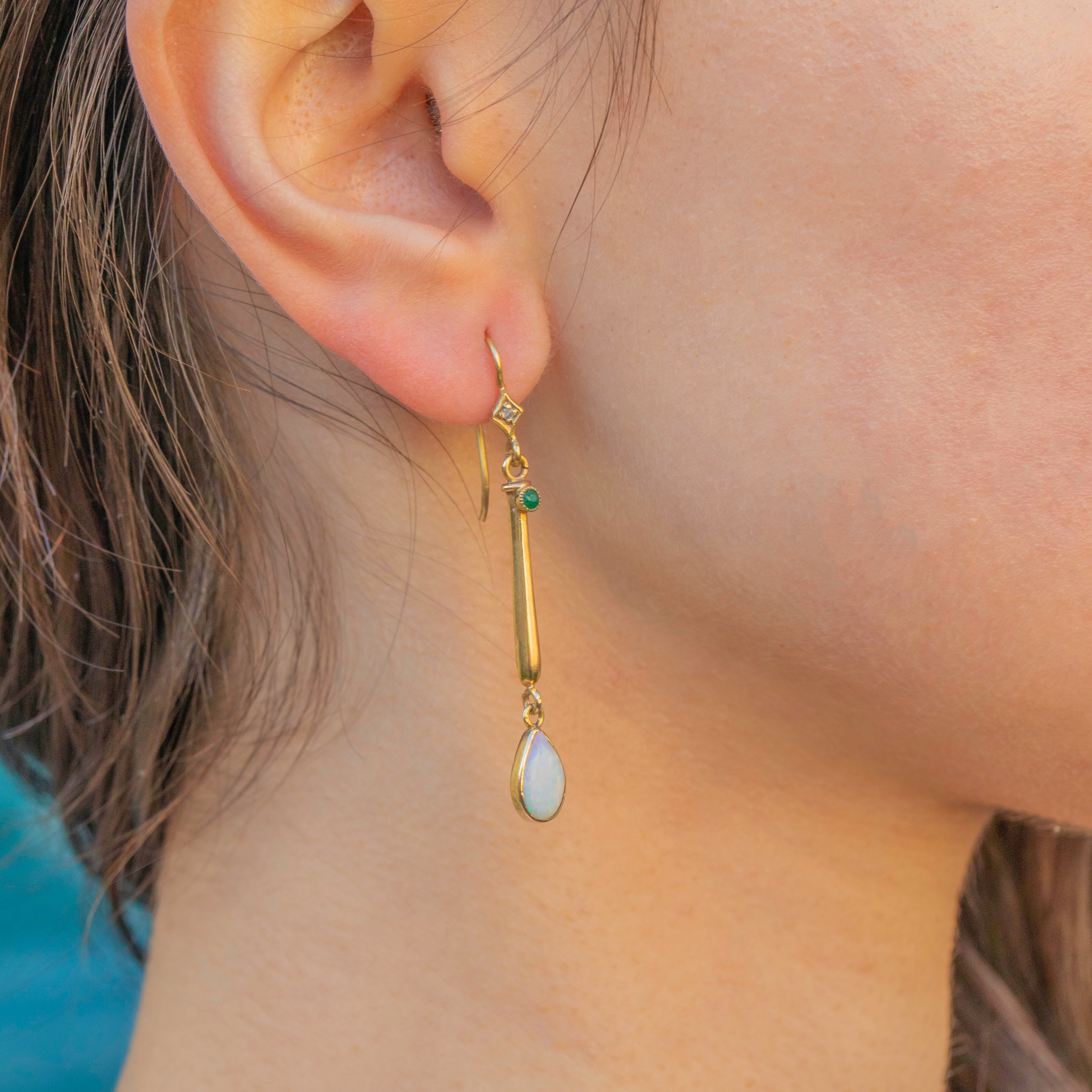 Dainty rose-cut Diamonds sit just below the lobes, accompanied by vibrant green Paste gems leading to curvaceous bars that suspend teardrop Opal cabochons. The Opals reveal flashes of neon orange, green and pink as they catch the light, adding an ethereal finish to this refined pair of antique Gold earrings!