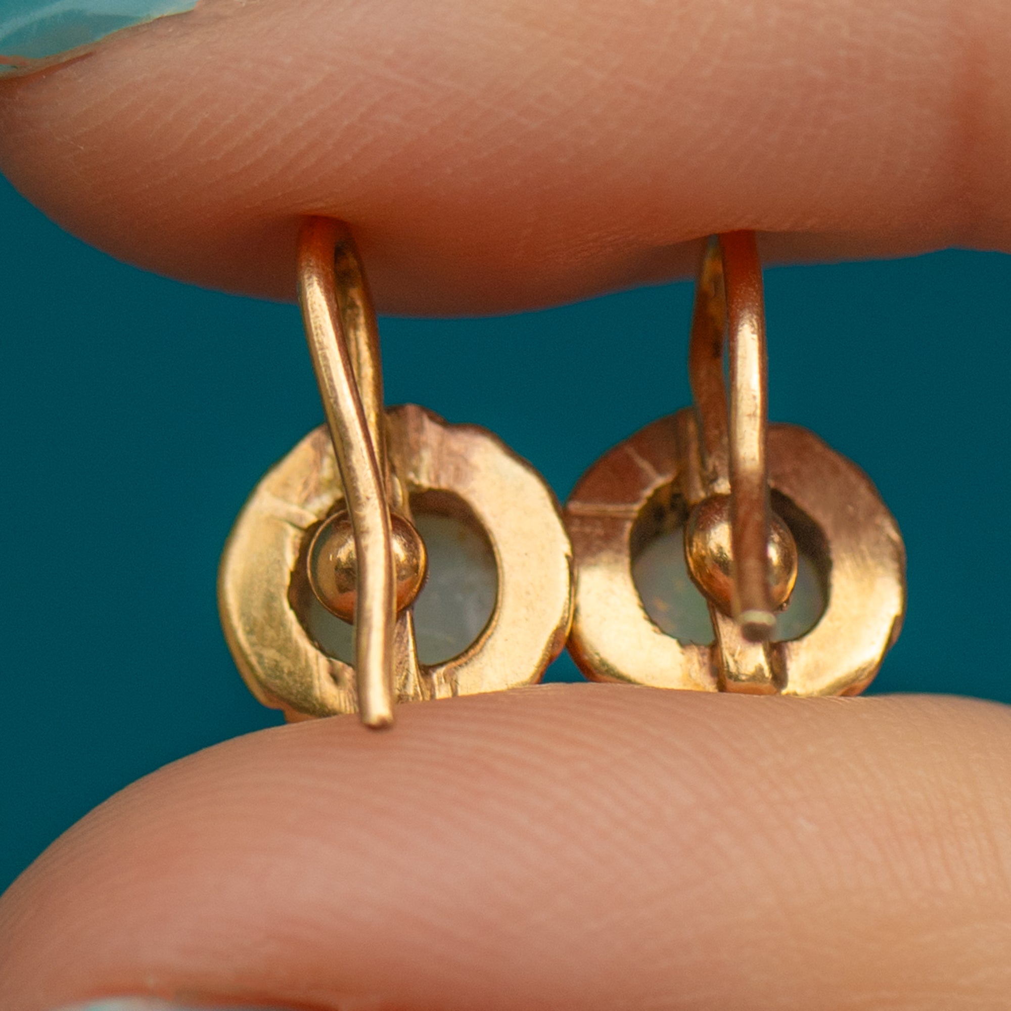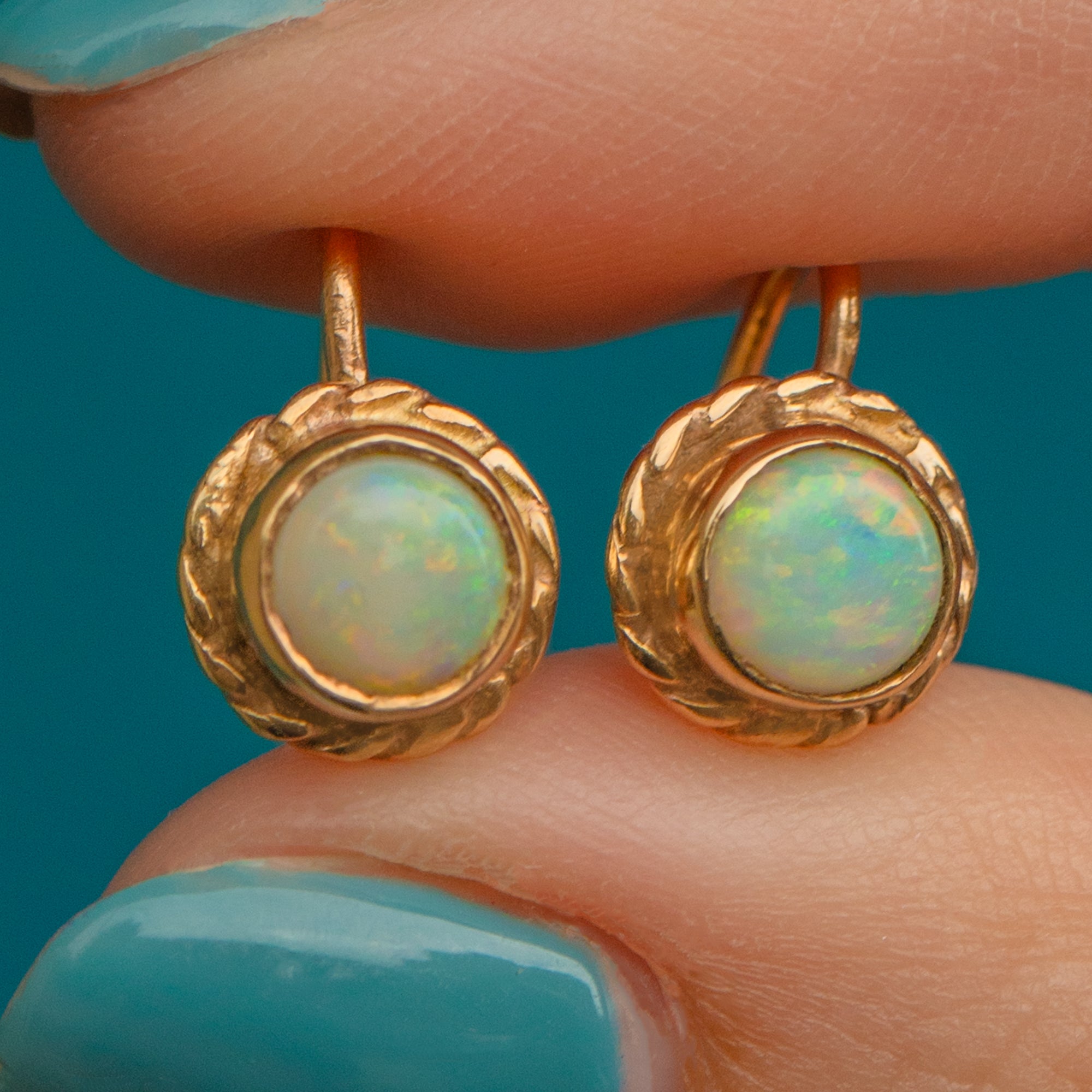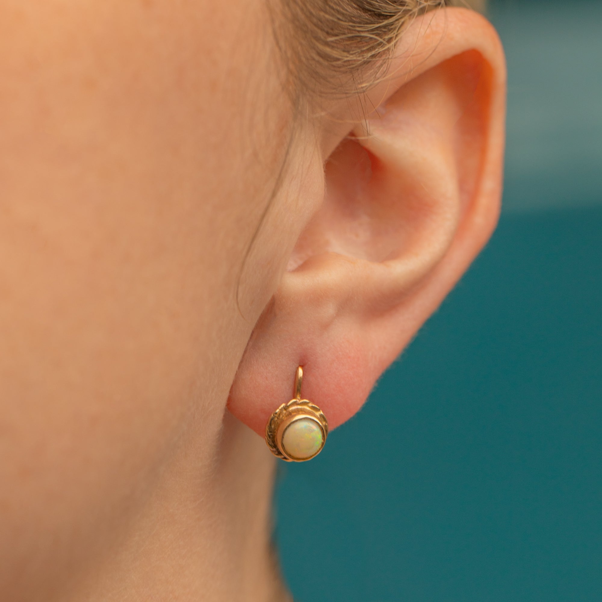 These Victorian Opal earrings possess a feminine allure with their rope edge making them look like flowers. With tight fitting ear hook, the Opals sit just below the lobe, making an elegant addition to your ear stack. Sure to become a staple within your collection, these Gold stud earrings are easily styled alongside your other Gold goodies.