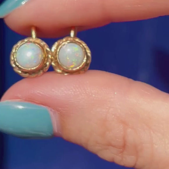 EXCELLENT. These antique 9ct Gold Opal earrings are in excellent condition. Both Opals are secure in their bezel settings, free from any chips or surface wear. The Gold has a rich, buttery tone with no damage to note. With secure fitting ear hooks, you can wear these Opal earrings in confidence and style!