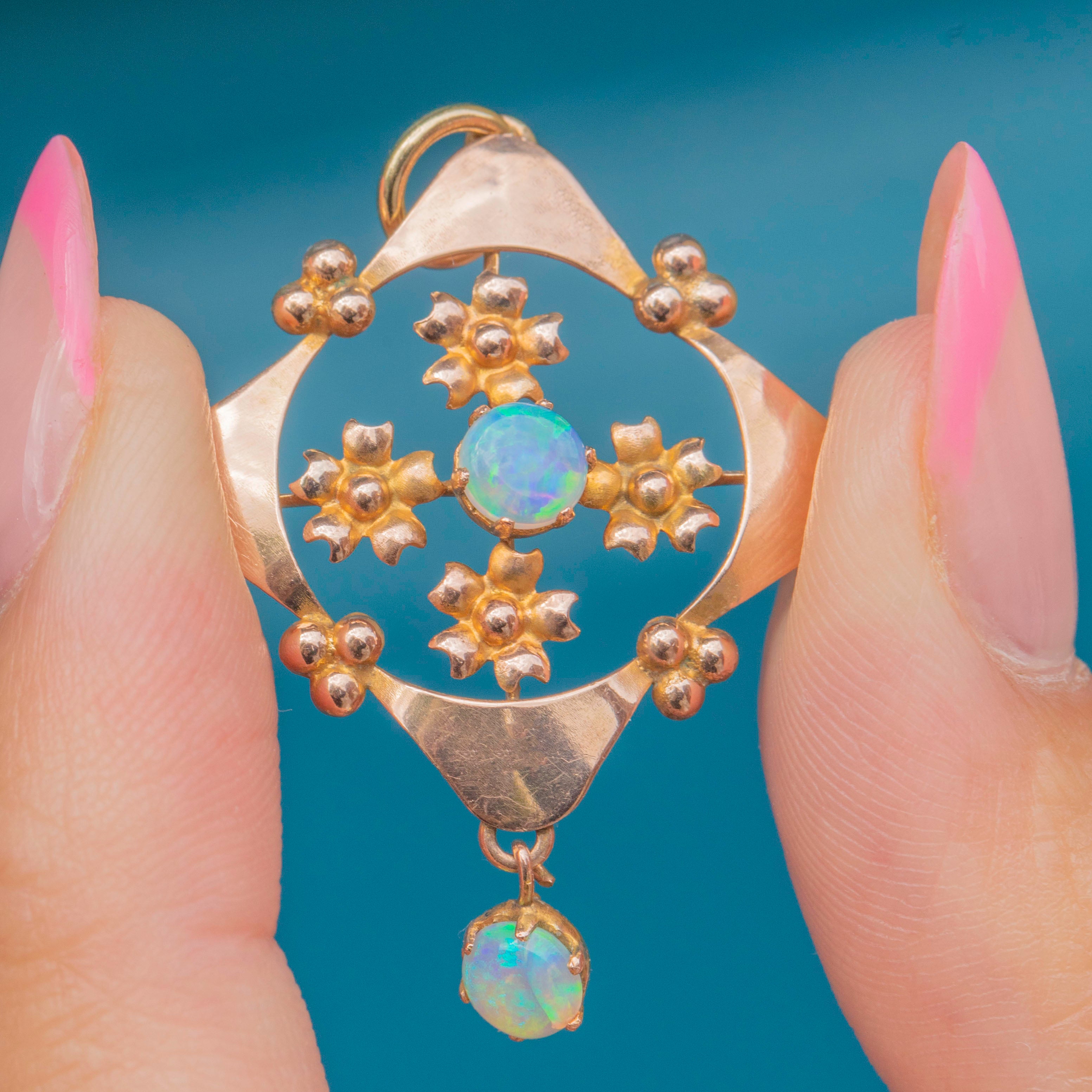 VERY GOOD-EXCELLENT: This adorable antique 9ct Gold Opal floral pendant is in great condition. Each Opal is radiant and sits securely in its settings. She has been crafted meticulously, with the Gold remaining glossy and lustrous. There are some spots of discolouration to the Gold on the back of the pendant, though this cannot be seen when wearing. With a securely soldered jump ring, this Edwardian pendant can be worn with utmost confidence.