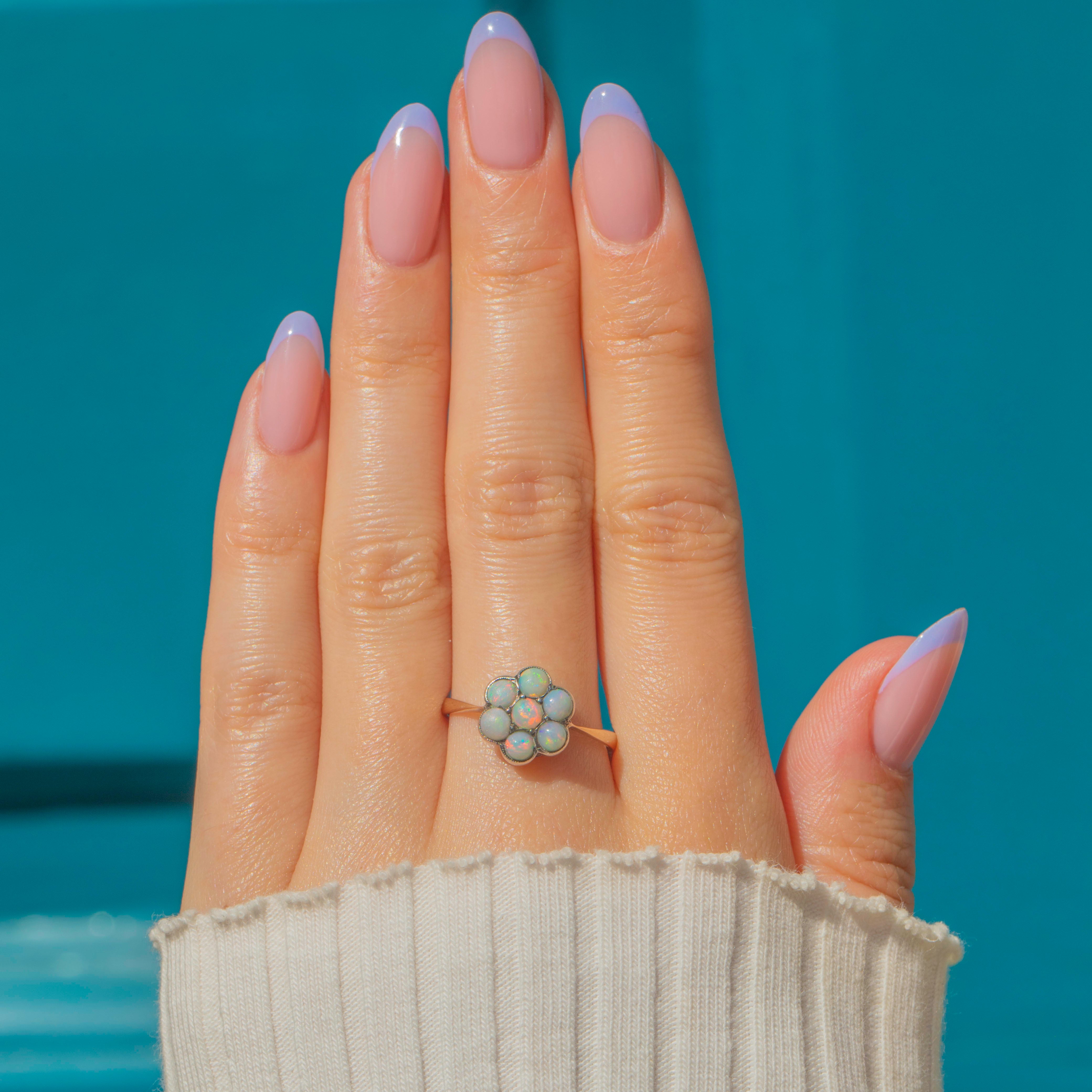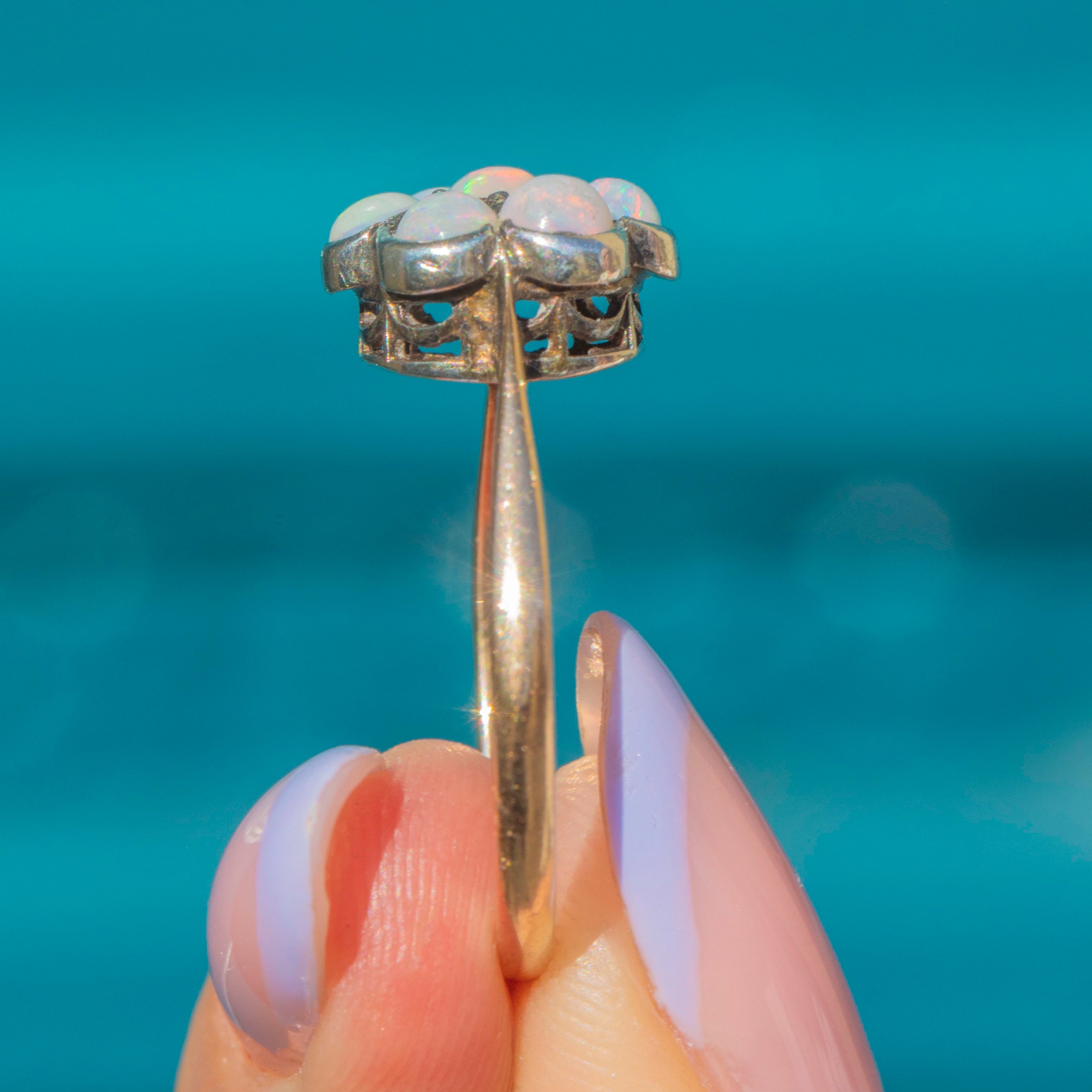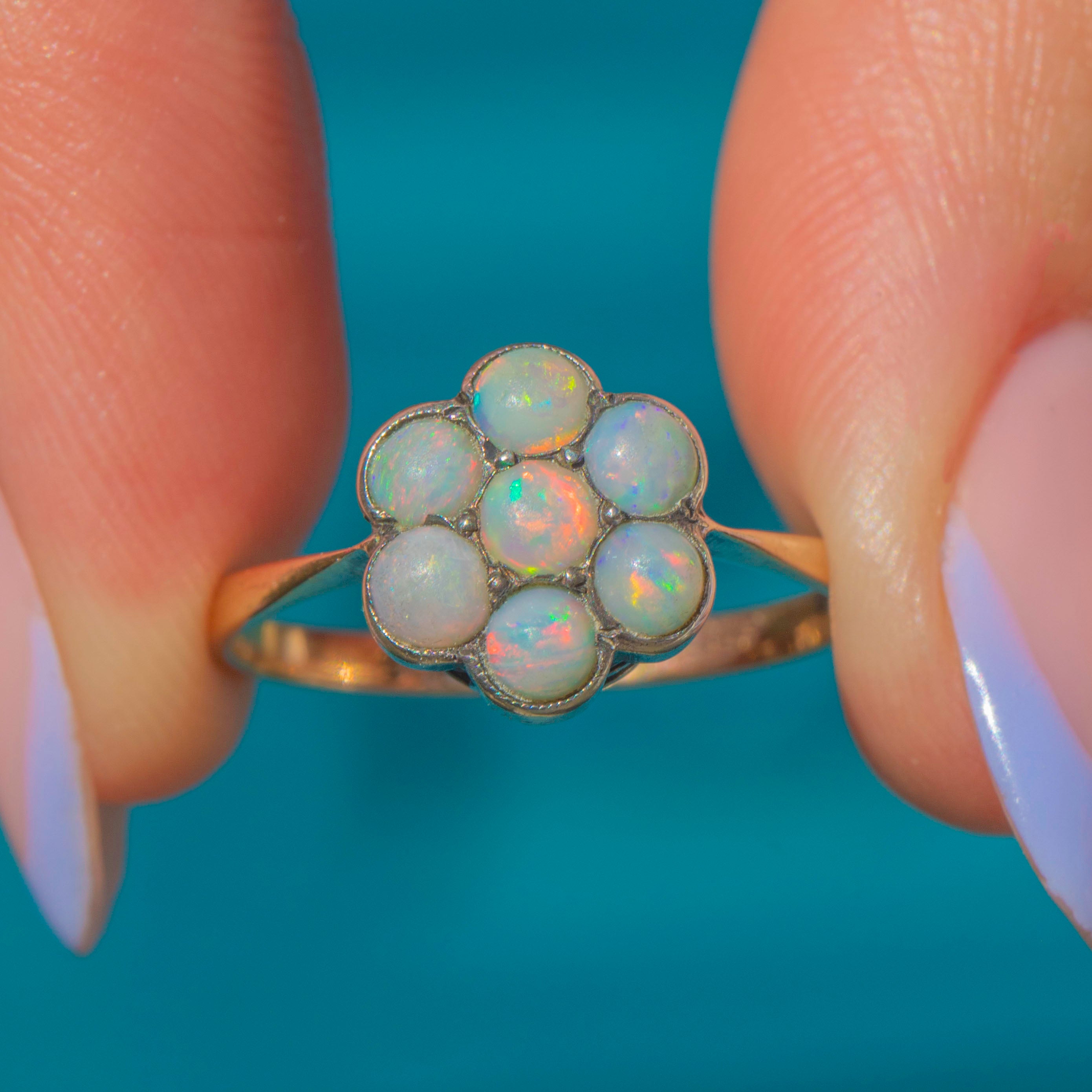 This antique 9ct Gold Opal flower cluster ring is bursting with feminine charm! The floral cluster displays seven Opal cabochons that come to life under the light, boasting vibrant pops of neon orange and blue, with hints of yellow and pink shimmering across their milky cores.