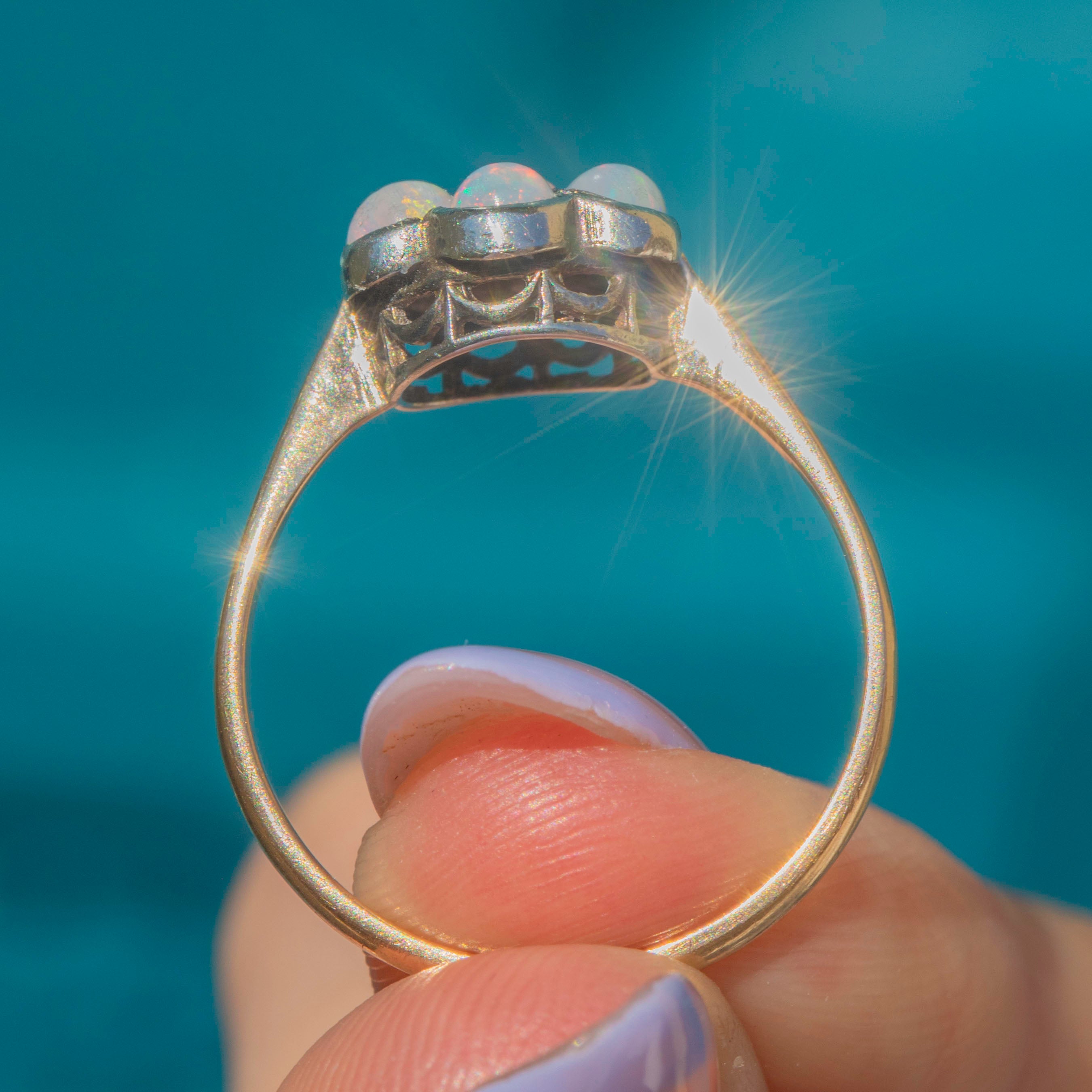 The Opals are set within lustrous Silver and displayed upon a buttery 9ct Gold band, adding luxury to this pretty Victorian ring. A highly wearable piece, this antique Opal ring is the perfect summer accessory!