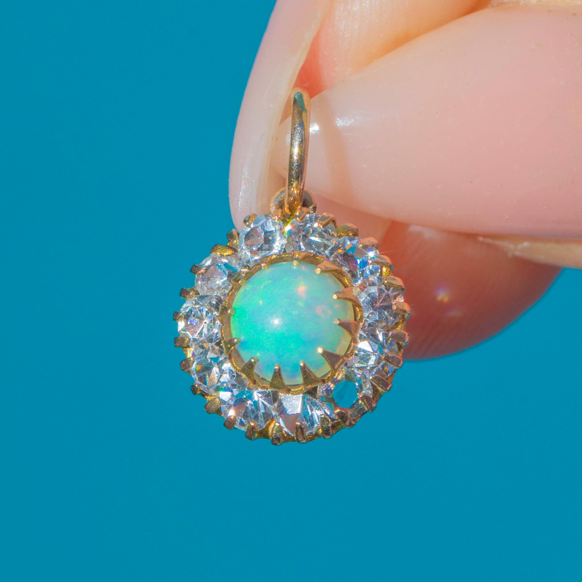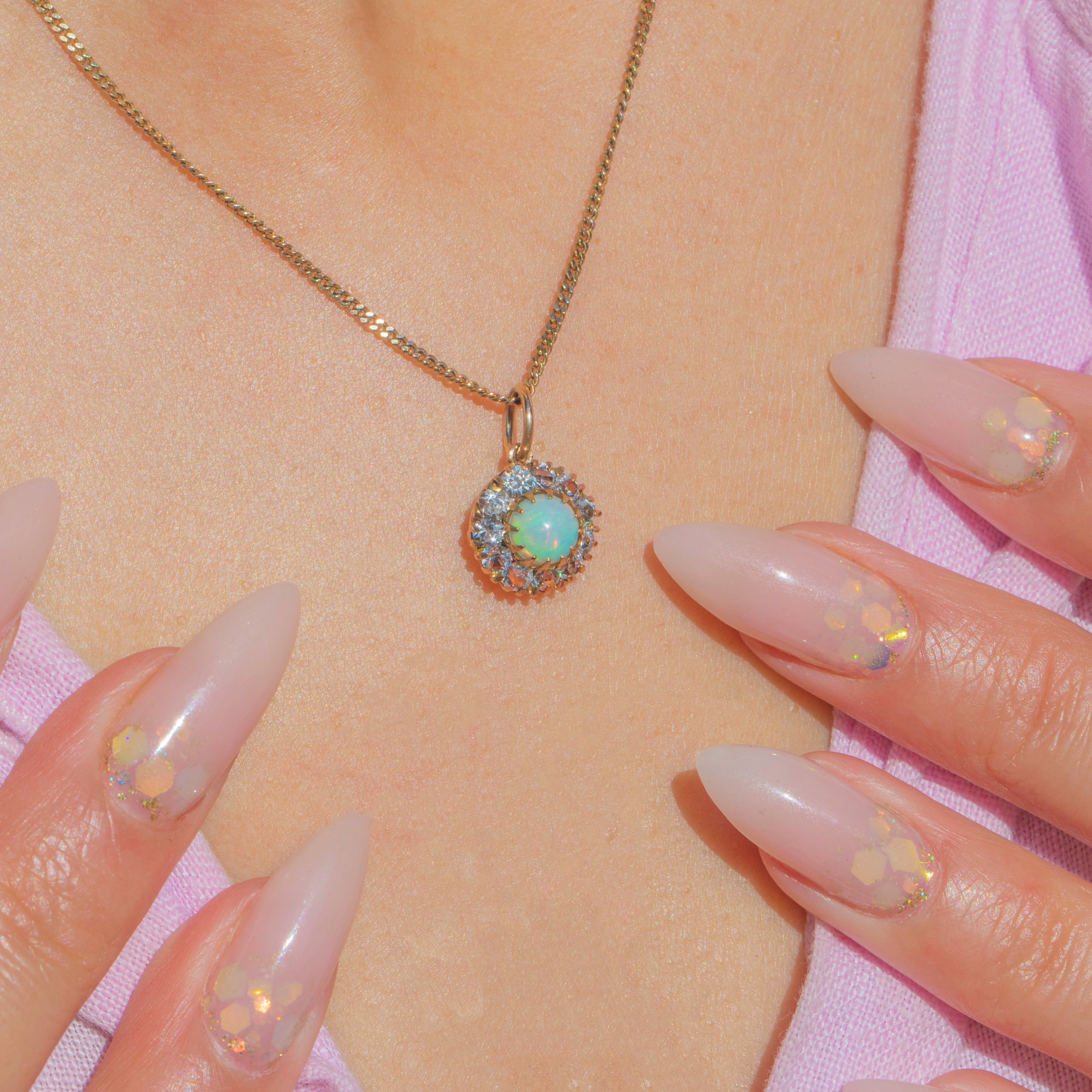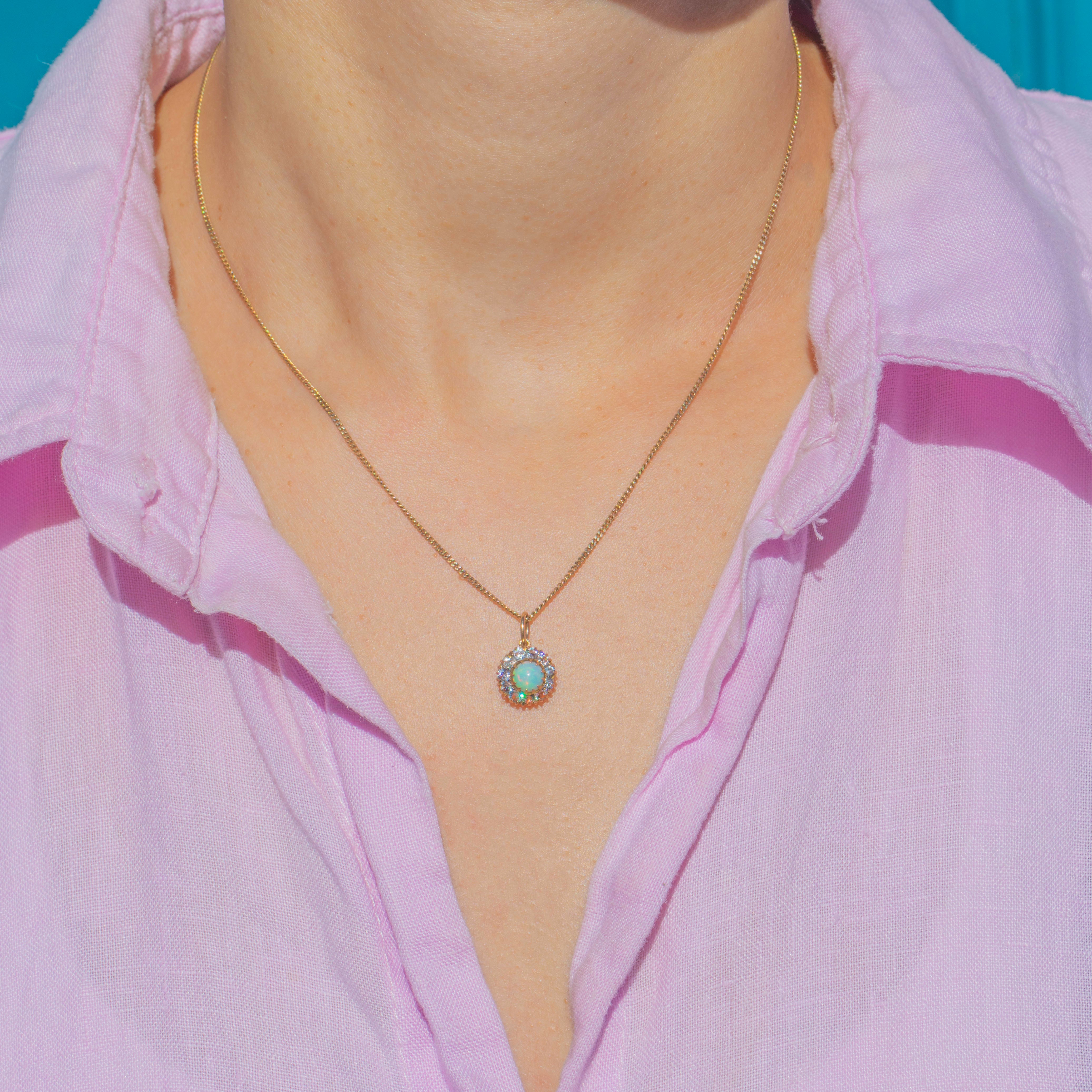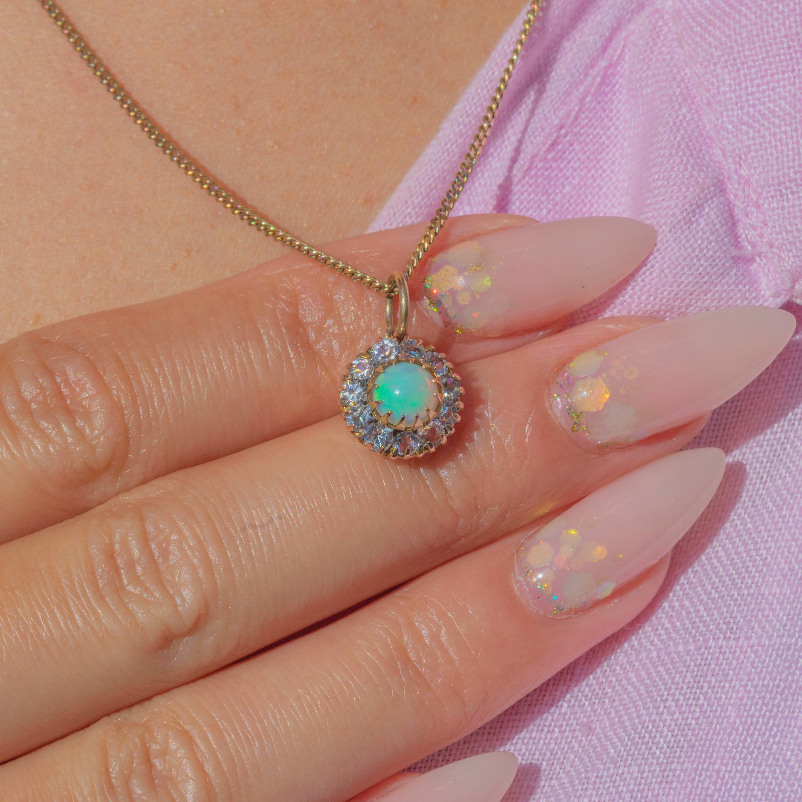 This charming Victorian 9ct Gold cluster pendant is set with a luminous natural Opal centre, alive with flashes of green and orange fire. Surrounding the Opal is a sparkling halo of bright white Paste stones, arranged in a classic cluster design that perfectly highlights the gemstone’s iridescent glow.
