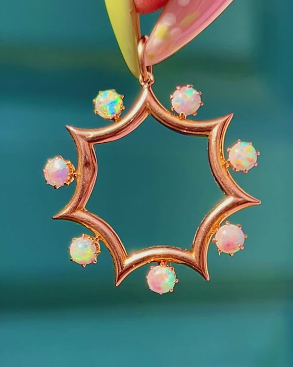 光り輝くVictorian 9ctゴールドのサンラウンドペンダント。幻想的なオパールカボションがハロー状にセットされ、ピンク、ブルー、グリーンの炎のような輝きを放ちます。スカラップ状のスターバーストシルエットは美しくオープンワークされており、軽やかでエアリーなエレガンスを演出。高い鏡面仕上げのゴールドが動きに合わせて光を受け、上品な存在感を放ちます。