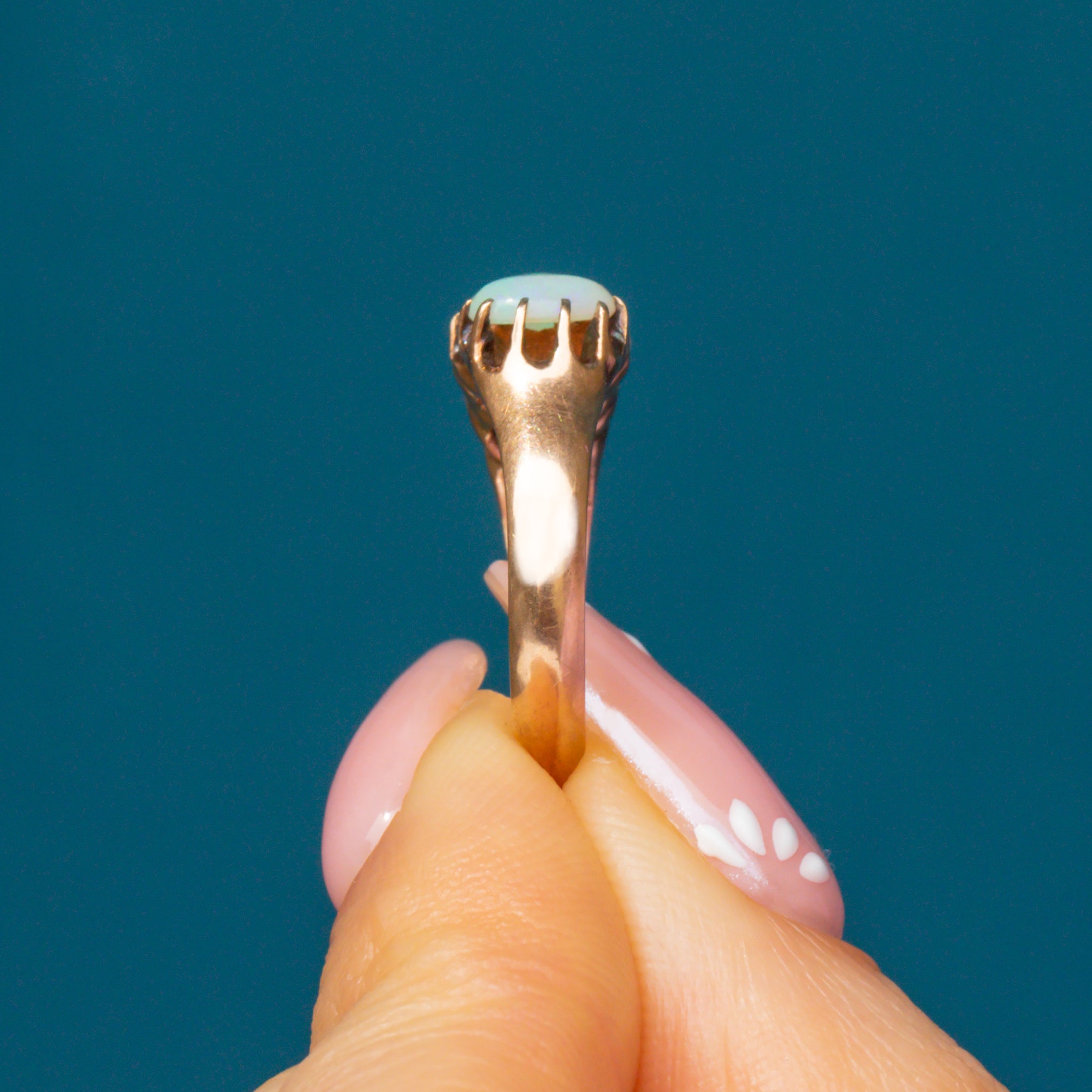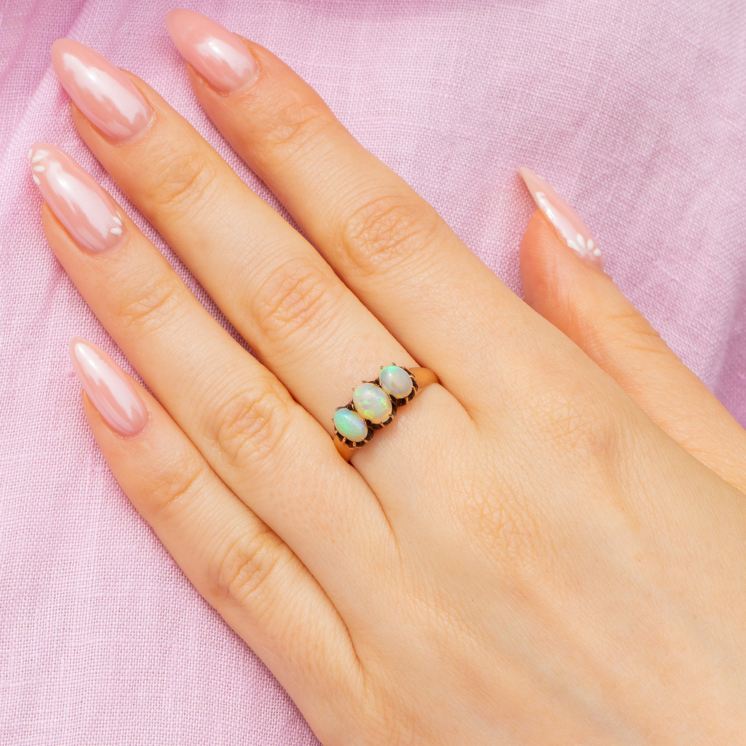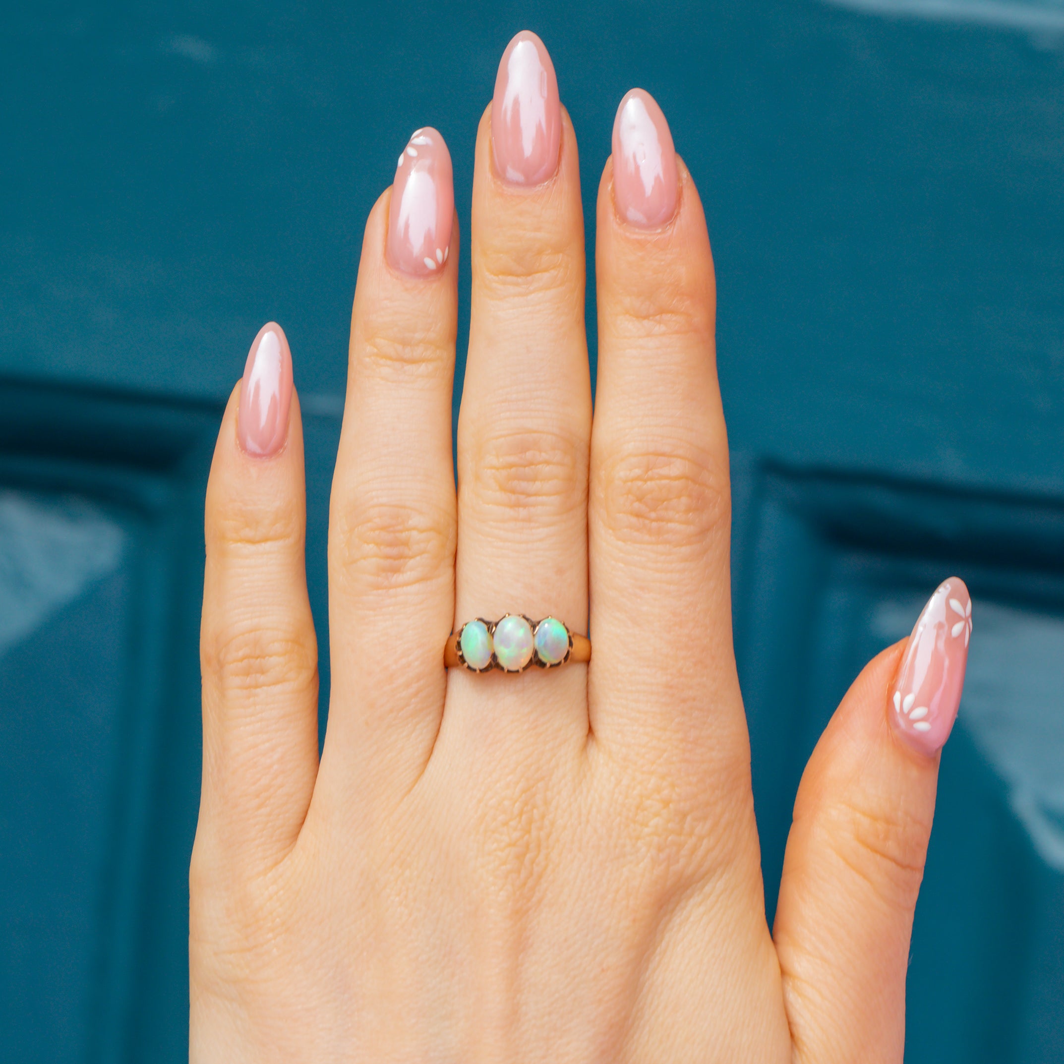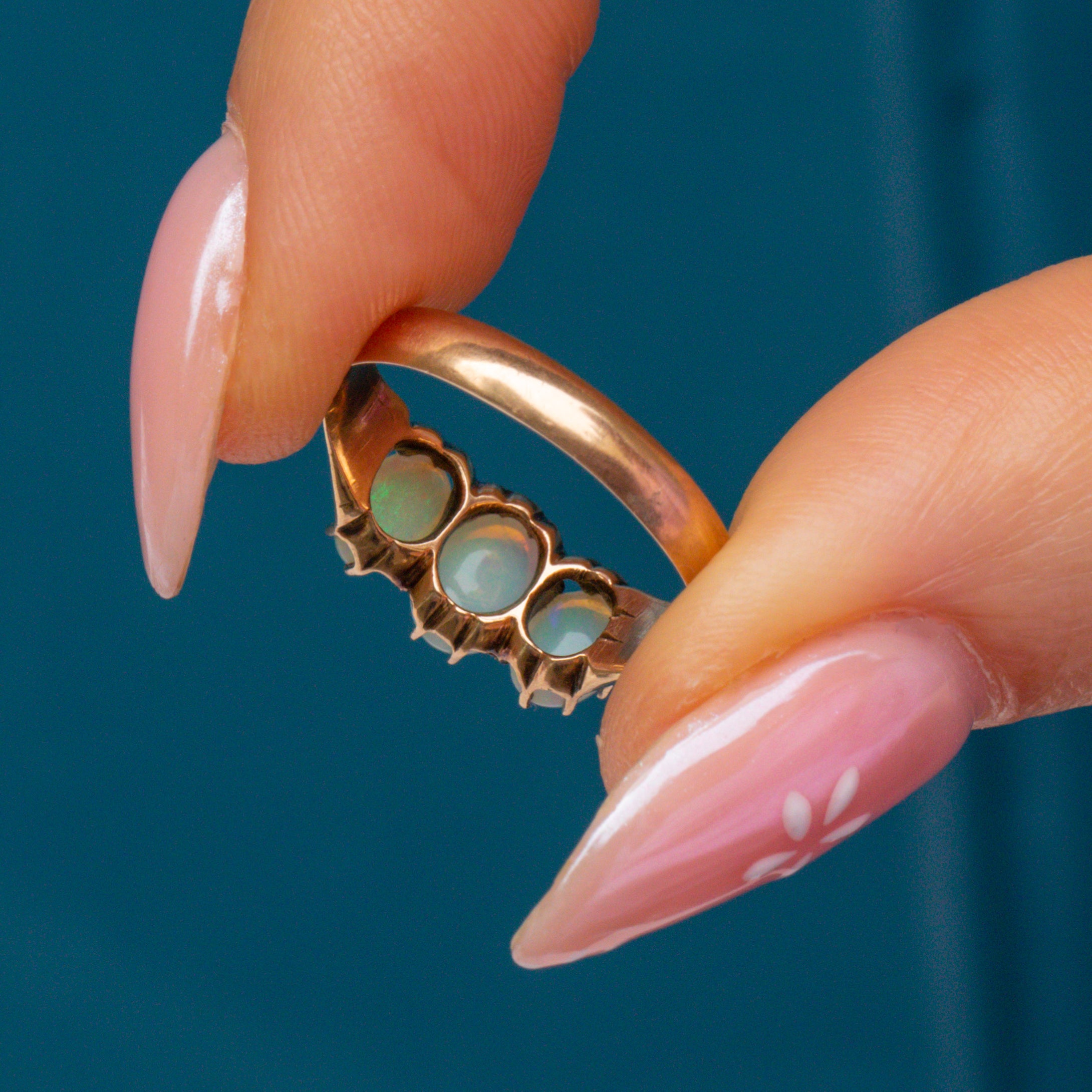 This antique 9ct Gold Opal trilogy ring is such a gorgeous find! Inlaid with three cabochon cut Opals that total to 0.80ct, this Gold ring provides gorgeous coverage on the finger.
