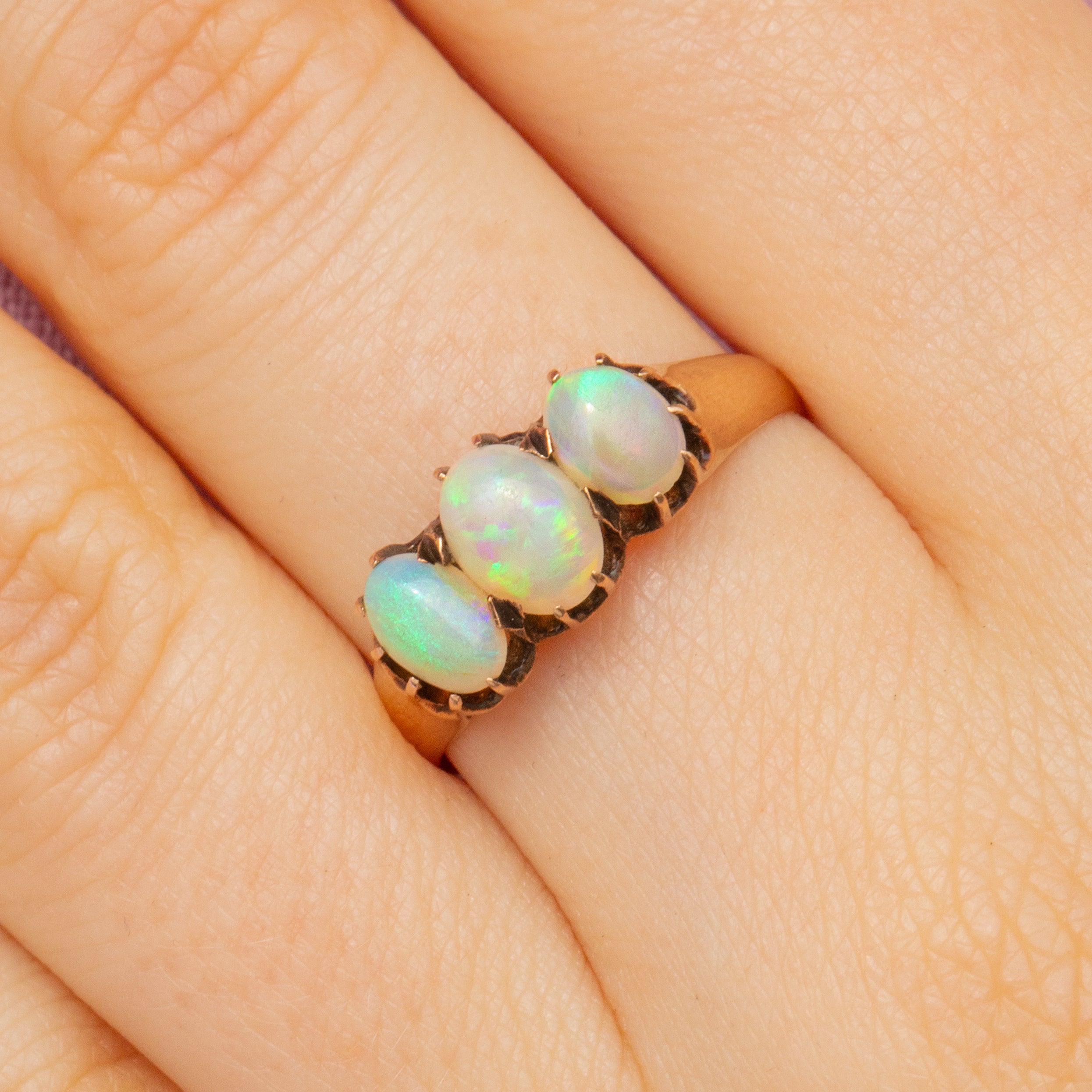 VERY GOOD. This antique 9ct Gold Opal trilogy ring is in very good condition. The Opals are so lovely, and securely set. The ring band is smooth, and wears super comfortably on the finger. There is some very light wear visible to the inside of the band commensurate with a ring of this age- there are two grooves on the inside of the band, but this is not visible when worn. There is a little scuff mark to the back of the band, but it's nothing that affects its overall appeal! The Opals are extremely vivid, solid and completely natural.
