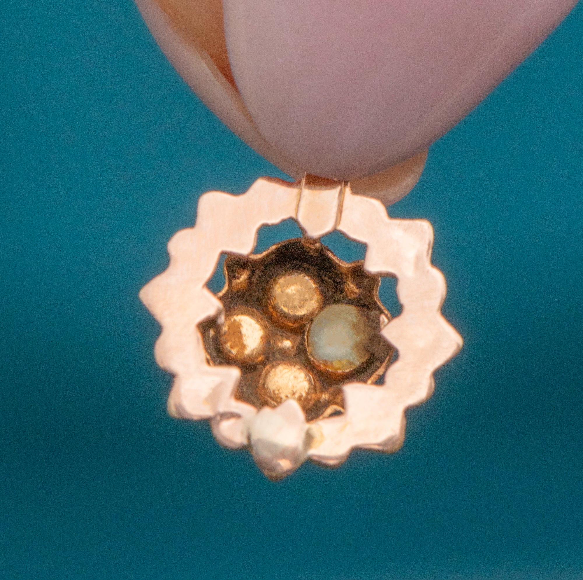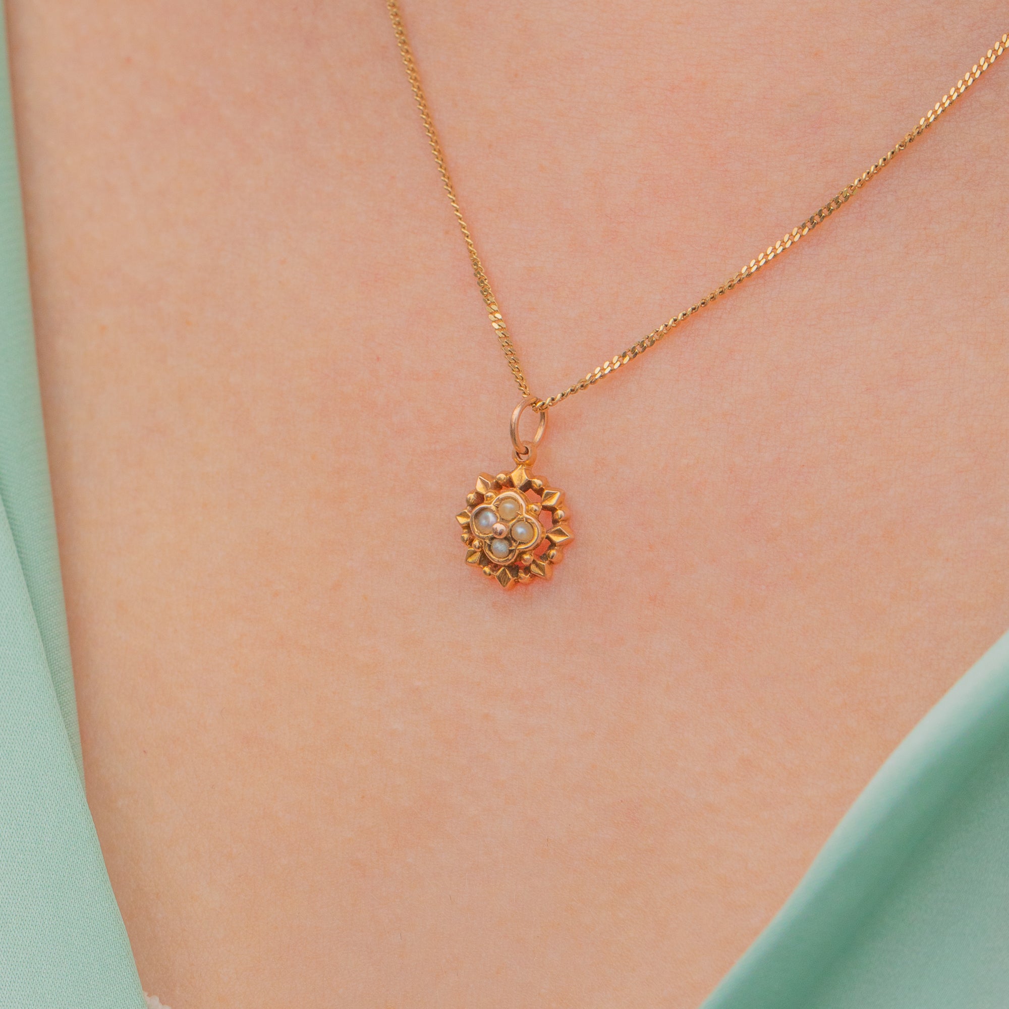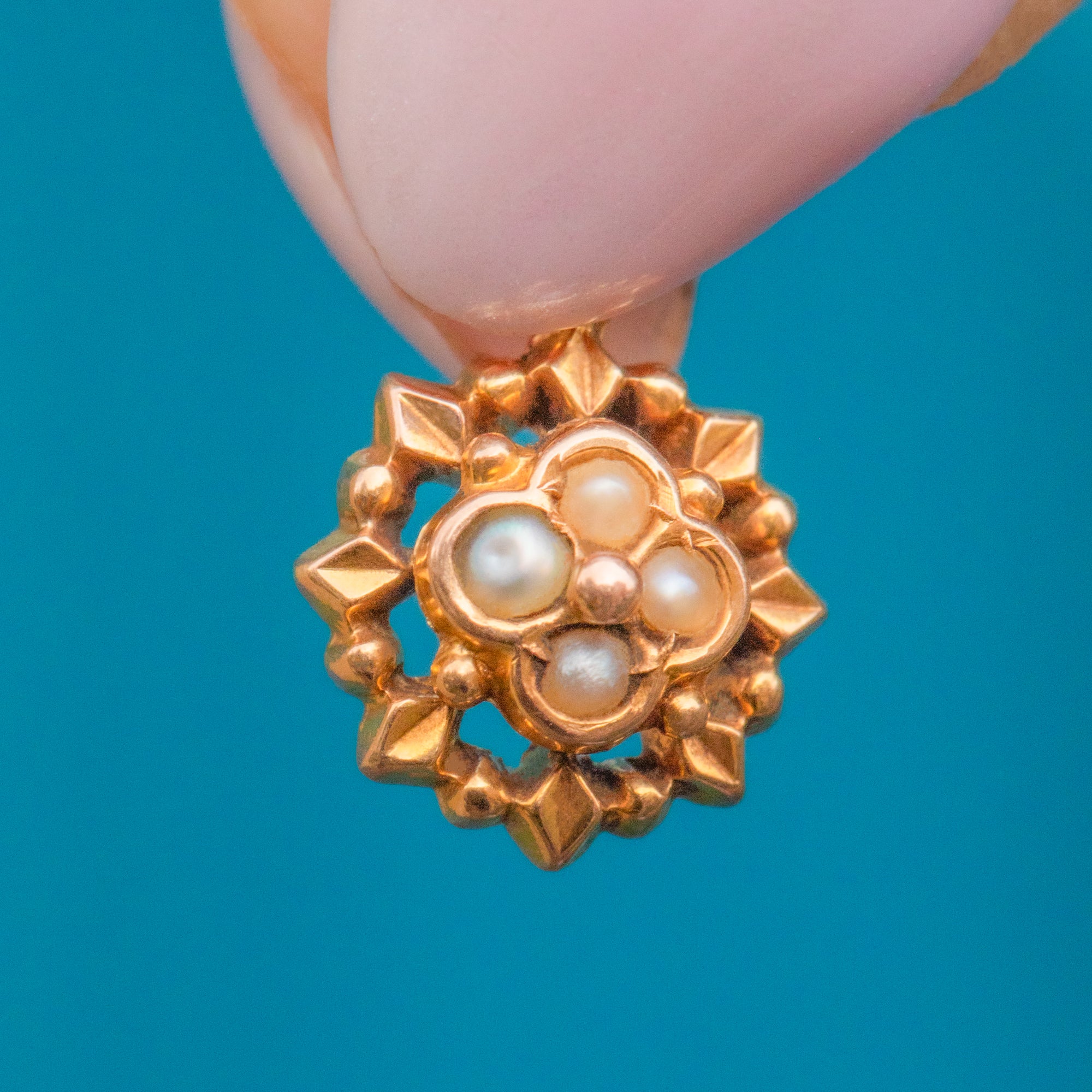 This delightfully dainty antique 9ct Gold Pearl cluster charm is a striking piece from the Victorian era and will instantly add a touch of elegance to your outfit! Crafted from 9ct yellow gold, this charm displays a cluster of lustrous Pearls arranged in a timeless and intricate design.
