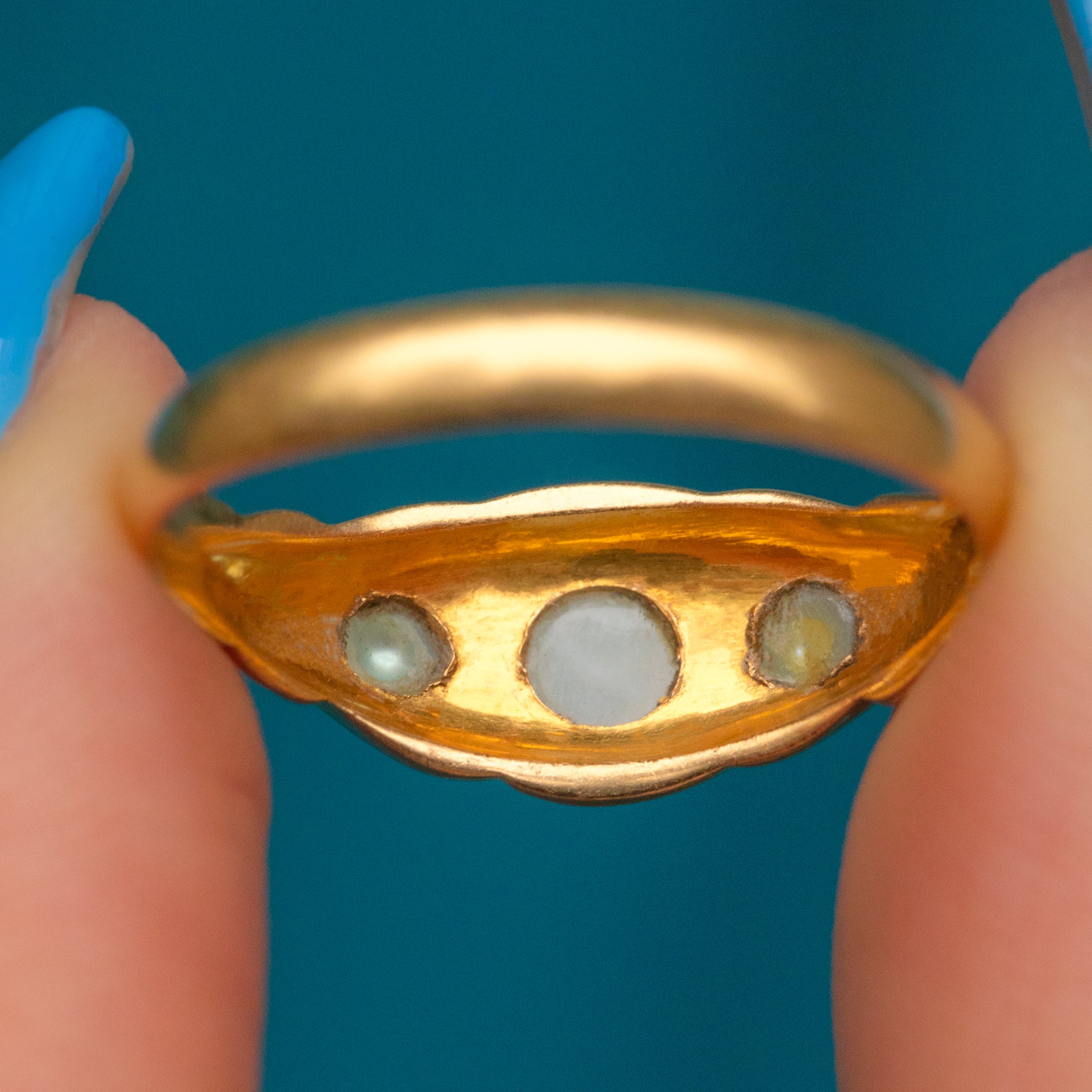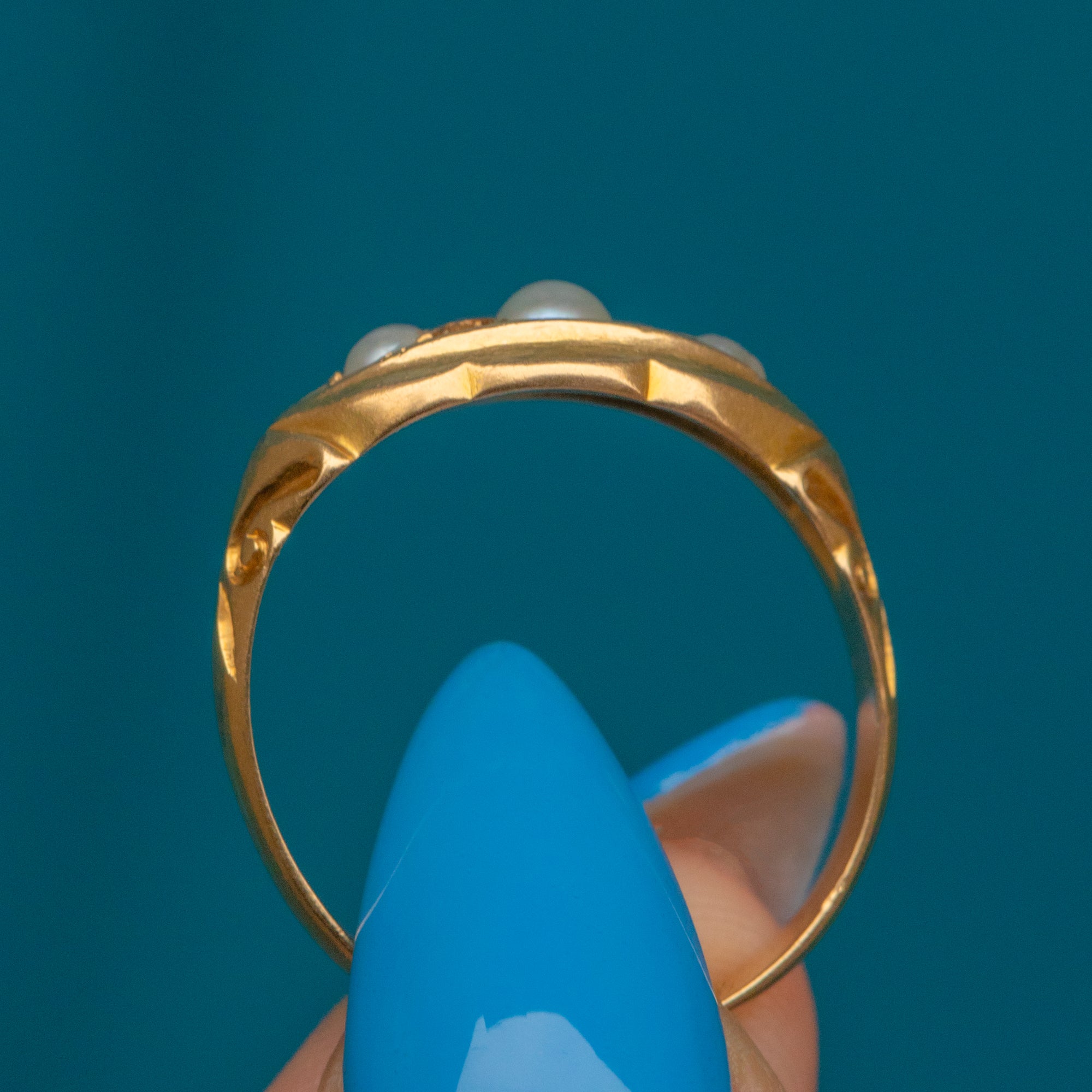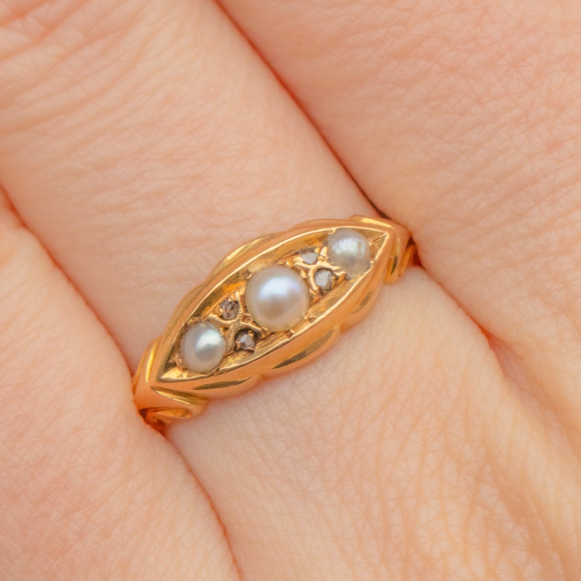 VERY GOOD. This antique 18ct Gold Pearl Diamond boat ring is in very good condition. Her Pearls are all present and well set in their 9ct Gold setting - there is one small dent in one of the Pearls, however this is only noticeable under close inspection. Aside from some age related wear to the surface of the Gold, she is in great antique condition and ready to be worn straight from your pink Lillicoco box.