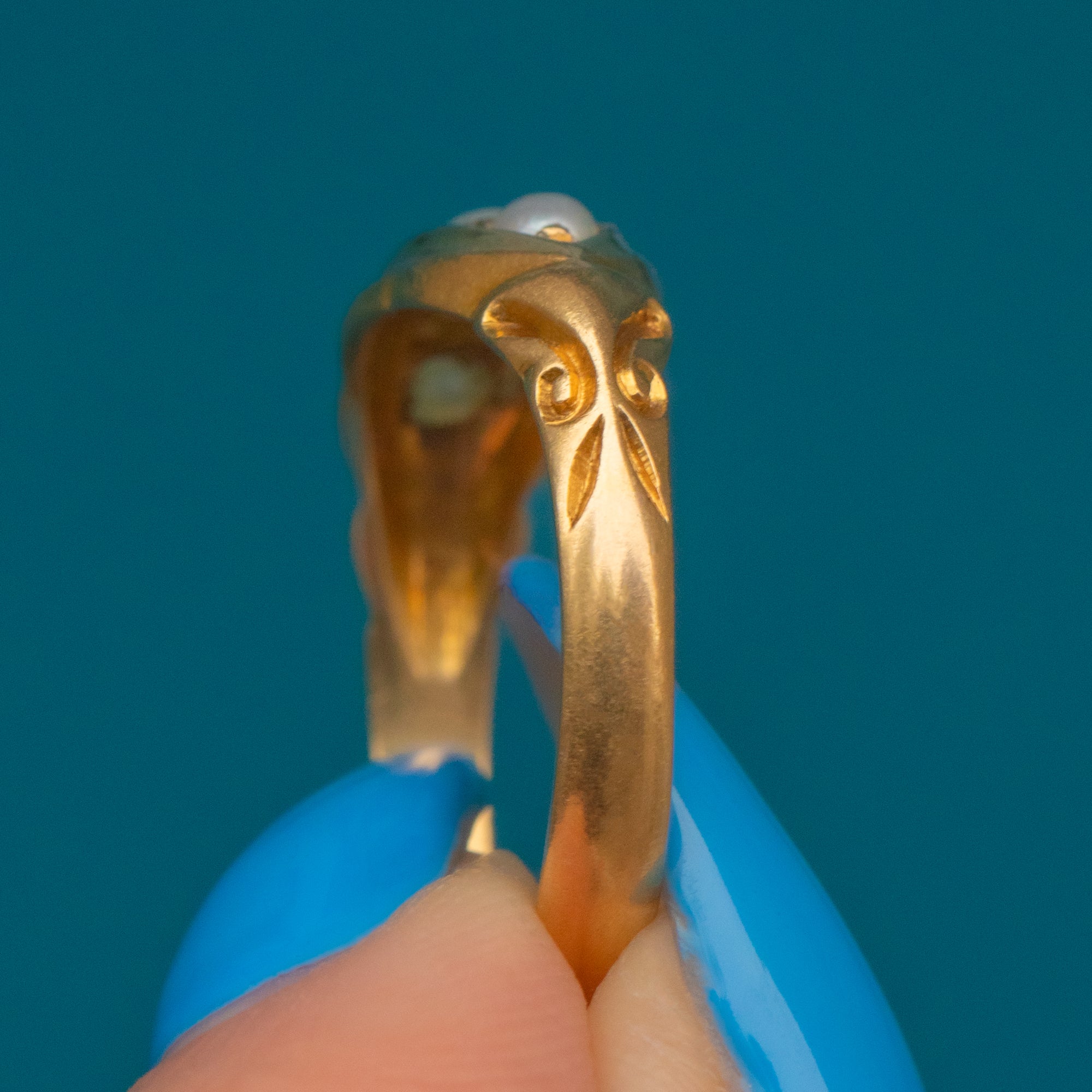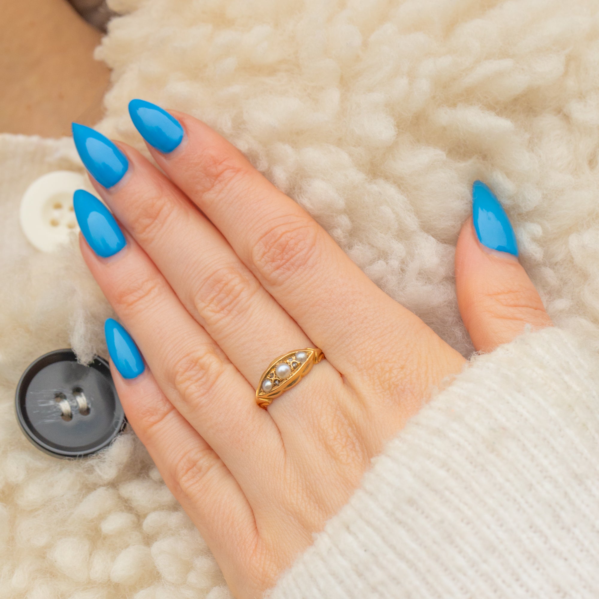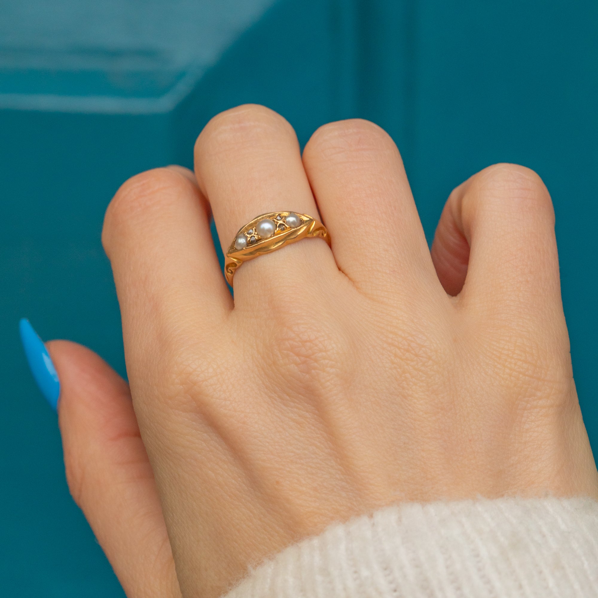 VERY GOOD. This antique 18ct Gold Pearl Diamond boat ring is in very good condition. Her Pearls are all present and well set in their 9ct Gold setting - there is one small dent in one of the Pearls, however this is only noticeable under close inspection. Aside from some age related wear to the surface of the Gold, she is in great antique condition and ready to be worn straight from your pink Lillicoco box.
