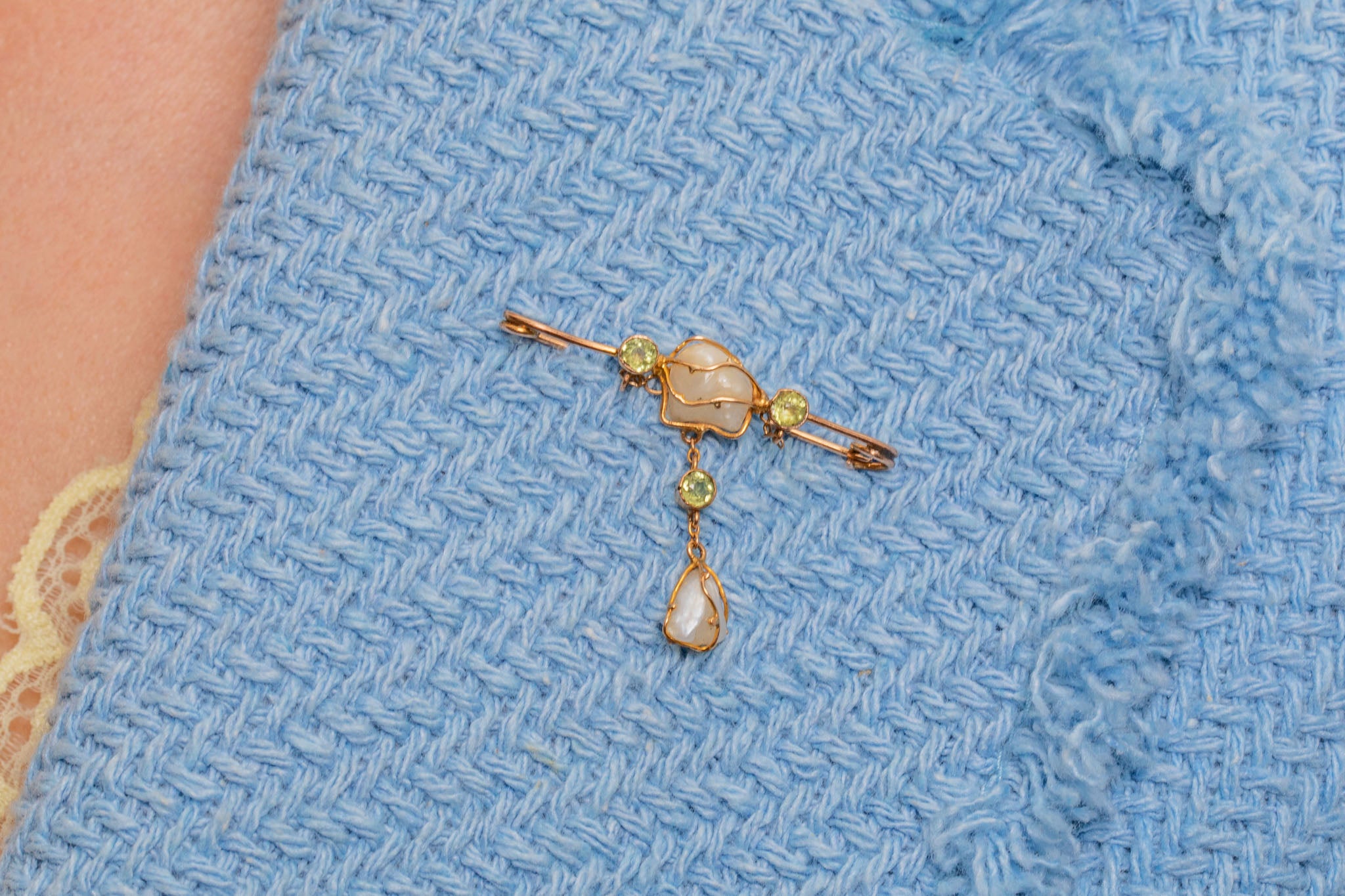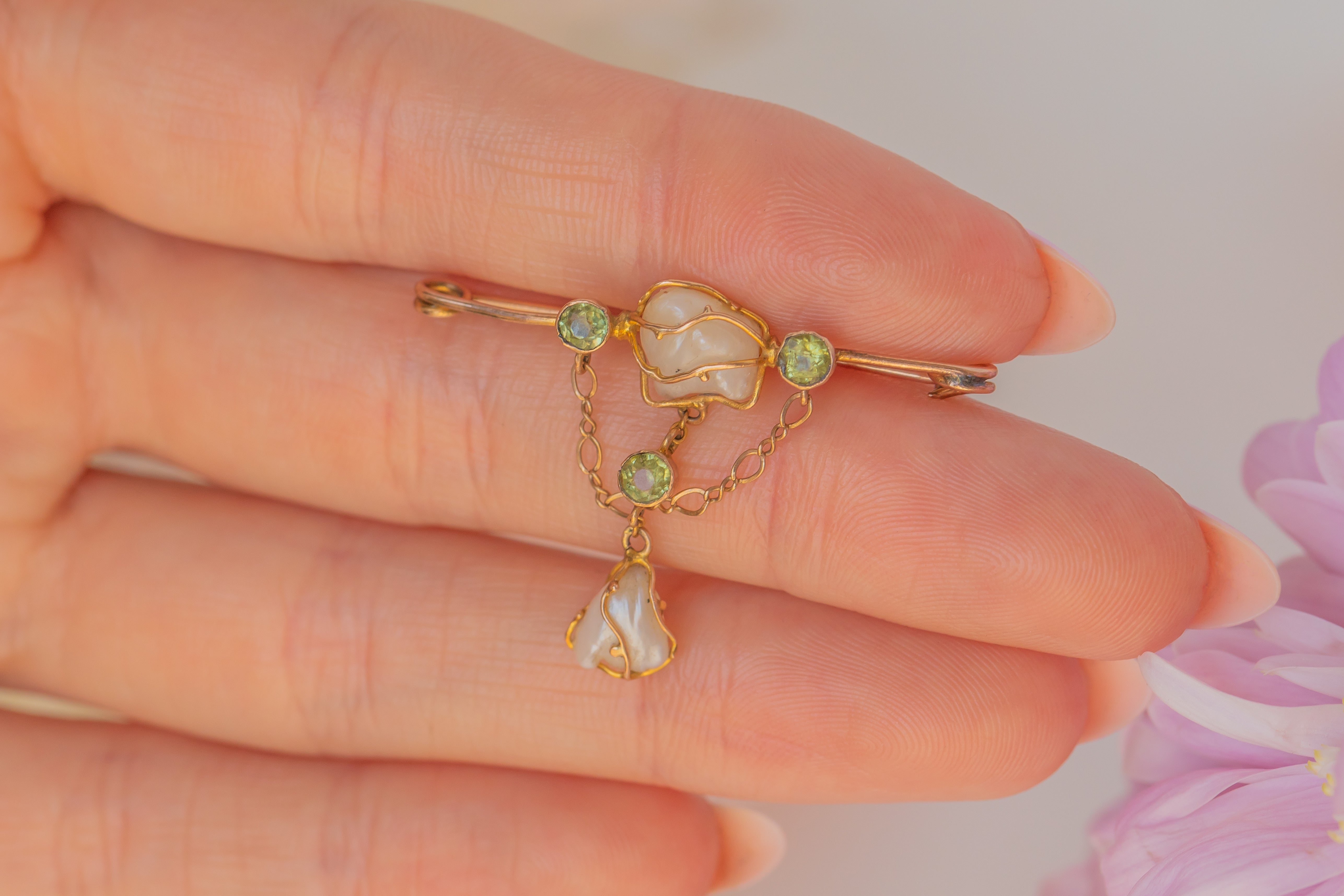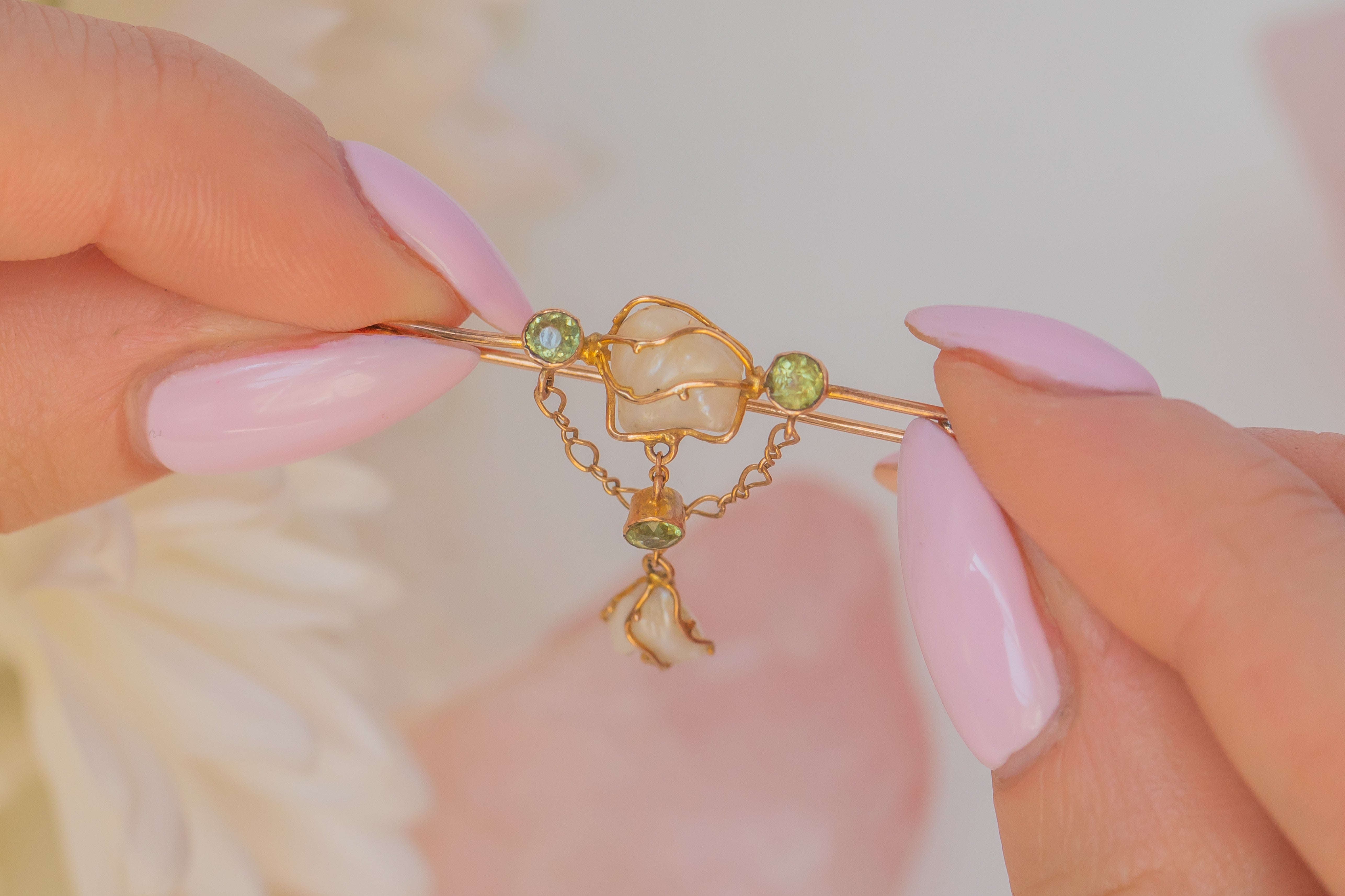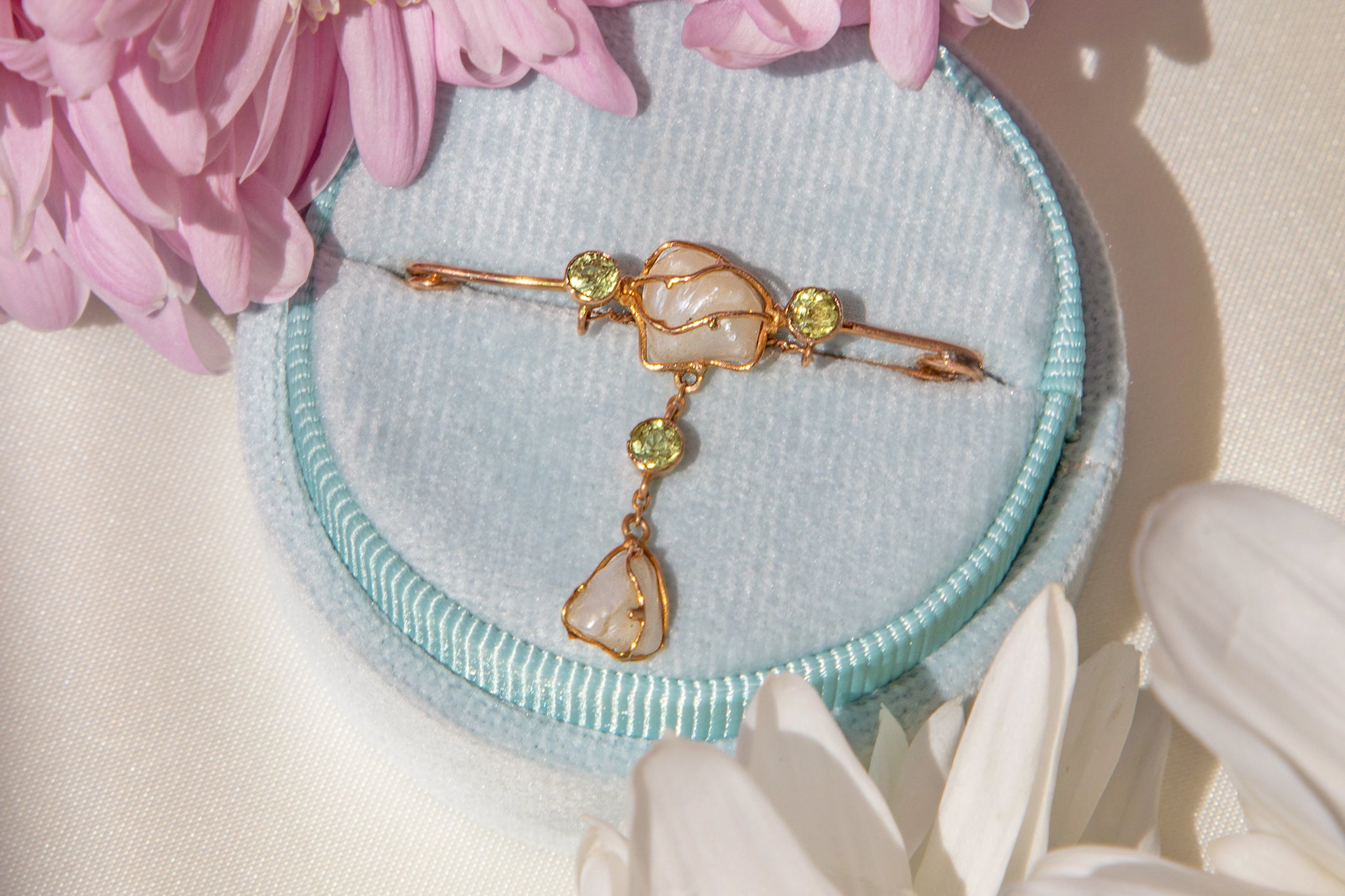 アンティーク 9ct ゴールド パール ペリドット ブローチ