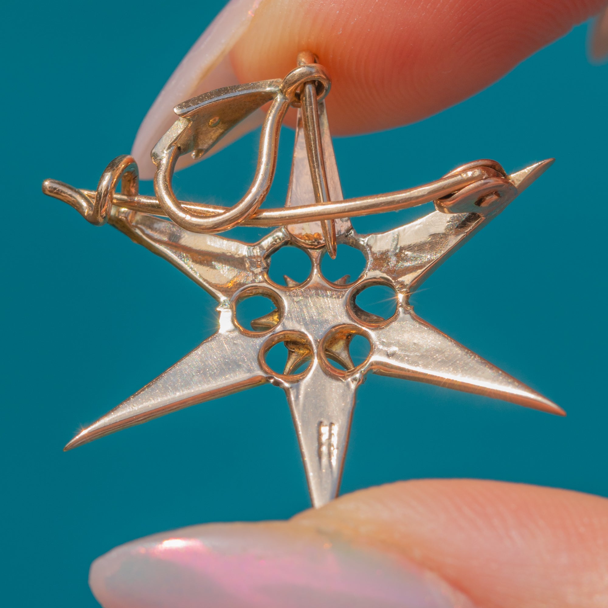 This gorgeous six-pointed star will add bundles of celestial charm to your outfit! Finely crafted from radiant 9ct Gold and studded with shimmering Pearls, this piece of Victorian jewellery can be worn as a pendant suspended from a chain or pinned to your lapel with use of the brooch fittings.