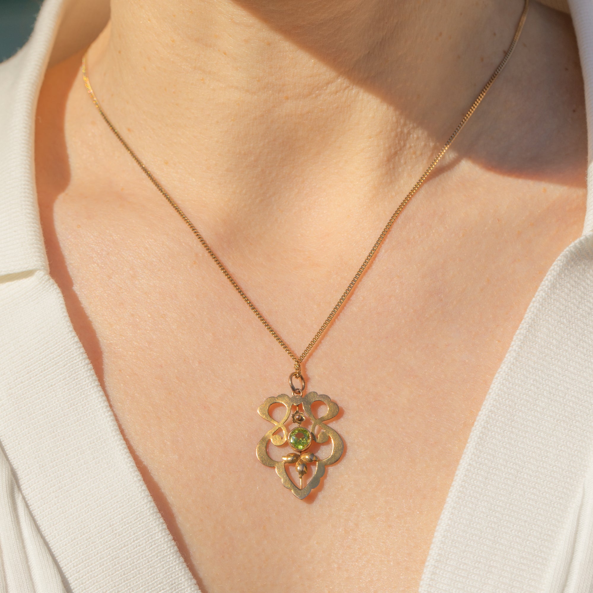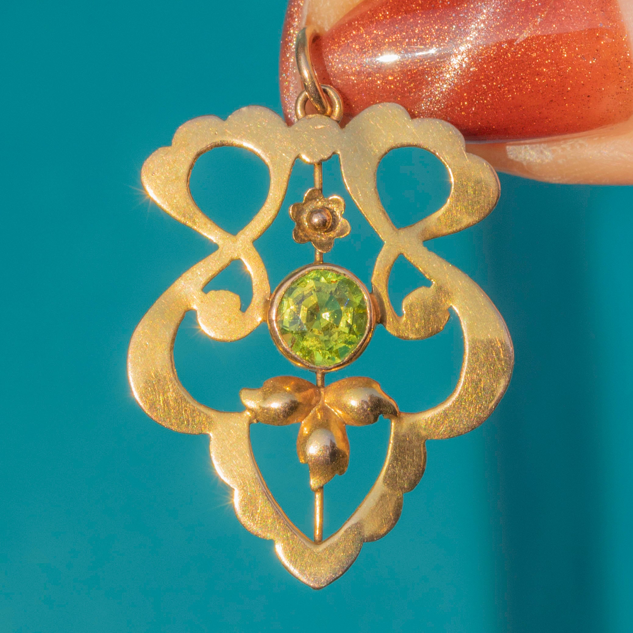 A whimsical antique 9ct Gold Peridot Lavalier pendant! This classic Edwardian treasure embraces all that was so loved about the era, with clean, flowing lines and a feminine appeal.