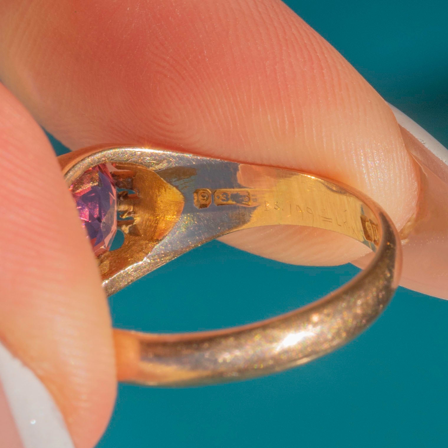 EXCELLENT. This antique 9ct Gold Pink Tourmaline buttercup set ring is in excellent condition. The Pink Tourmaline has such a gorgeous hue, and the claws of the buttercup settings are all present keeping the stone secure. The ring has kept its shape well, and the hallmarks are still super crisp.