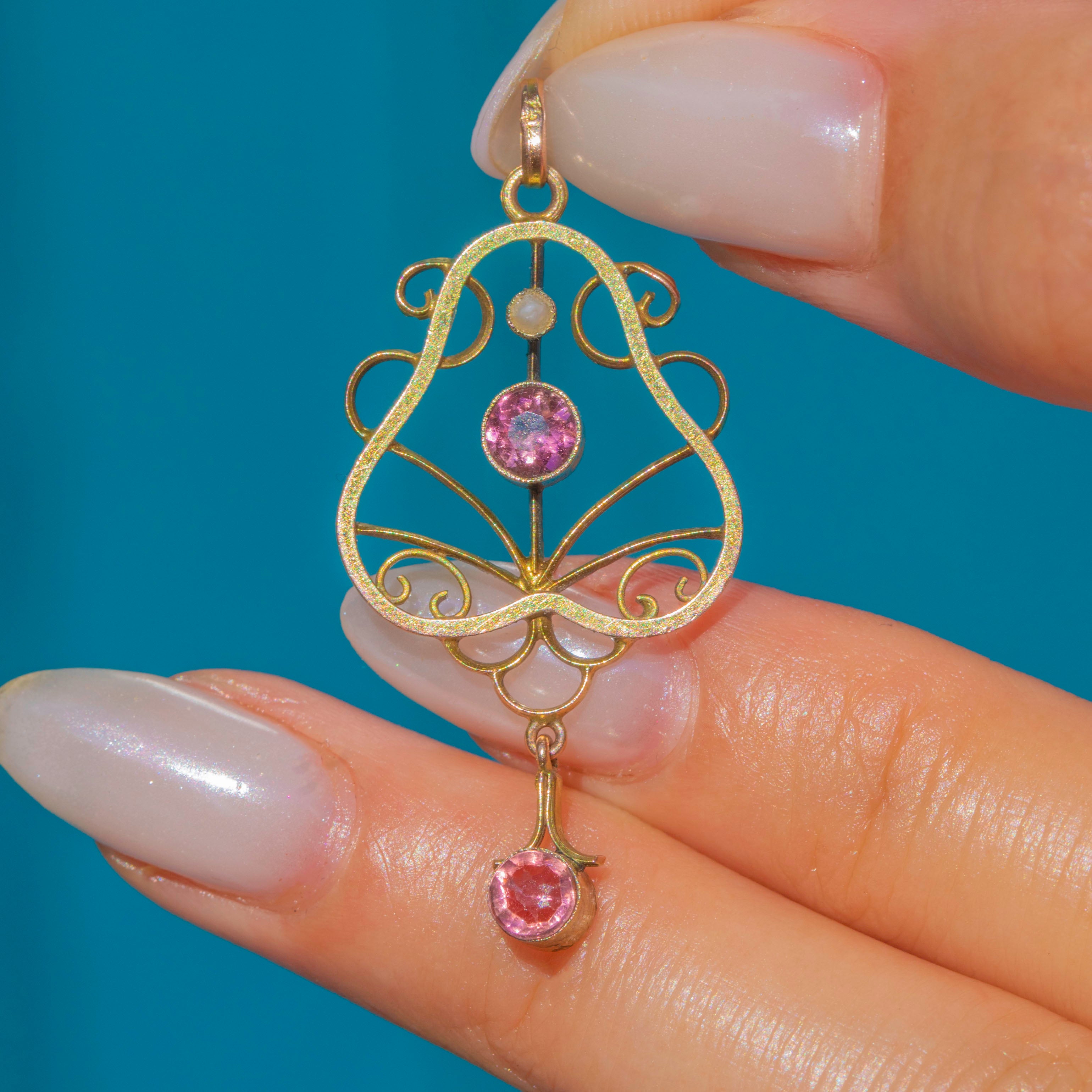 Antique 9ct Gold Pink Tourmaline Pearl Lavalier Pendant