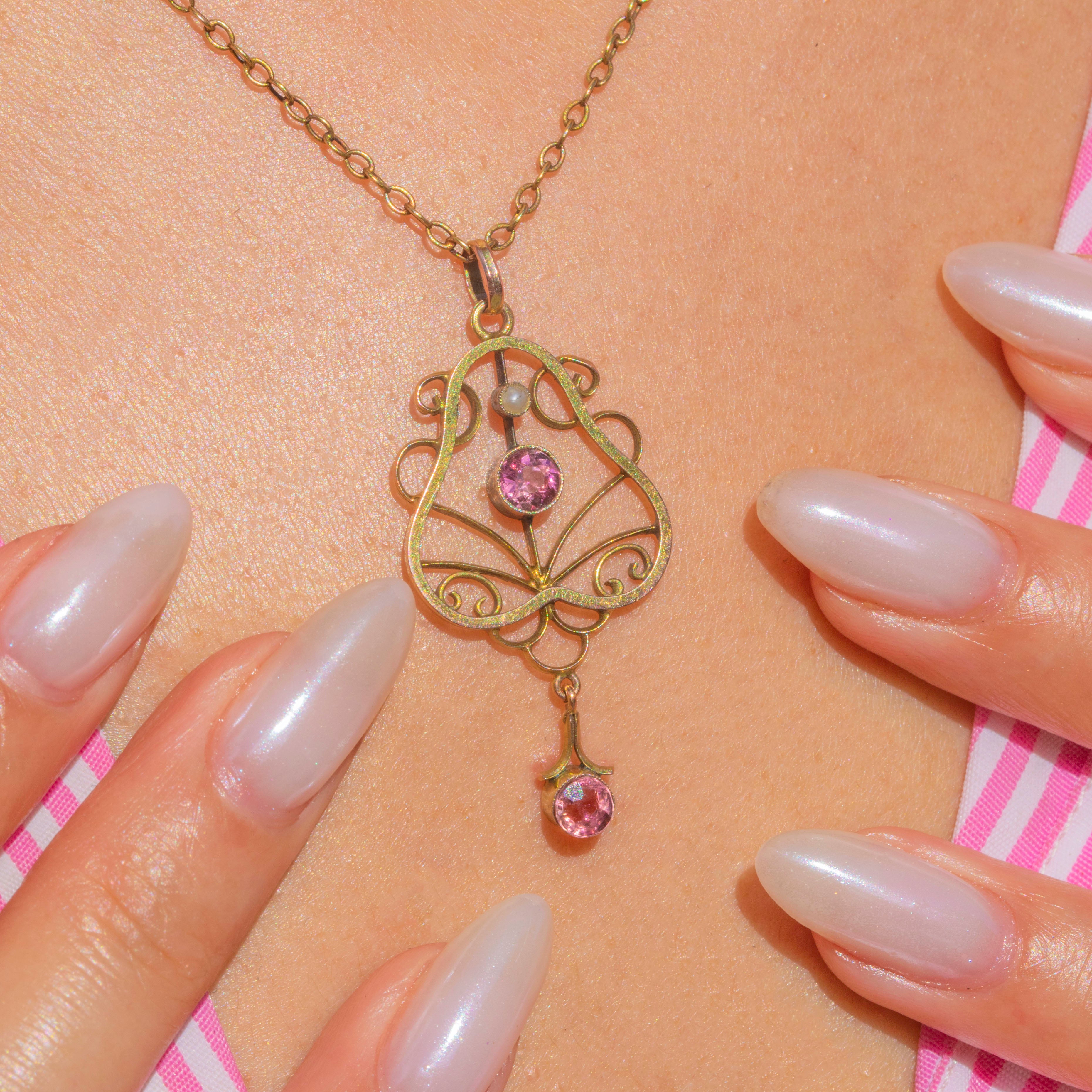 Pretty in pink, this pink Tourmaline pendant is perfect for lovers of Edwardian treasures. The pendant has a wispy and feminine form that perfectly captures the delicate designs of the era!