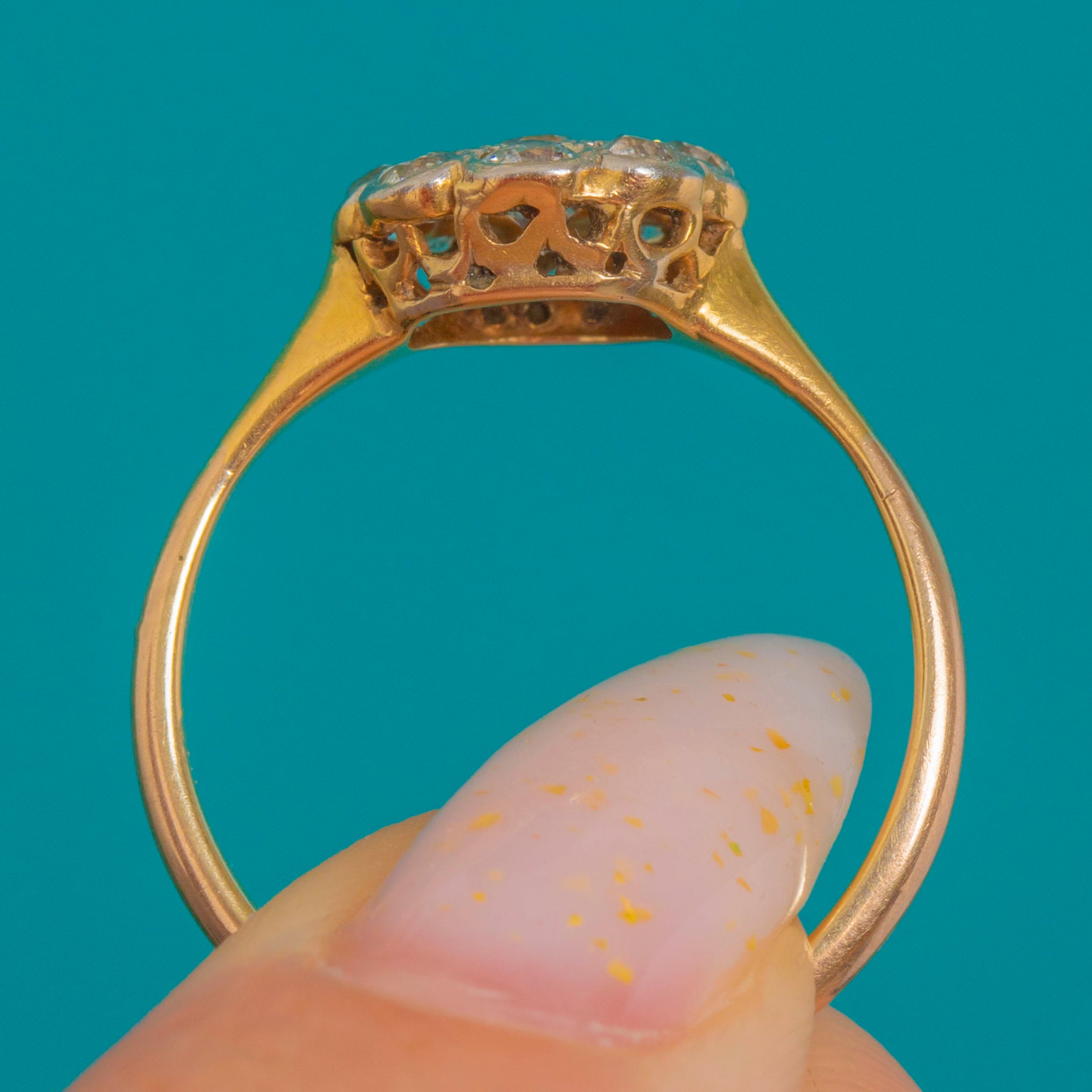 EXCELLENT: Diamonds are bright and well-matched with no obvious chips or abrasions, all securely set within crisp millegrain collets. The 9ct Gold shank shows only light surface wear consistent with age; the Platinum settings and openwork gallery remain well-defined. No obvious resizing seams or restoration work visible.