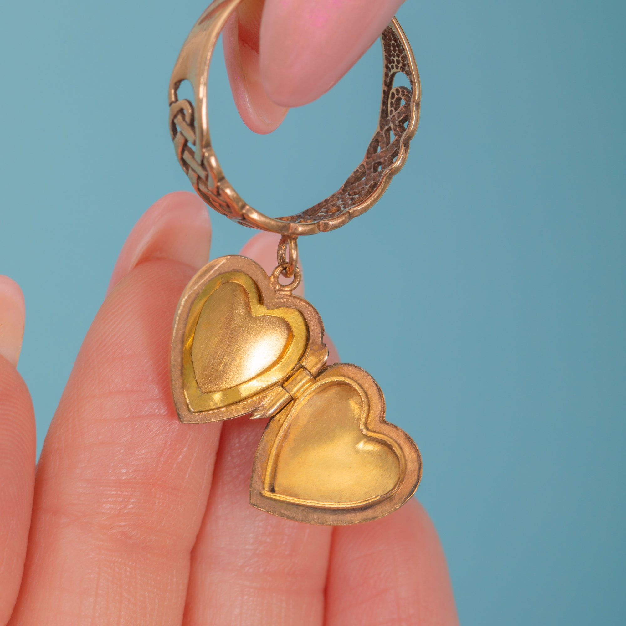 This antique 9ct Gold ring, complete with a romantic heart locket, is exquisite! Truly unique, her Edwardian features are whimsical and charming, with an intricately detailed band and engraved locket adding a touch of decadence.