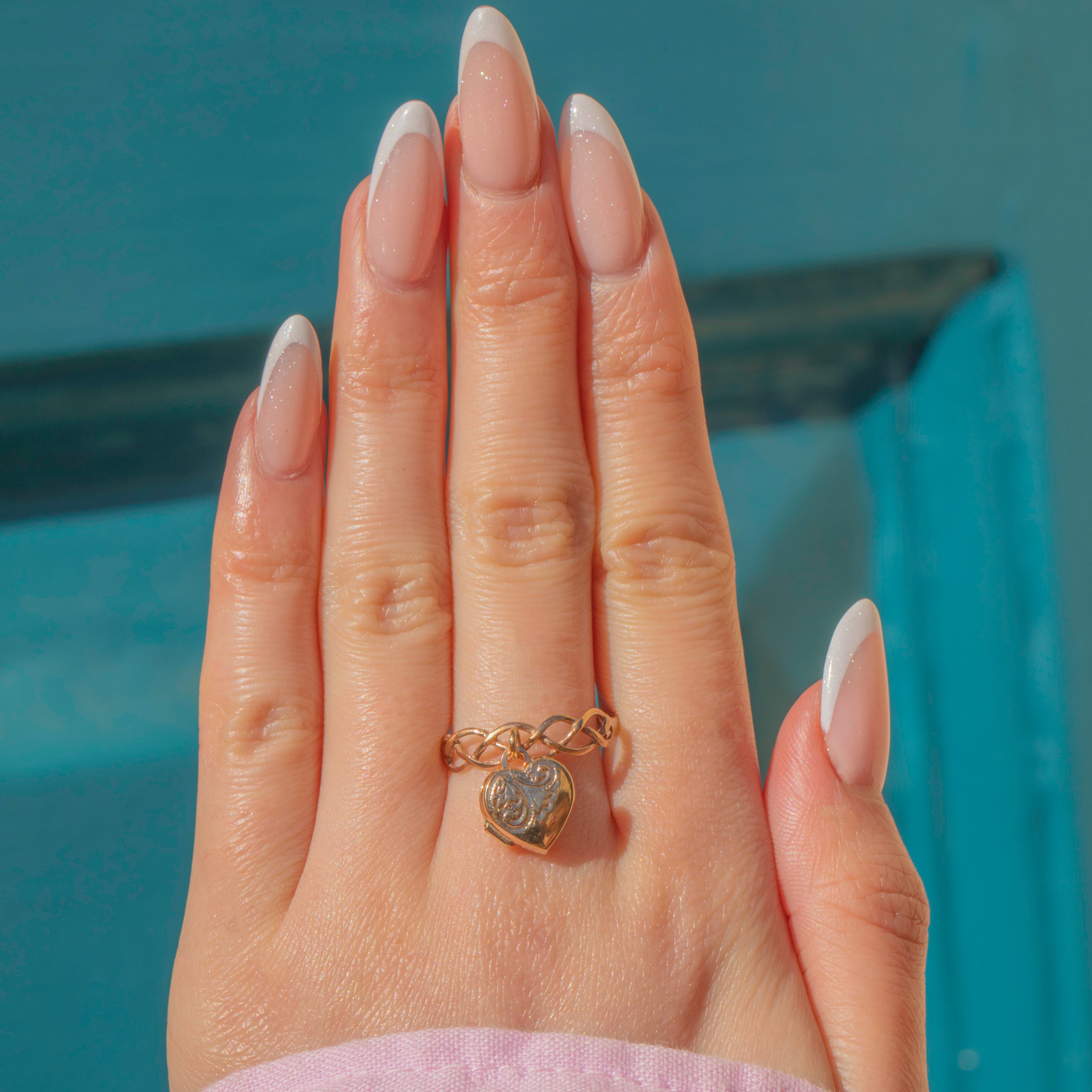 Her woven band adds a lovely touch of decadence, and she is complete with a heart locket charm with space for two photographs. A romantic and sentimental choice, this Edwardian Gold locket ring would make a lovely addition to your collection.