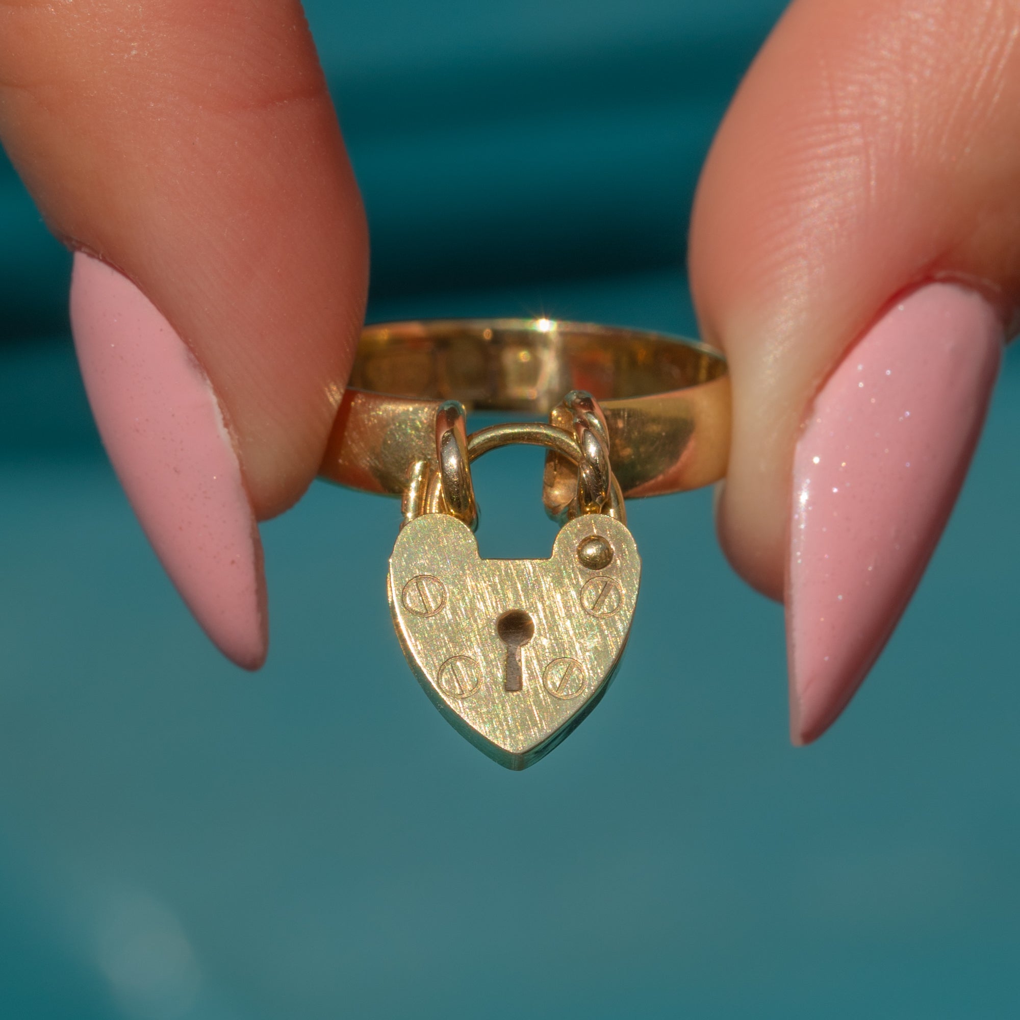 VERY GOOD-EXCELLENT: This antique 9ct Gold heart padlock ring is in lovely condition. The Gold is lustrous and buttery, with only some minor age-related surface wear. The attachments suspending the padlock do not match completely, likely due to a replacement from a previous repair, though this simply adds to her unique charm! In great condition, you can enjoy wearing this ring every day with confidence!