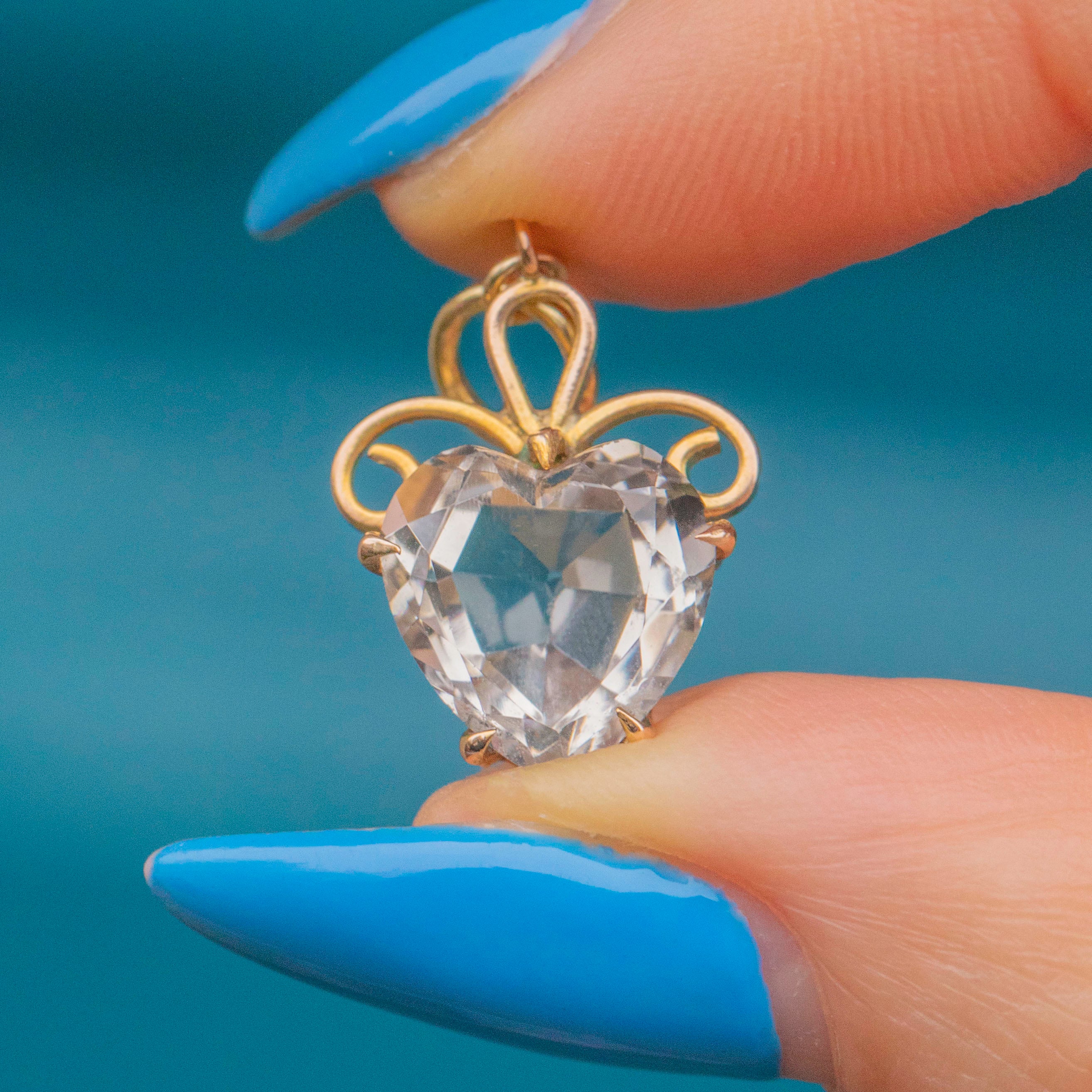 VERY GOOD-EXCELLENT. This antique 9ct Gold Rock Crystal heart charm is in lovely condition. Her Rock Crystal is wonderfully faceted, with only a minor inclusion - we like to see this as a little nod to Mother Nature! She sits securely within her claw settings and with a soldered jump ring, is in great condition.