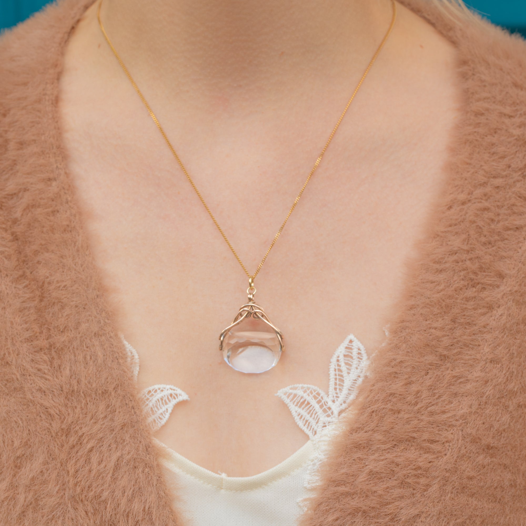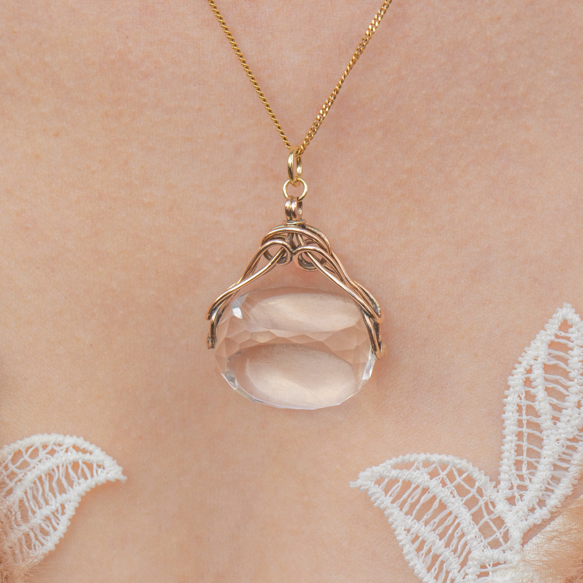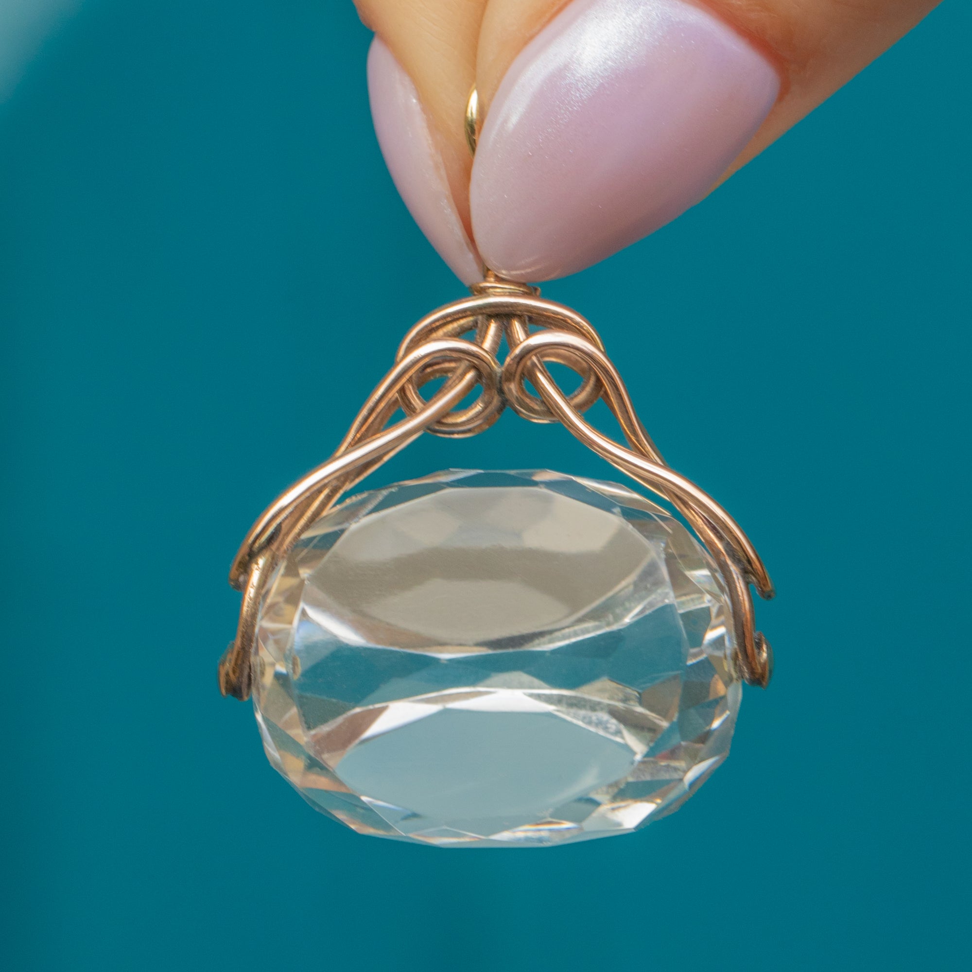 How impressive is this antique 9ct Gold Rock Crystal spinner fob pendant! Held within the arch of her smooth and buttery 9ct Gold bale is a beautifully faceted Rock Crystal that spins effortlessly, catching the light from every angle.