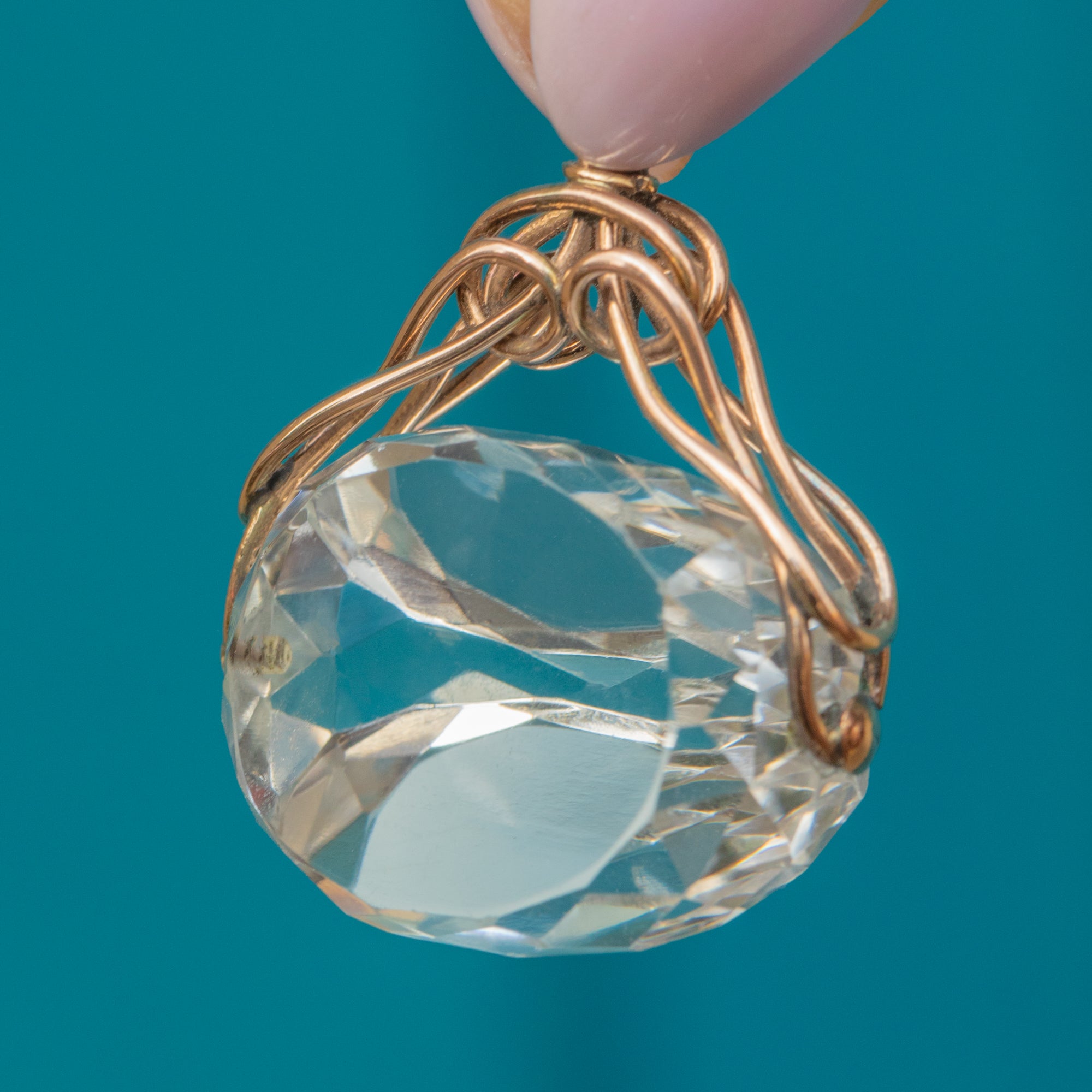 EXCELLENT. This antique 9ct Gold Rock Crystal spinner fob is in wonderful condition throughout. Her 9ct Gold has accrued a gorgeous rosy tone over the years. The icy Rock Crystal is luminous and beautifully faceted, there is one small area that has accrued a nibble or two, but nothing that catches the eye immediately! The spinner is in fine working order and holds the Rock Crystal securely allowing you to wear this striking Victorian fob pendant with absolute confidence.