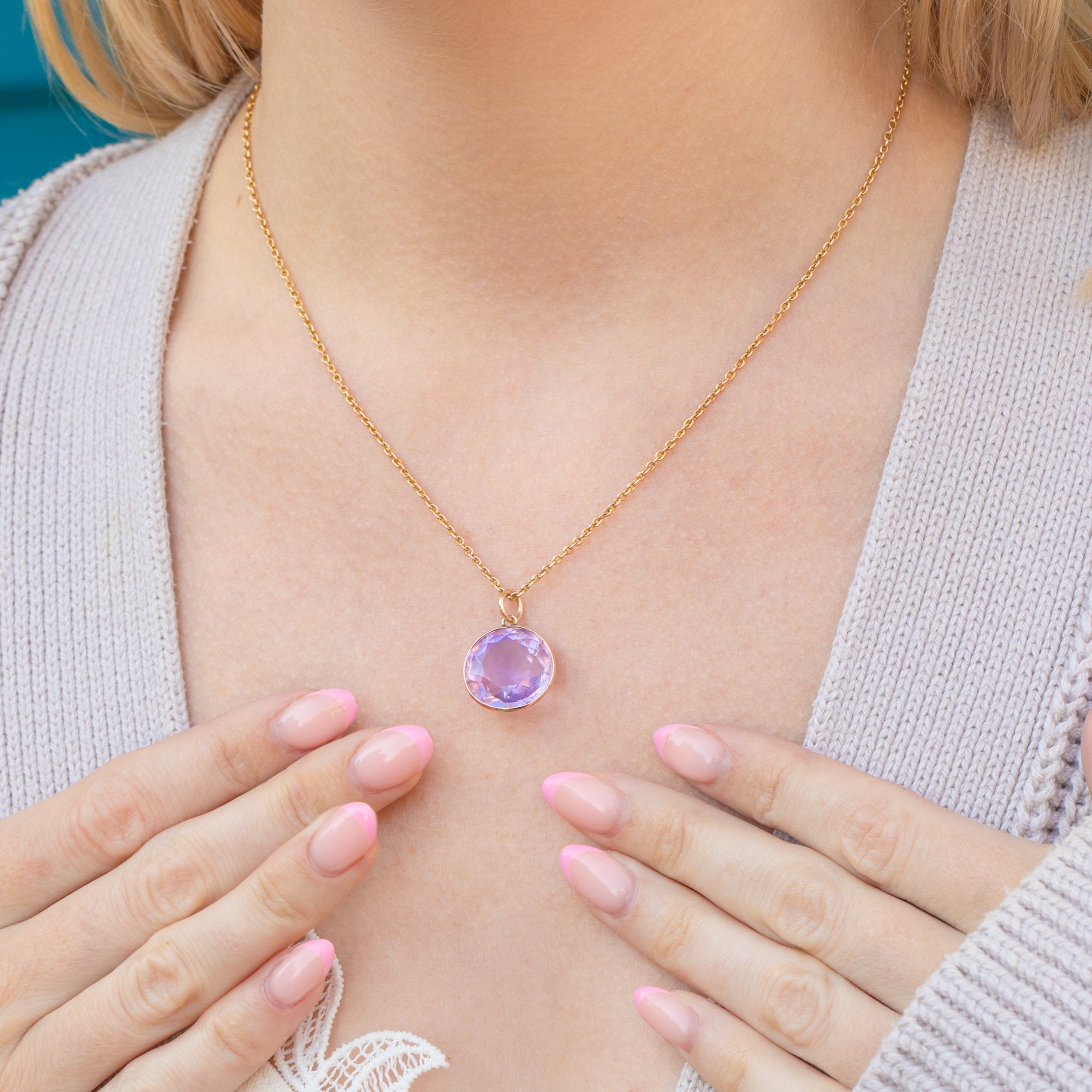 This antique 9ct Gold round Amethyst pendant will add a touch of Victorian elegance to any attire. Boasting a 7.55ct lilac-hued Ameythst with crisp facets, this Victorian pendant catches the sunlight magnificently, like a purple drop of heaven!