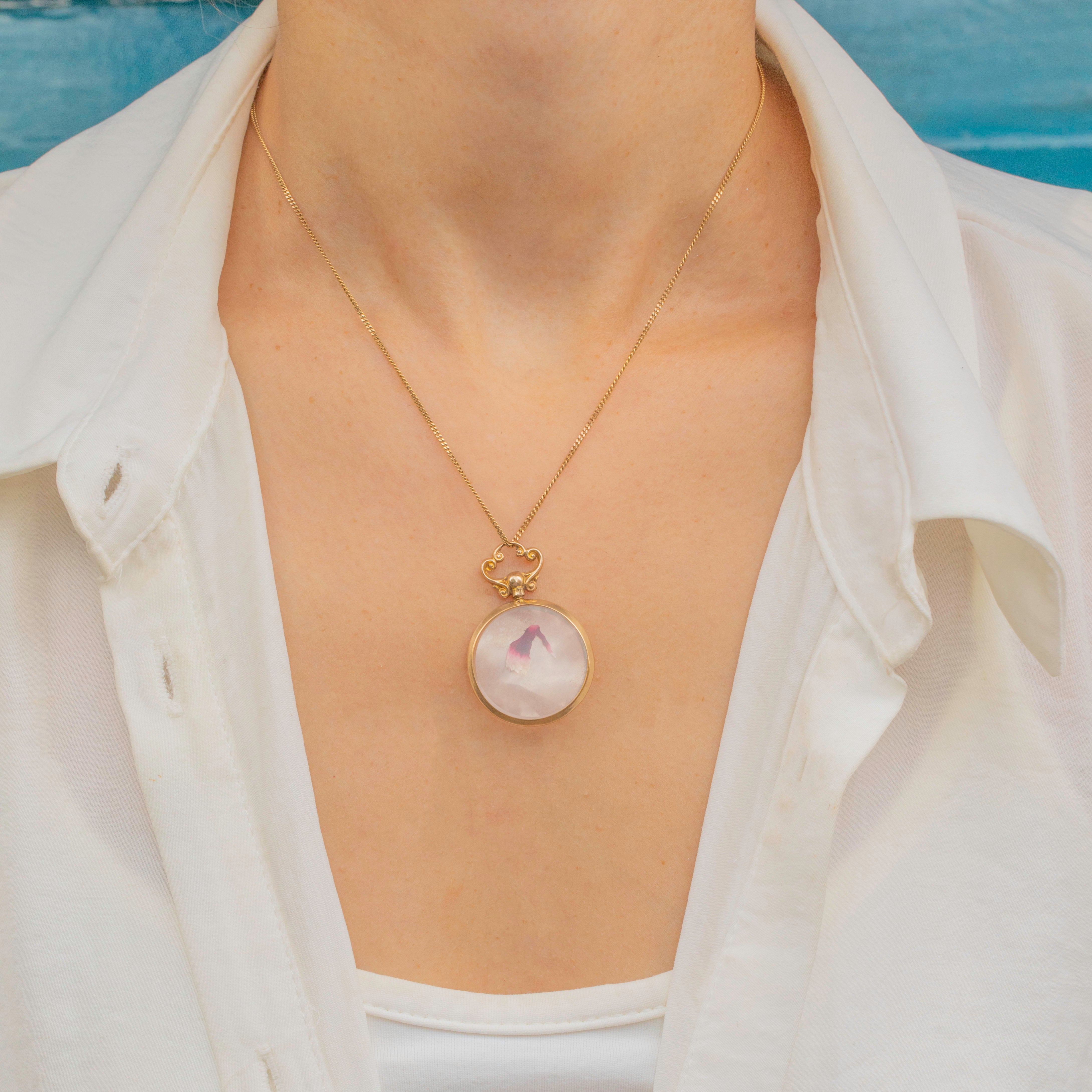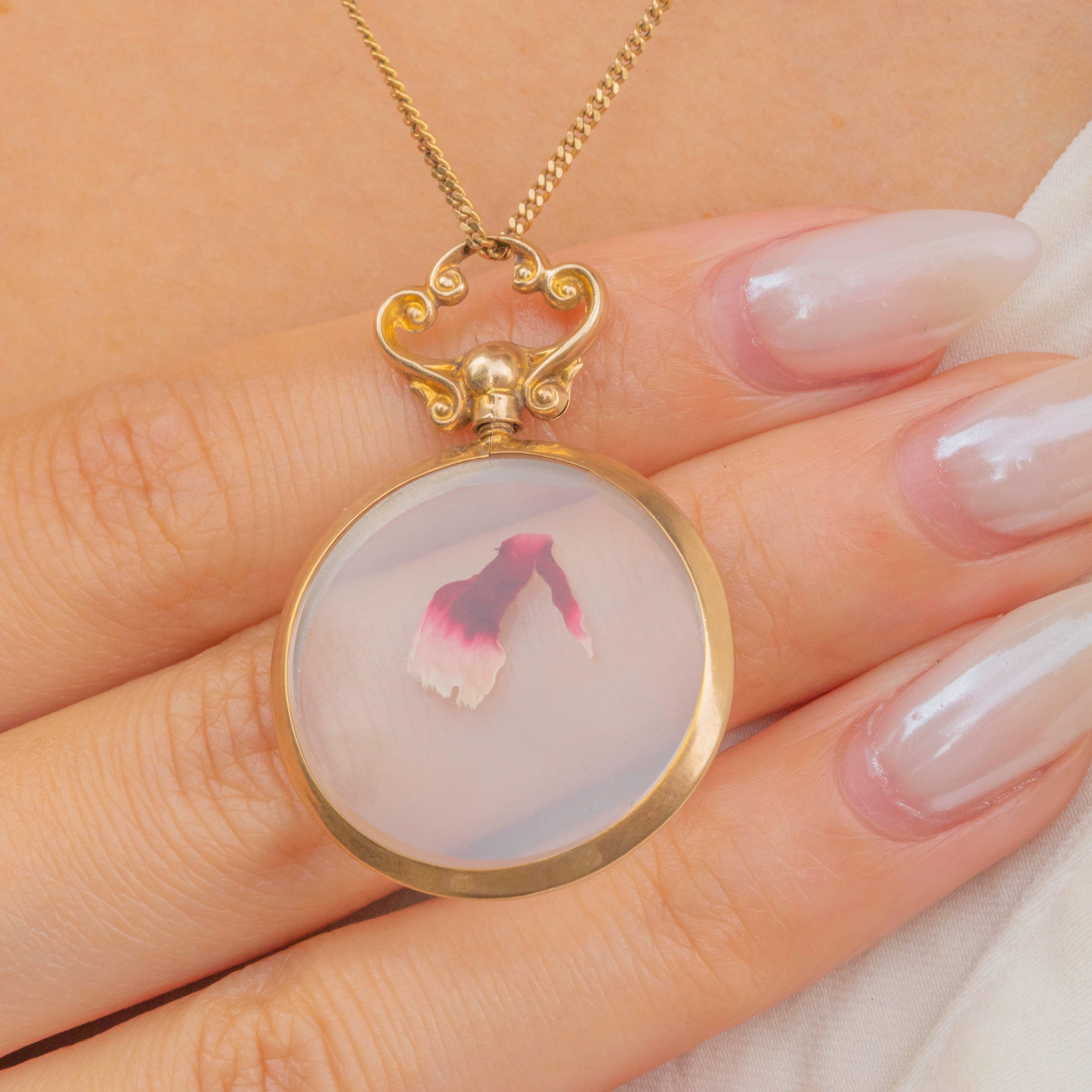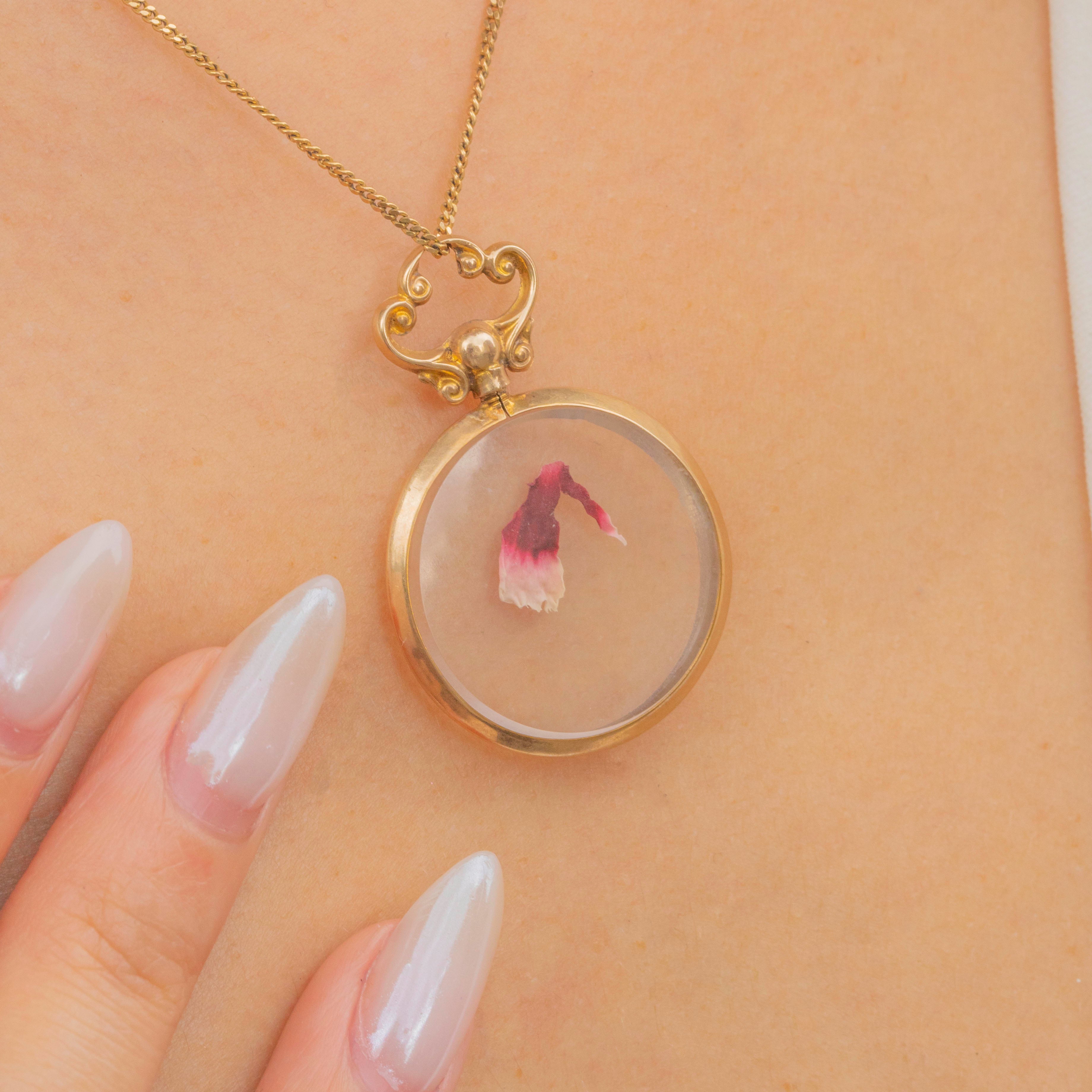 The inside of the locket is currently home to a dried pink flower petal, which has an entirely natural ombre effect, but you can replace it with your own pressed flower or a cherished photograph if you wish.