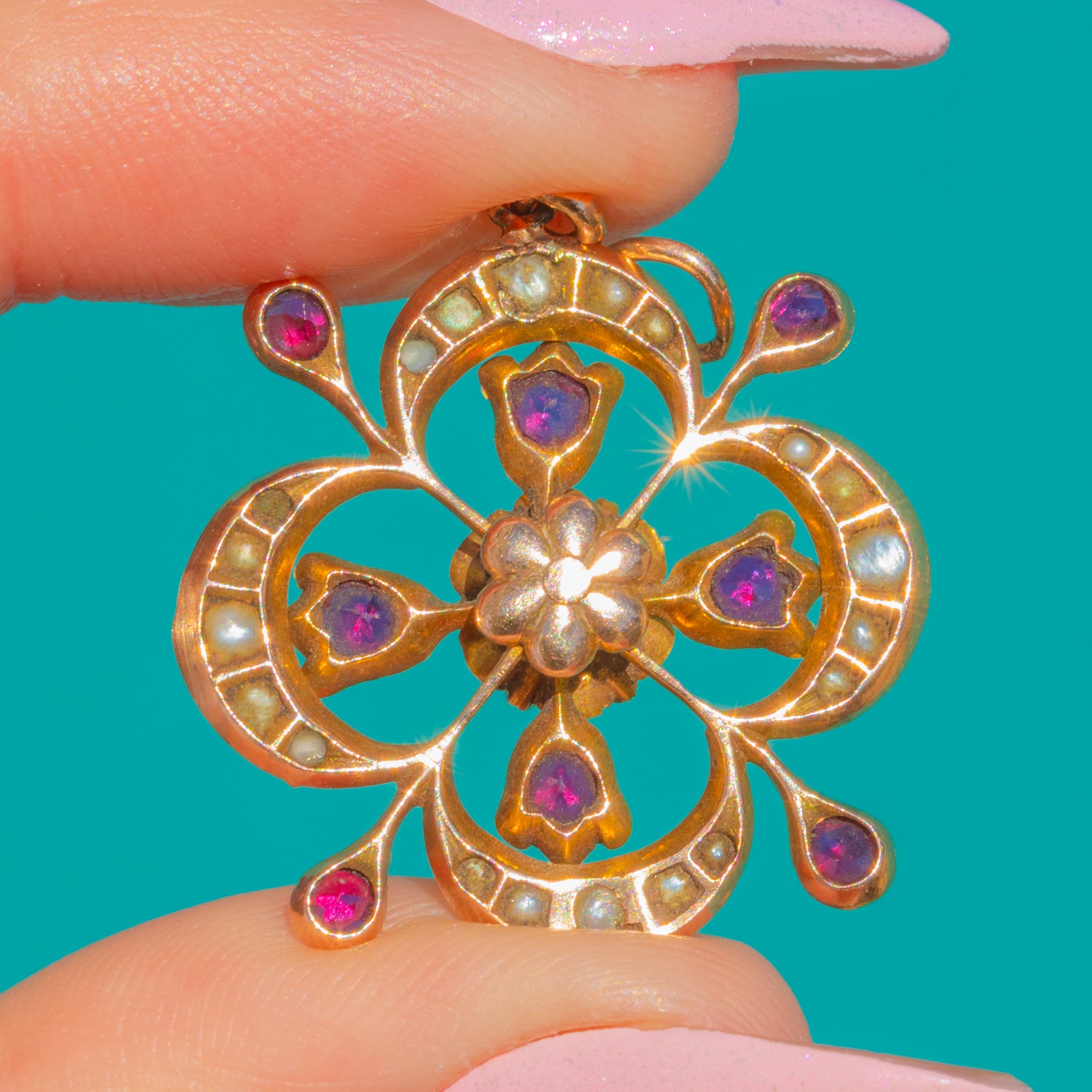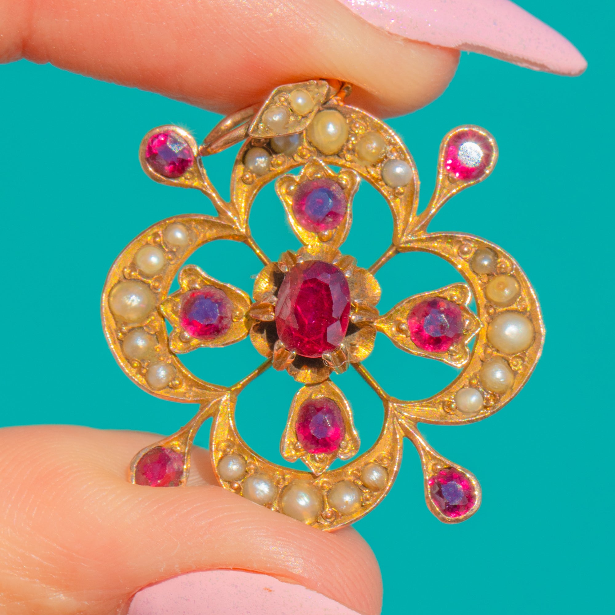 アンティーク 9ct ゴールド ルビー&パール クローバー ペンダント