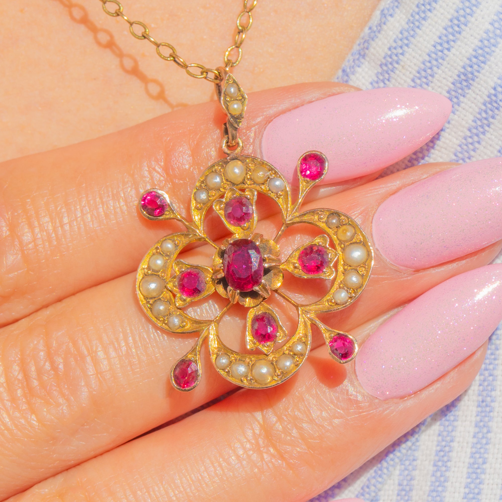 ロマンティックなVictorian期の逸品、こちらの9ctゴールド クローバーペンダントは、鮮やかなナチュラルルビーと上品なナチュラルパールが咲き誇ります。オープンワークのクアトレフォイル(四つ葉)シルエットの中心には、立体的なオーバルカットのルビーが配され、さらにルビーが花びらのように放射状に並び、繊細なパールが曲線をなぞるように柔らかな光輪を描きます。温かみのあるゴールドの色調と精緻なディテールが、優雅で受け継がれるべき存在感を与えています。