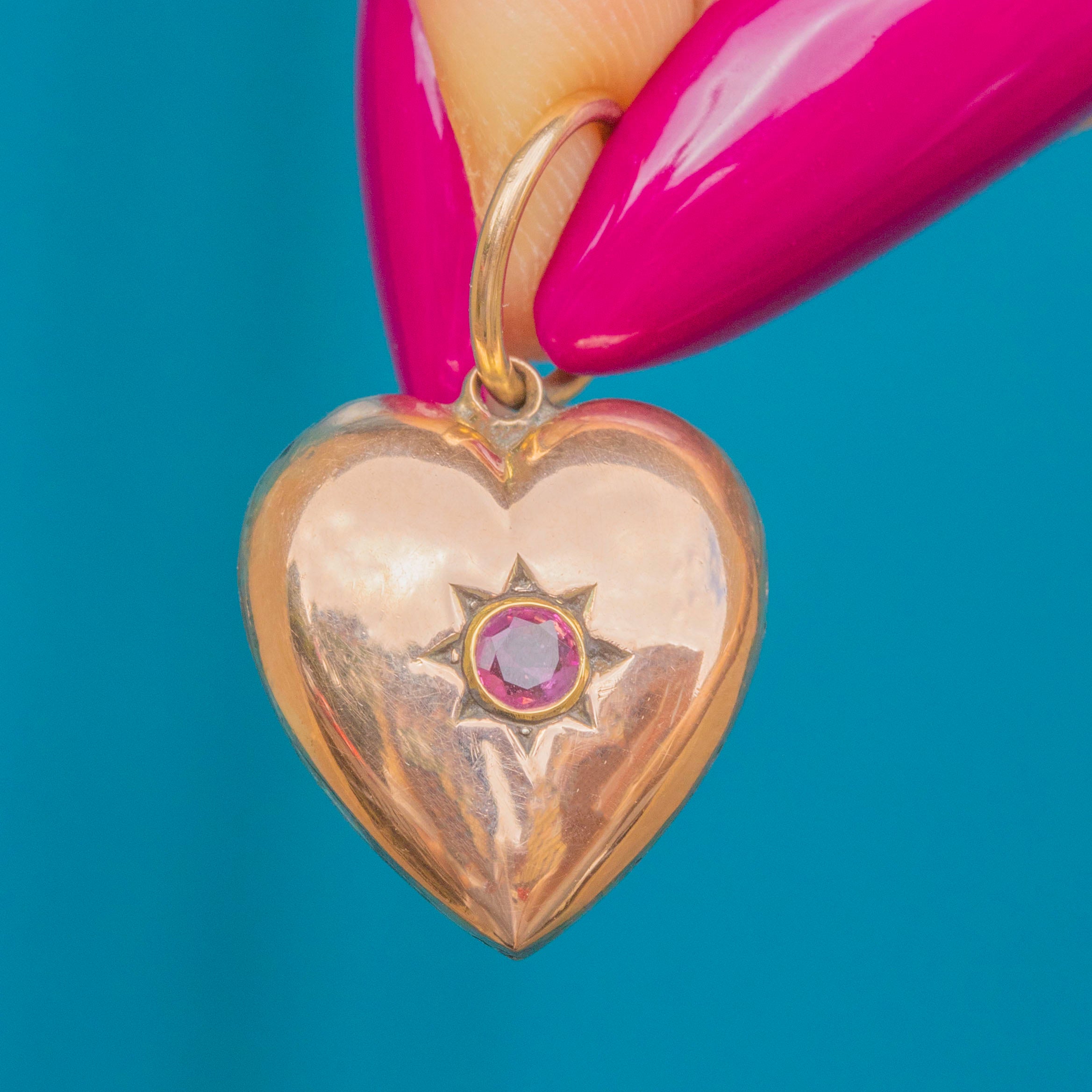 This Victorian charm is adorned with a fuchsia-hued Ruby displayed in a celestial star setting, providing ample antique allure. Inscribed for a loved one on the back, this antique heart charm is an undeniably romantic piece to gift or add to your collection!