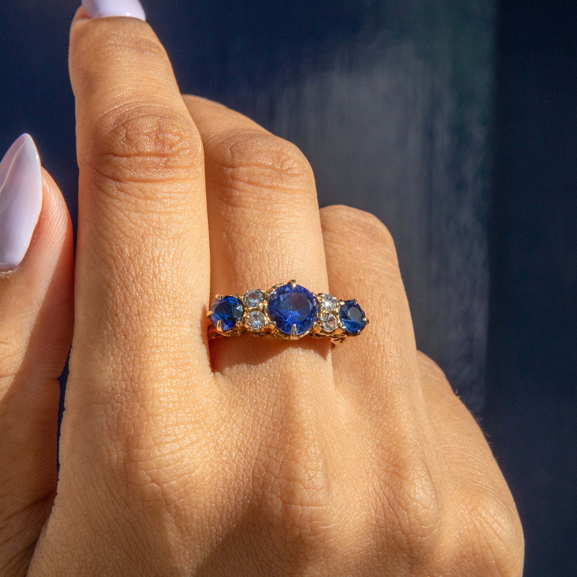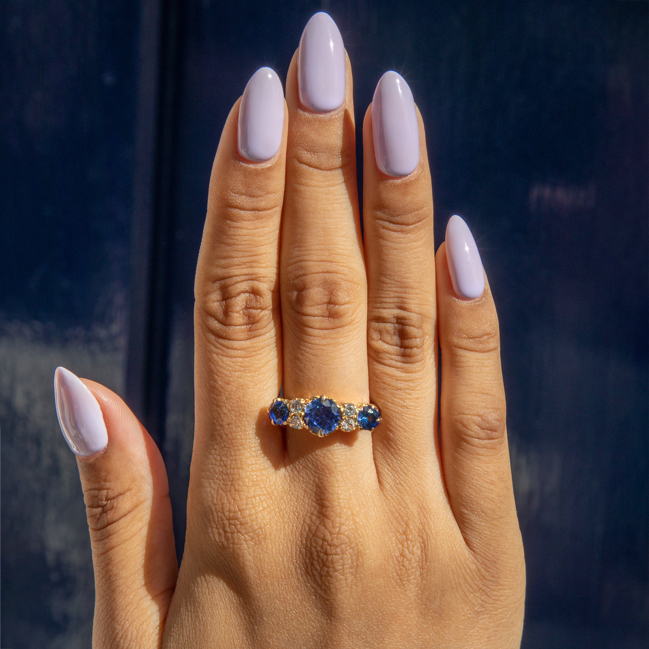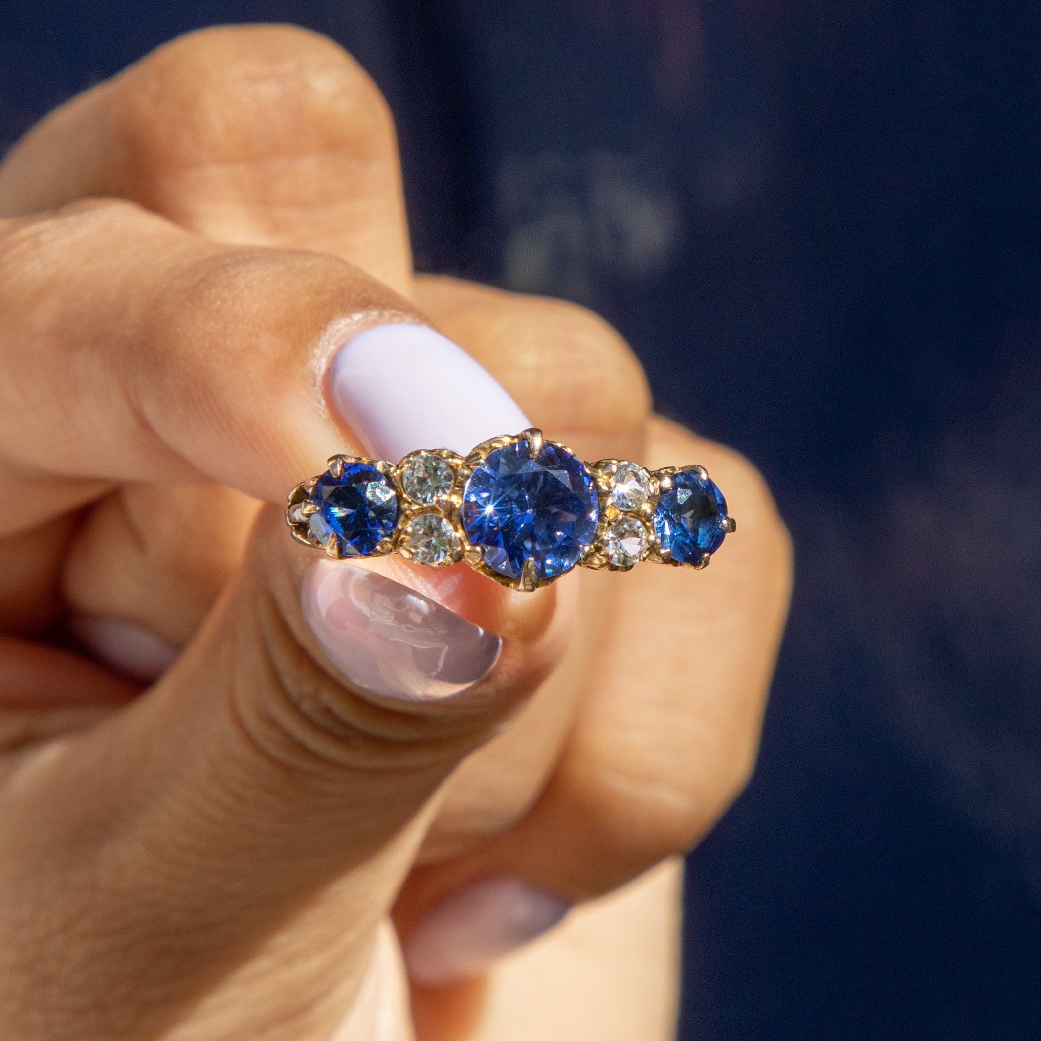 アンティーク エドワーディアン 9ct ゴールド サファイア スリーストーン リング、1.35ct