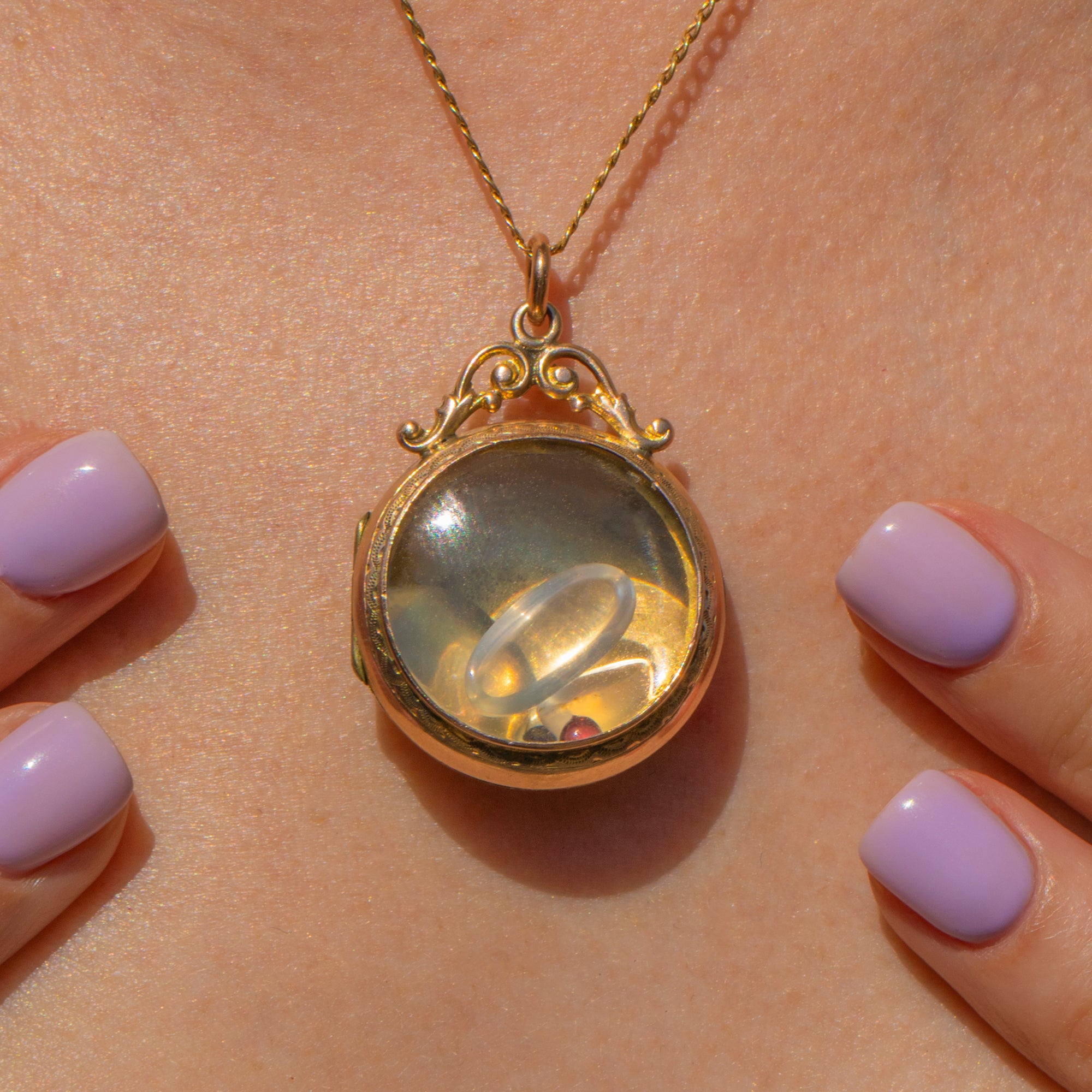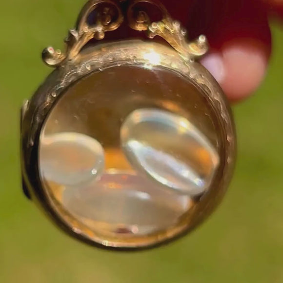 This antique 9ct Gold shaker locket will make a fun addition to your repertoire! Suspended from an ornate bale, watch as her Moonstones and Garnets dance behind the glass, with space to add more gemstones of your own for a personal touch.