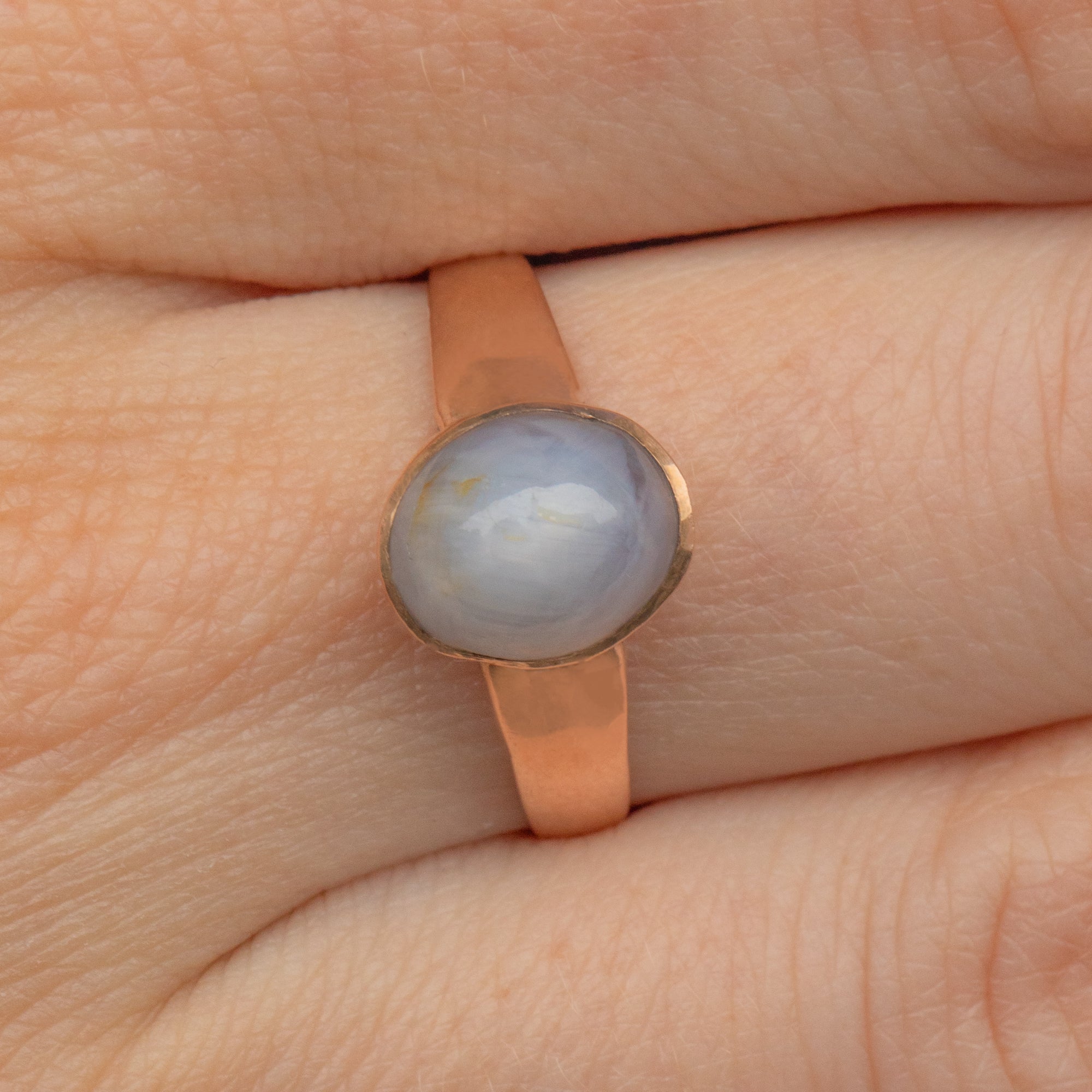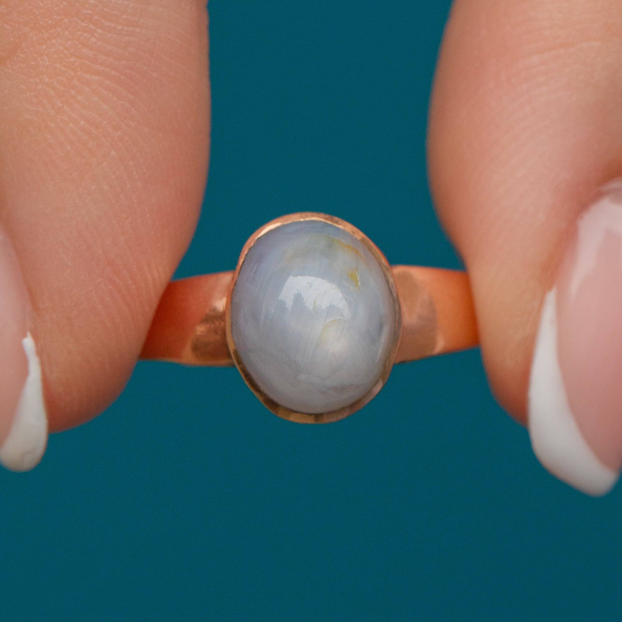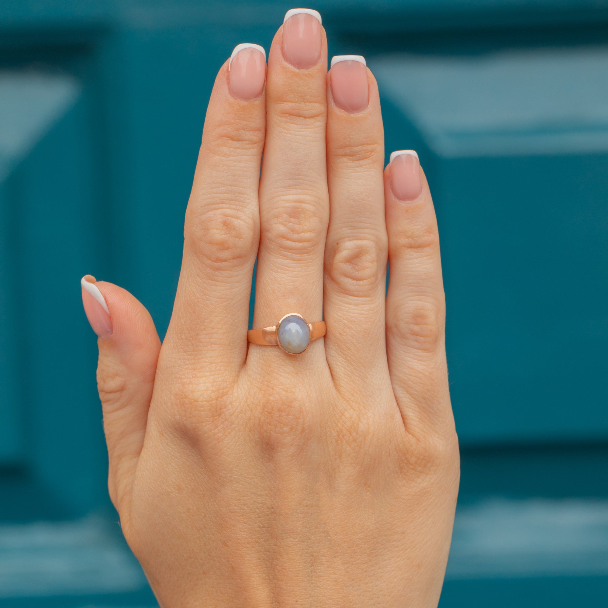 Add some celestial charm to your repertoire with this antique 9ct Gold star Sapphire ring! Homing a cloudy lilac 3.45ct Sapphire cabochon, as the light glides over her smooth surface a six point star reflects off of her surface, a testement to the wonders of mother nature.
