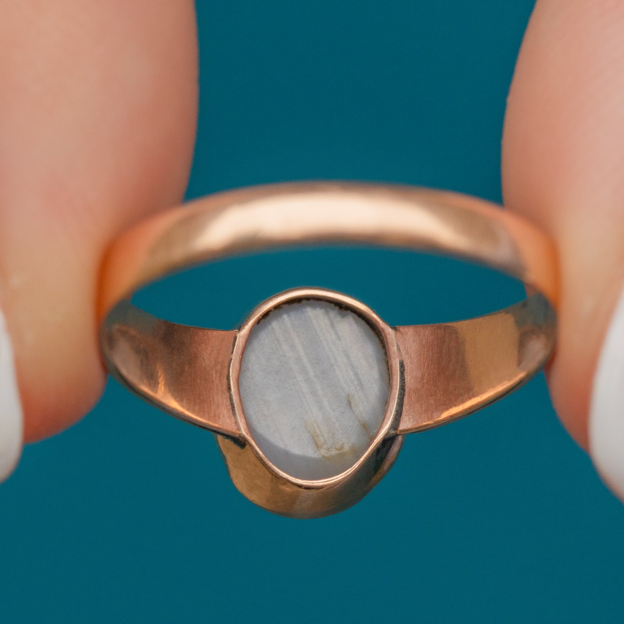 VERY GOOD. This antique 9ct Gold star Sapphire ring is in very good condition! The Sapphire is set securely within the bezel setting, and although there is some subtle wear to the cabochon surface, the asterism is profound beneath the light. There are some trace elements to the Sapphire but we feel this is an ode to the powers of Mother Nature herself. There is some darkening to the grooves of this Victorian ring and a solder mark to the inside of the band, but rest assured she wears comfortably and securely. A remarkable addition to any antique jewellery collection!