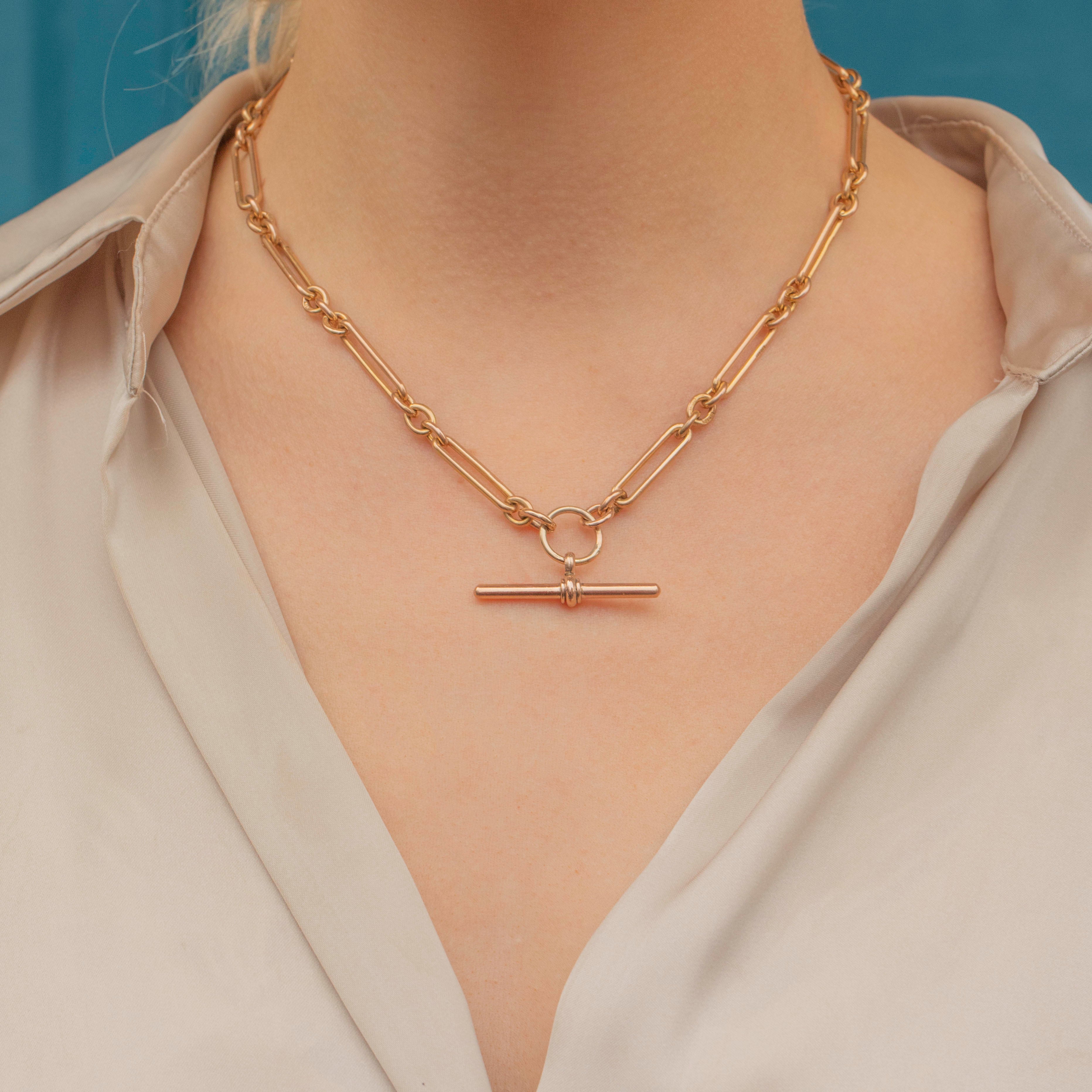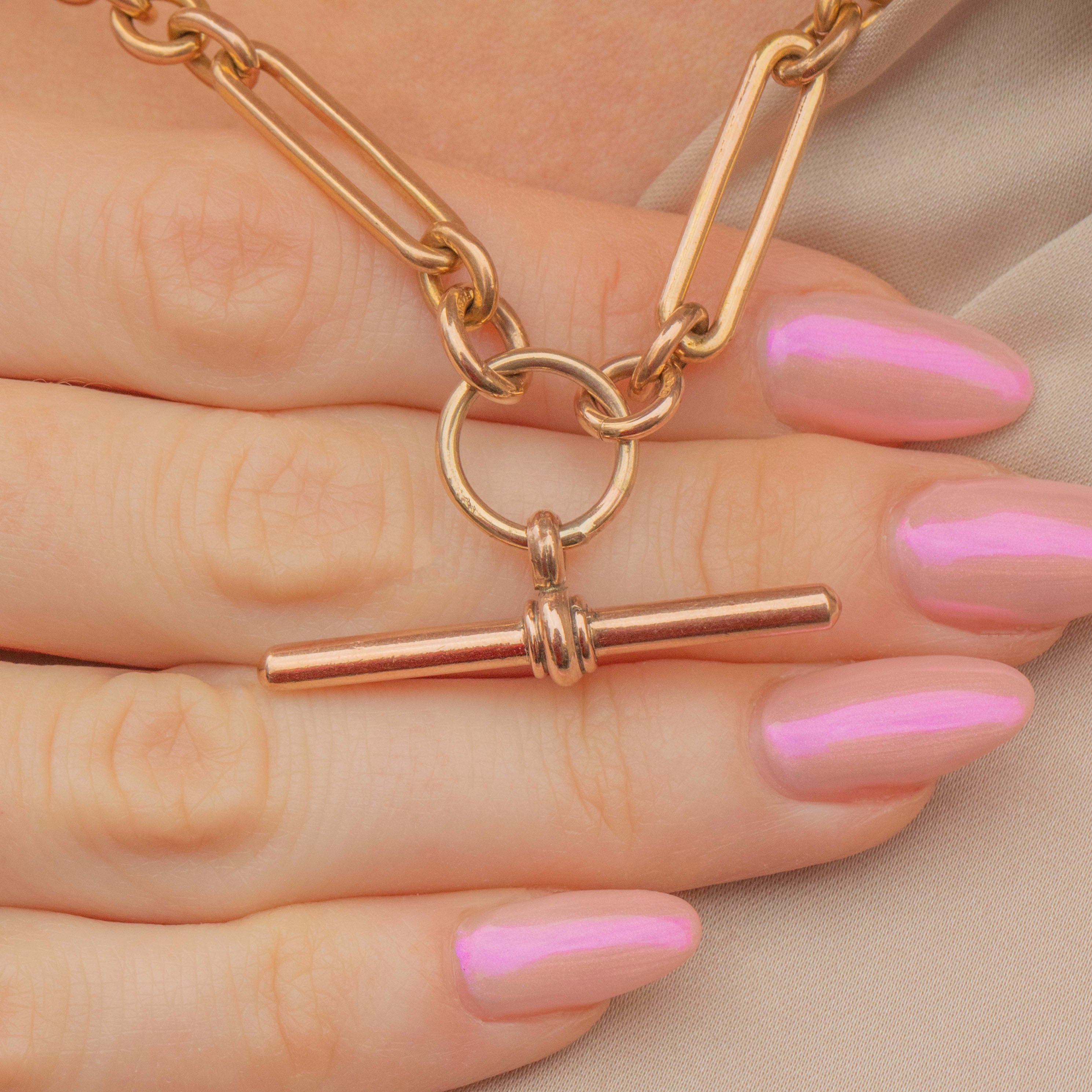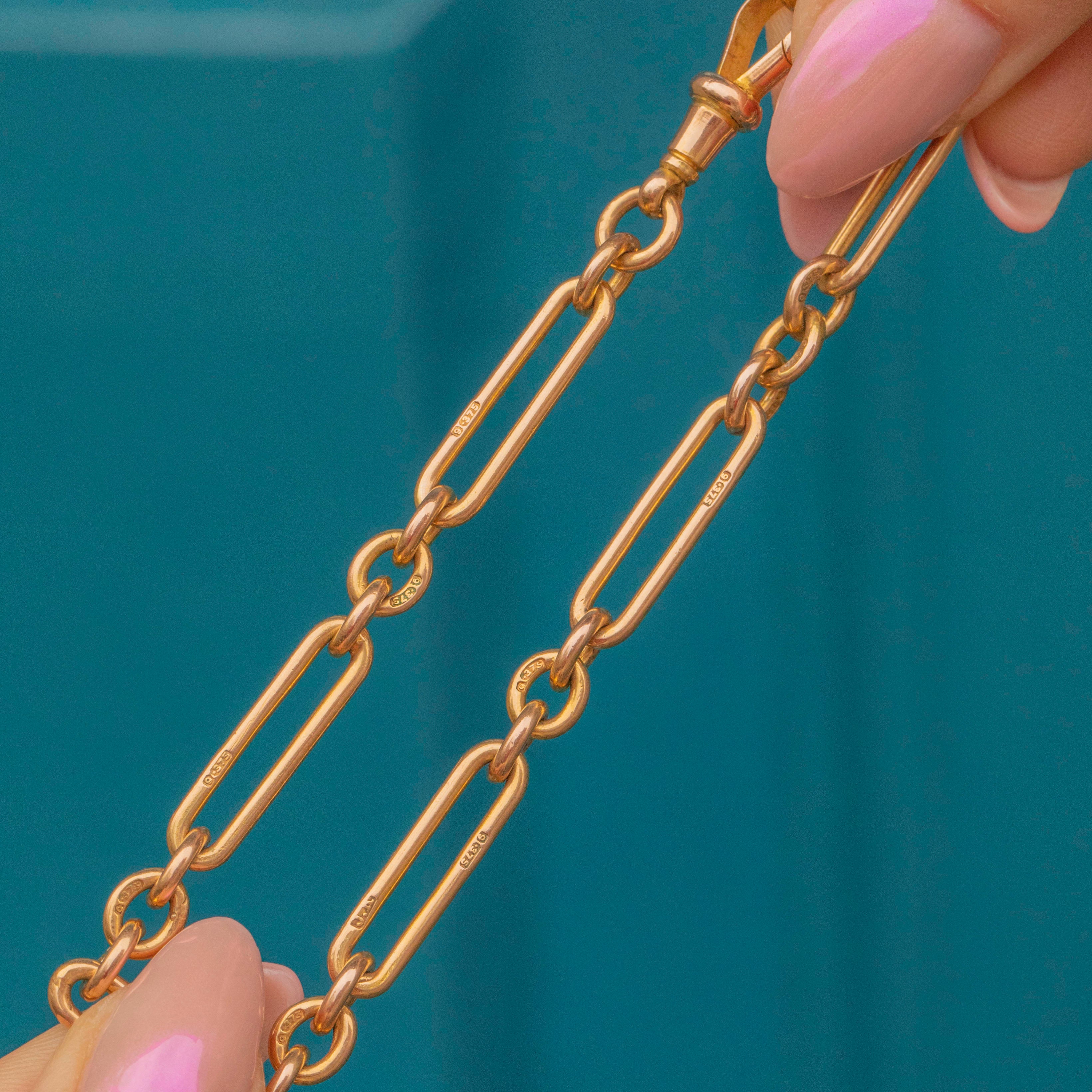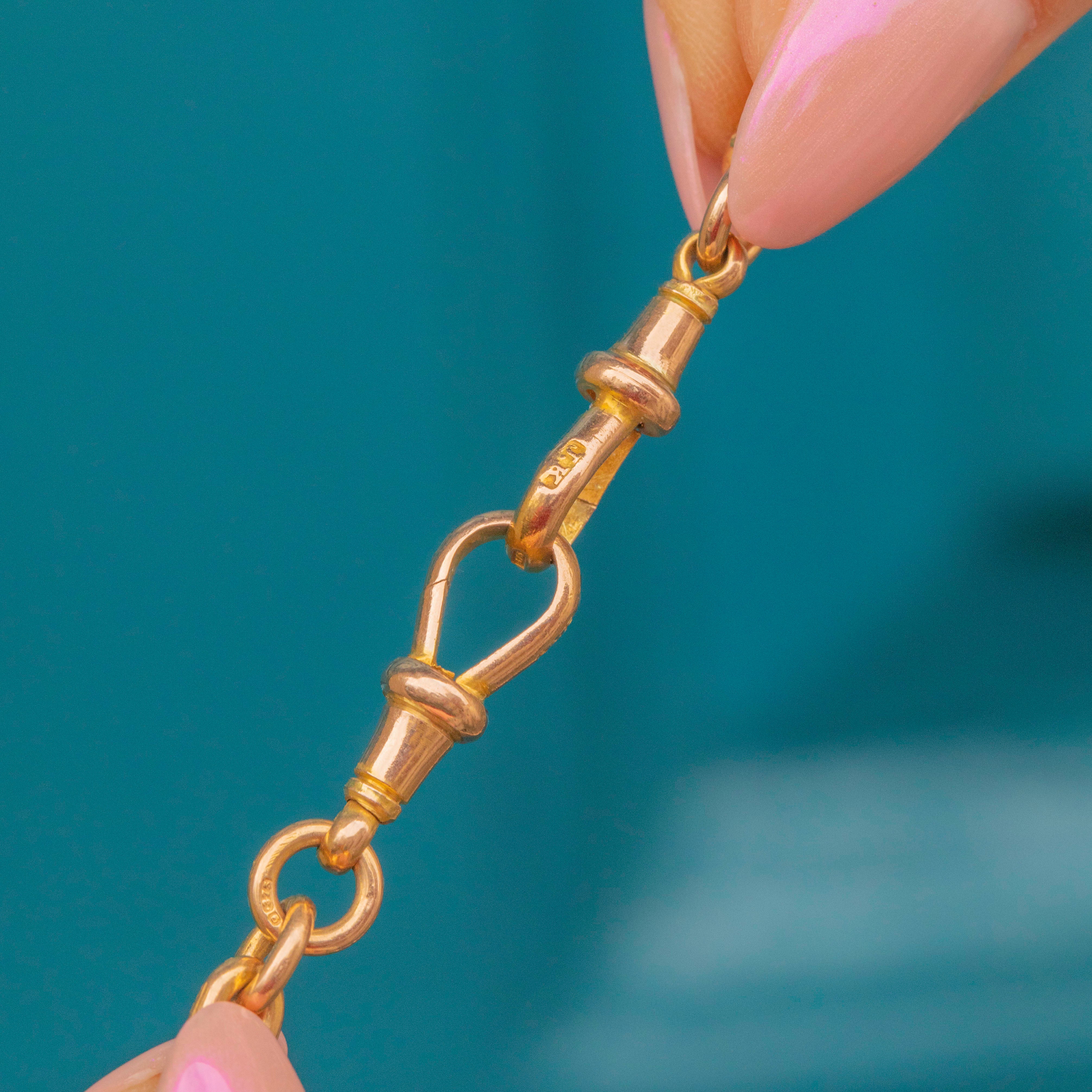 Every link on this antique Gold chain is stamped, and in true Victorian fashion, she boasts both a t-bar and two matching dog clips, all perfectly colour matched. This Victorian trombone chain is a true investment piece, and paired with her timeless and classic nature she will remain in your family for centuries to come!