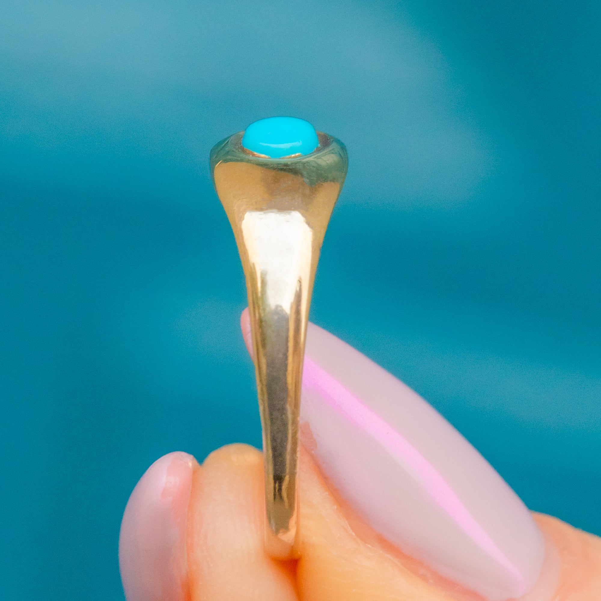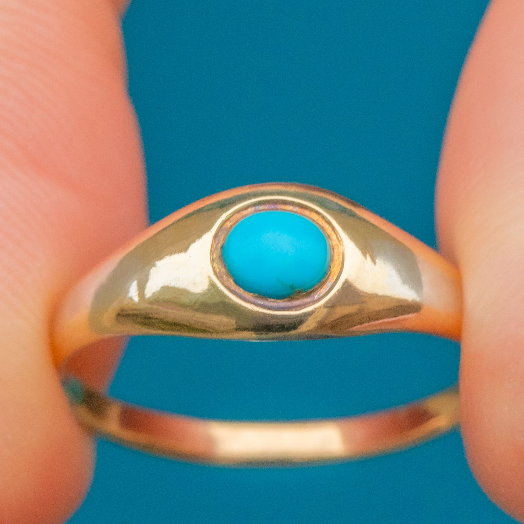 A charming antique 9ct Gold Turquoise solitaire ring featuring a single Turquoise cabochon set flush within a smooth 9ct Gold setting. The simple yet elegant design allows the vivid blue of the Turquoise to take centre stage, a lovely example of the understated beauty of early 19th-century jewellery.