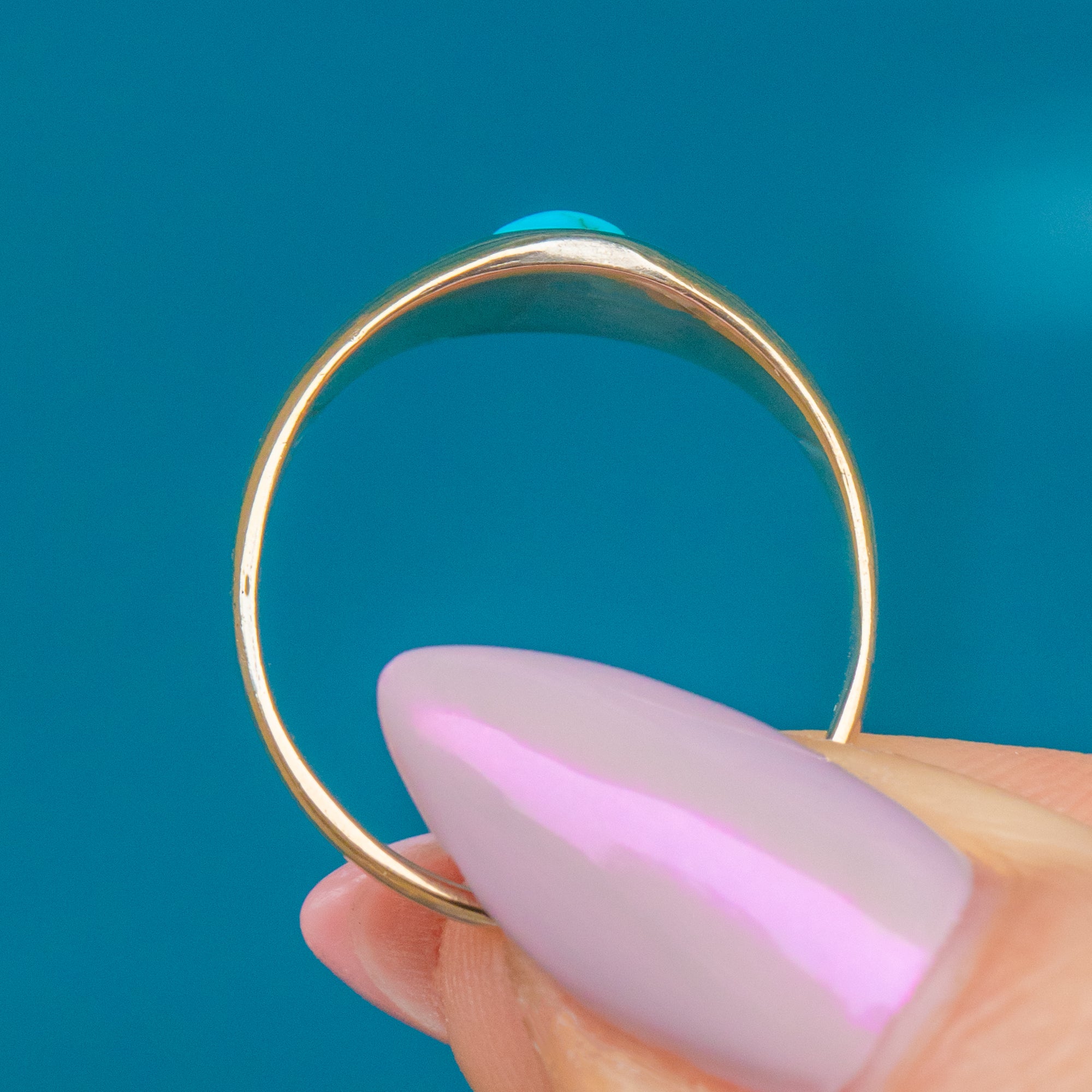 VERY GOOD: The Turquoise is securely set and retains its vibrant blue hue. Some of the original shoulder detailing has worn smooth over time, likely once engraved, but the Gold remains strong and comfortable to wear. A beautiful and authentic early Victorian ring with antique charm.