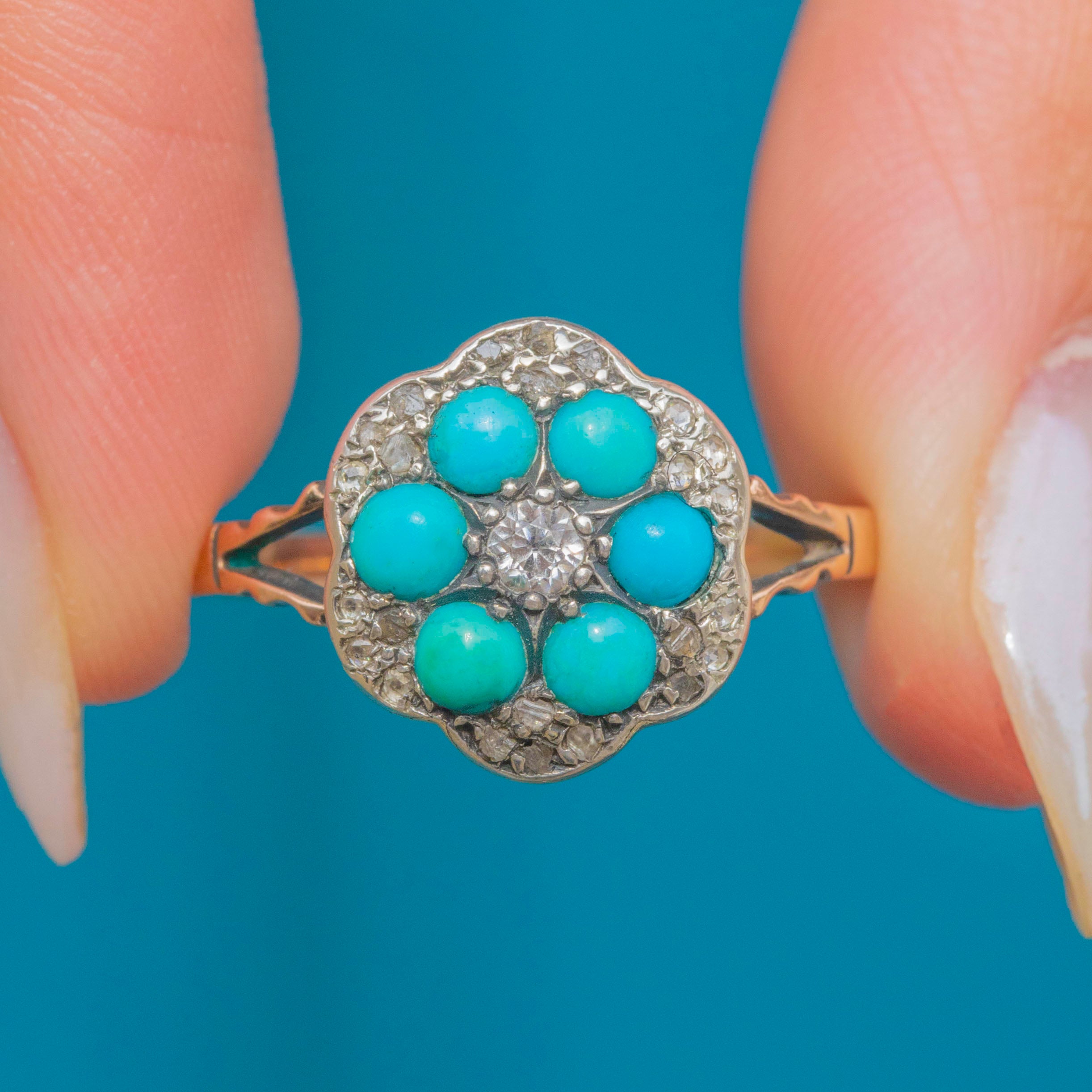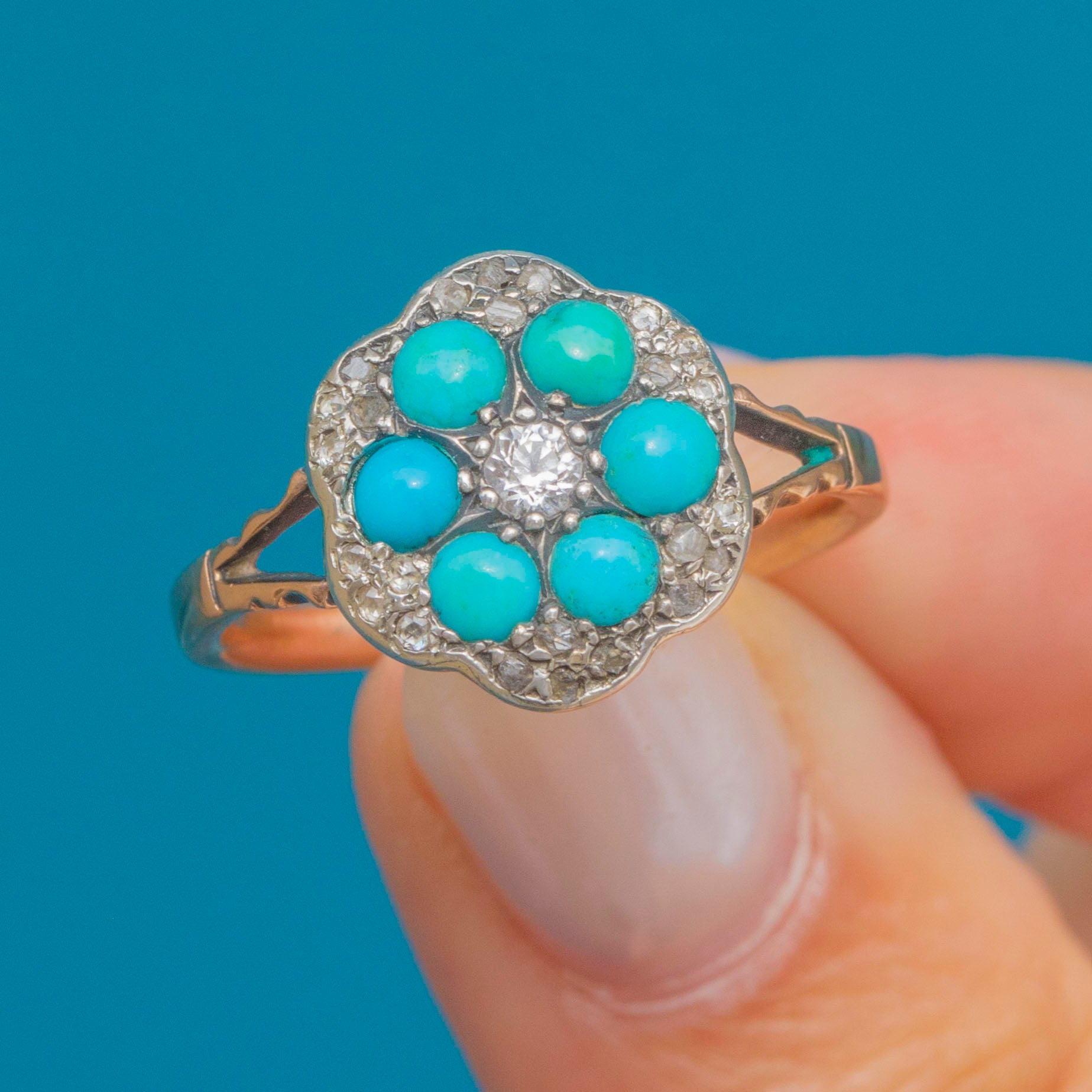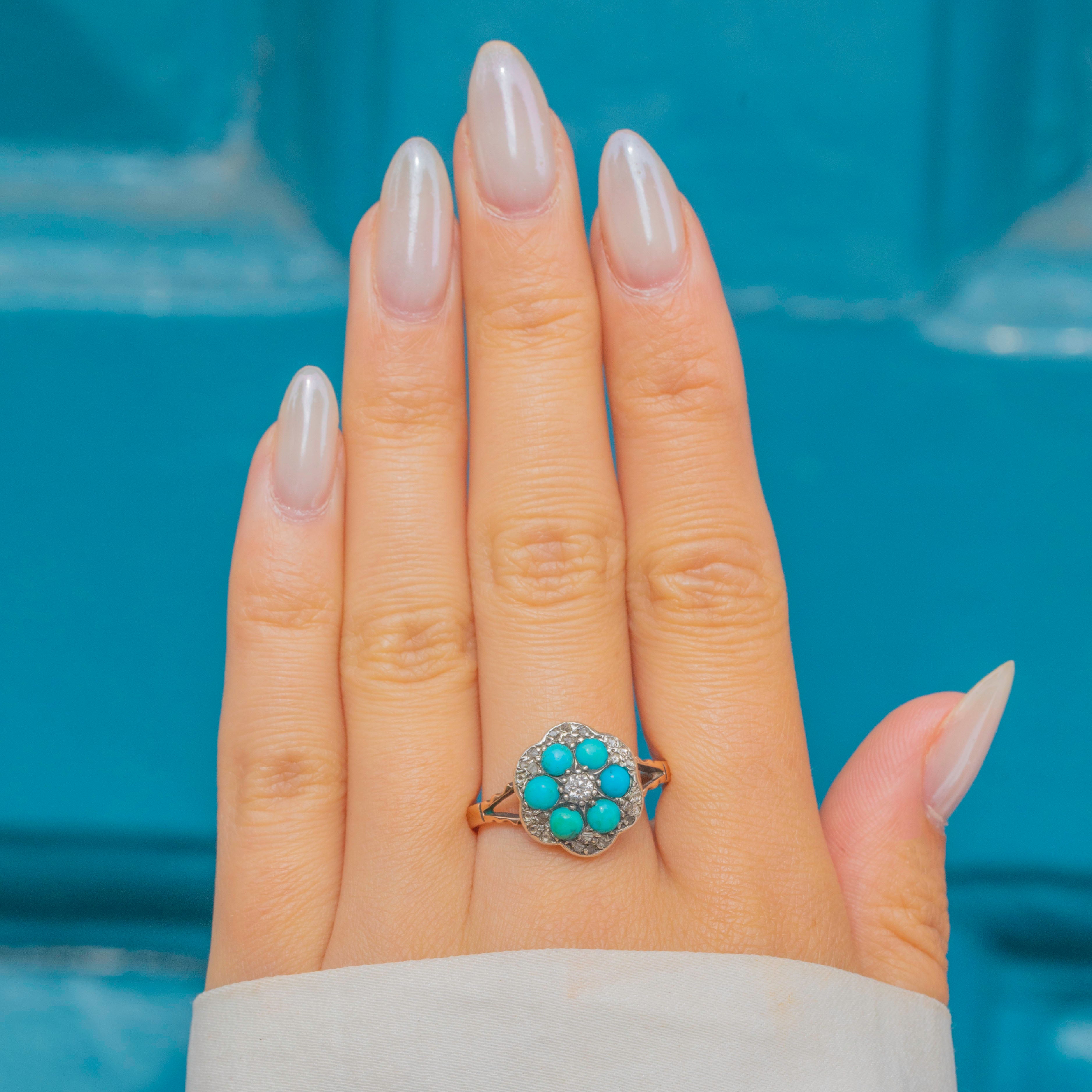Antique 9ct Gold Turquoise Diamond Flower Cluster Ring