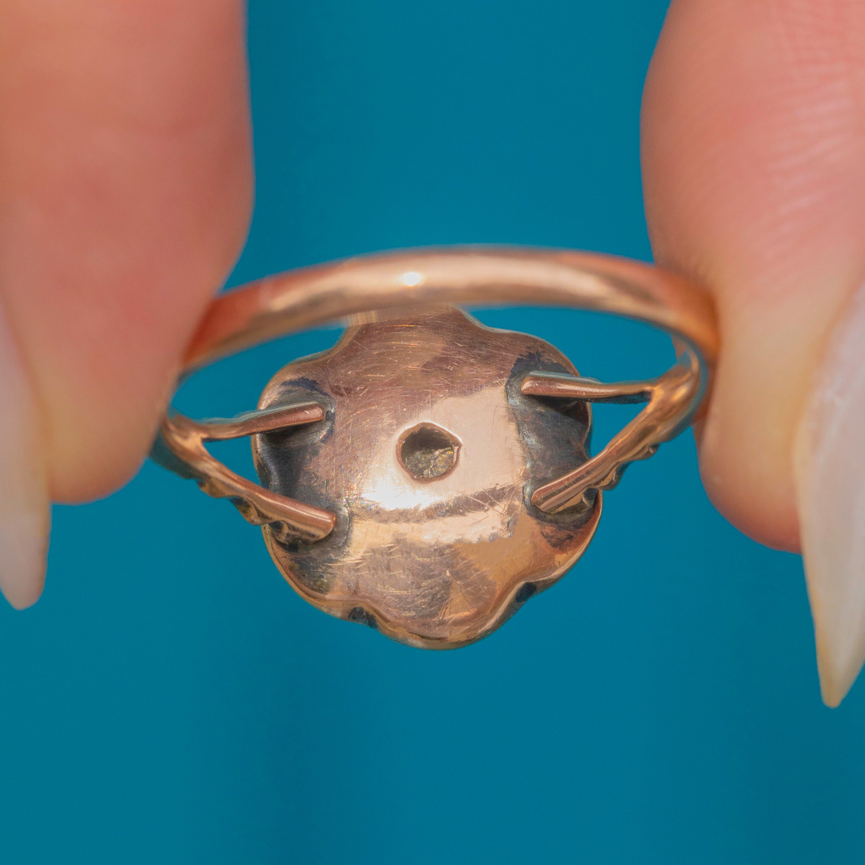 The gemstone flower cluster rests on a glossy 9ct Gold band and provides exceptional finger coverage. This antique cluster ring is sure to make a statement in your collection.