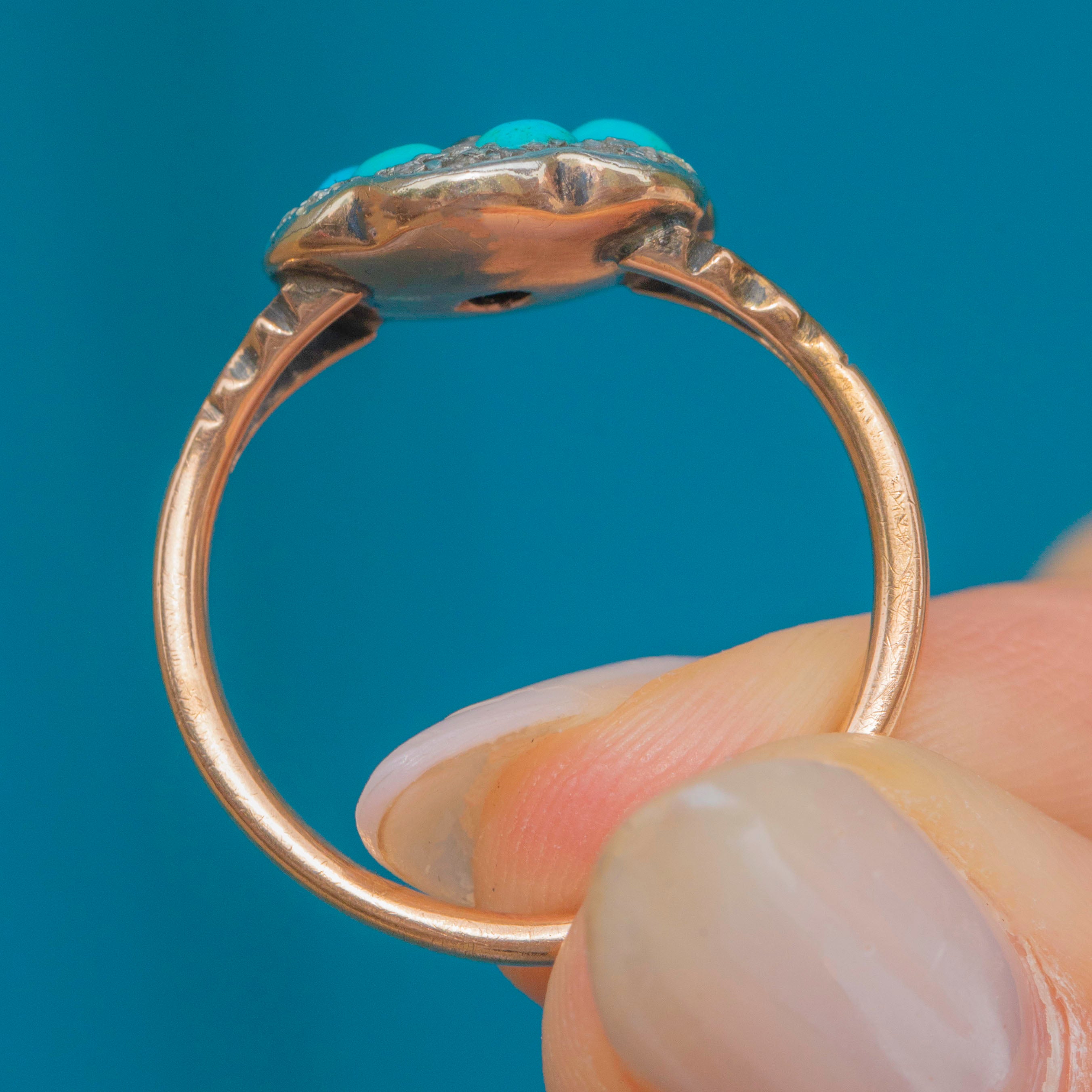 VERY GOOD-EXCELLENT: Each gemstone is radiant and set securely within its setting. There are some signs of mild surface wear to the Gold and Turquoise stones, though this is to be expected with age. With a smooth and glossy band, this Victorian ring provides comfortable and confident wear.